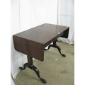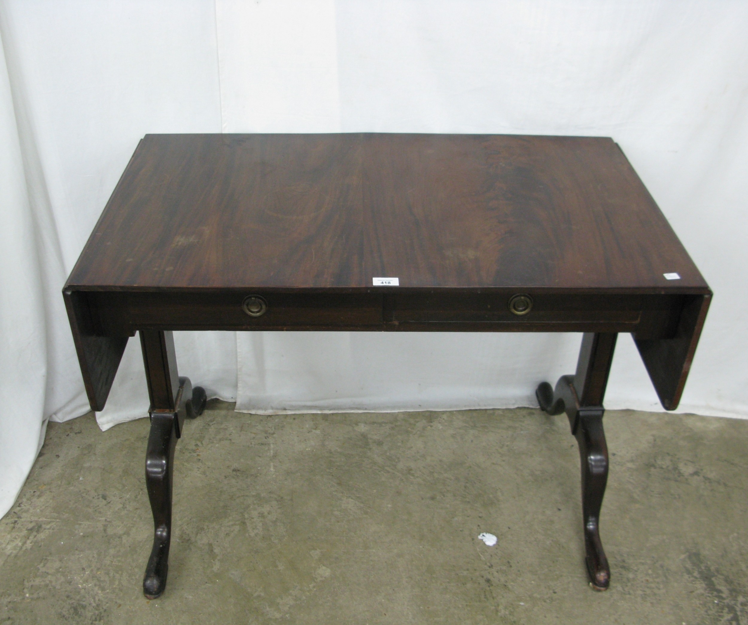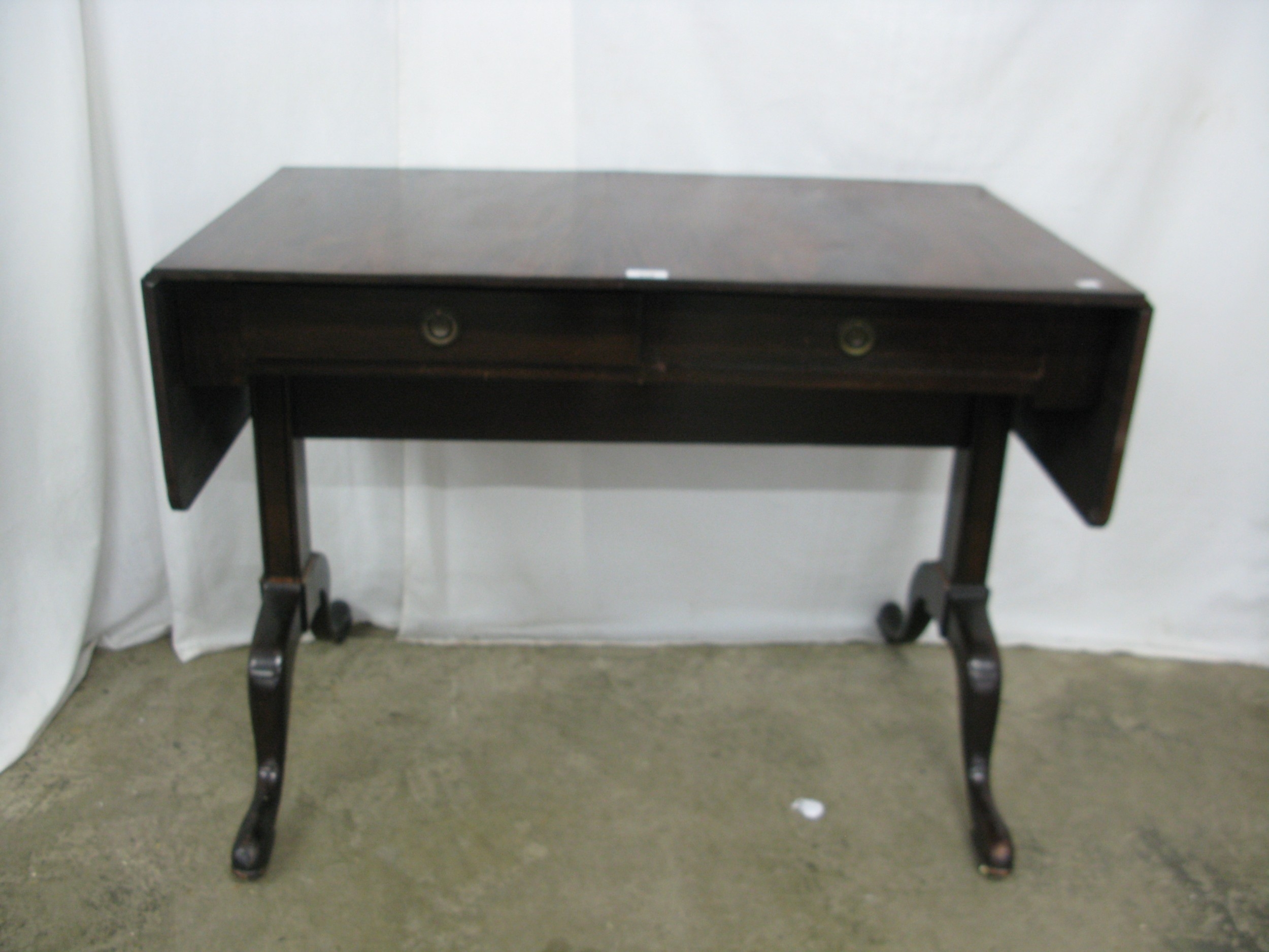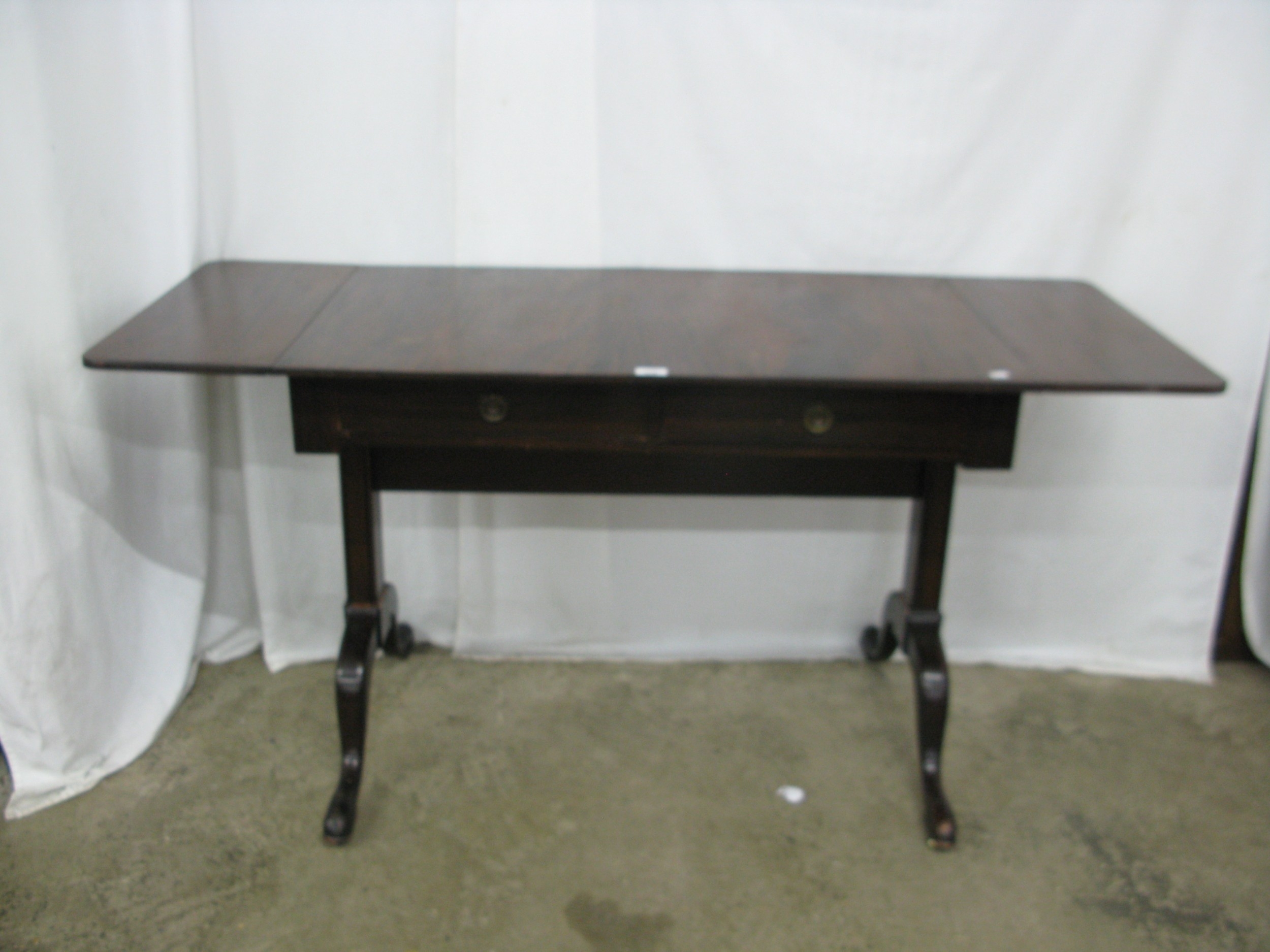 Mahogany sofa table, the rectangular top with drop flap to each side having rounded corners over two drawers with brass hoop handles, standing on swept feet ending in castors - 150cm x 50cm x 73cm tall (open) (signs of old woodworm and marks to top)