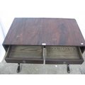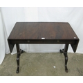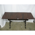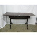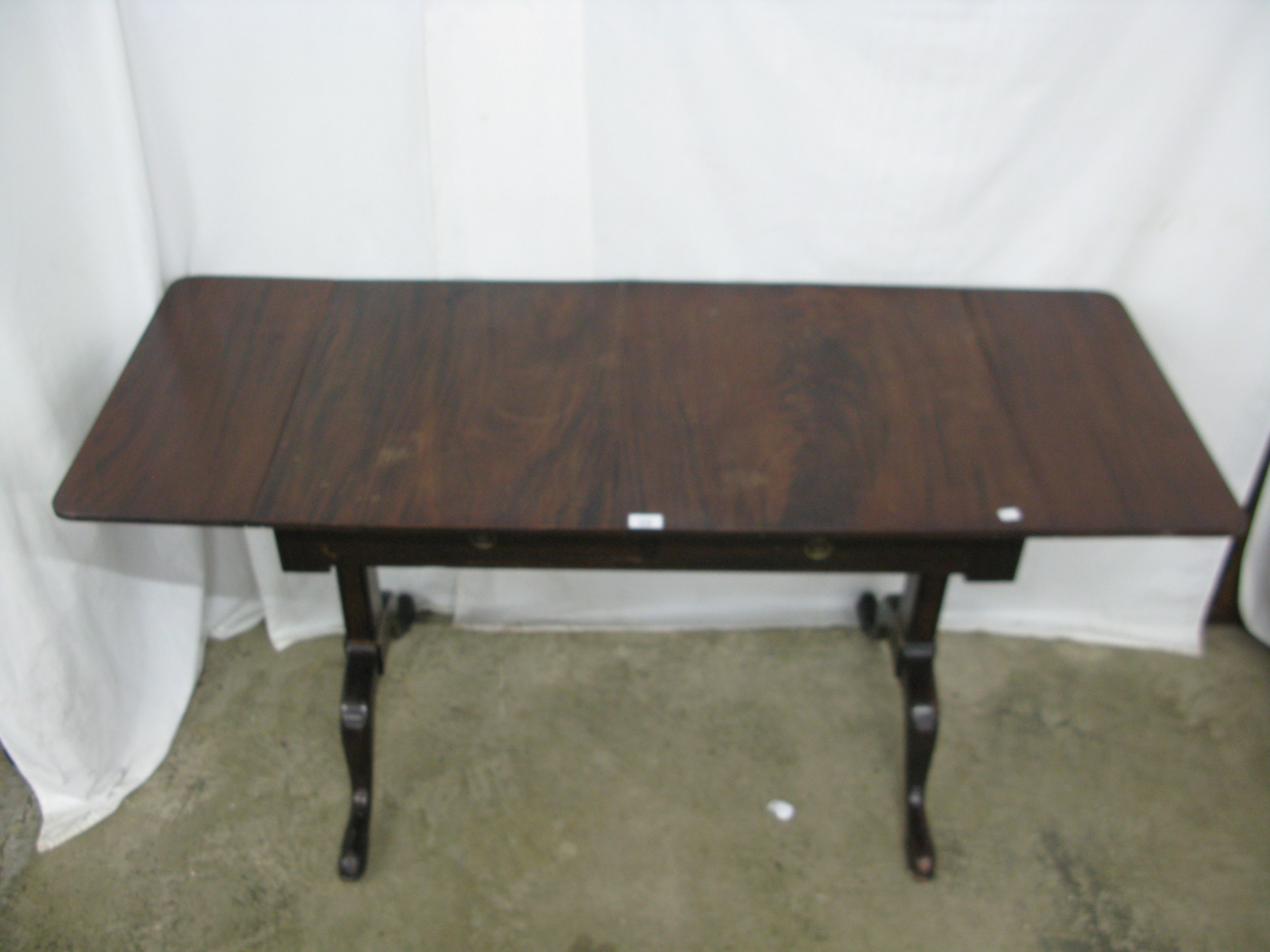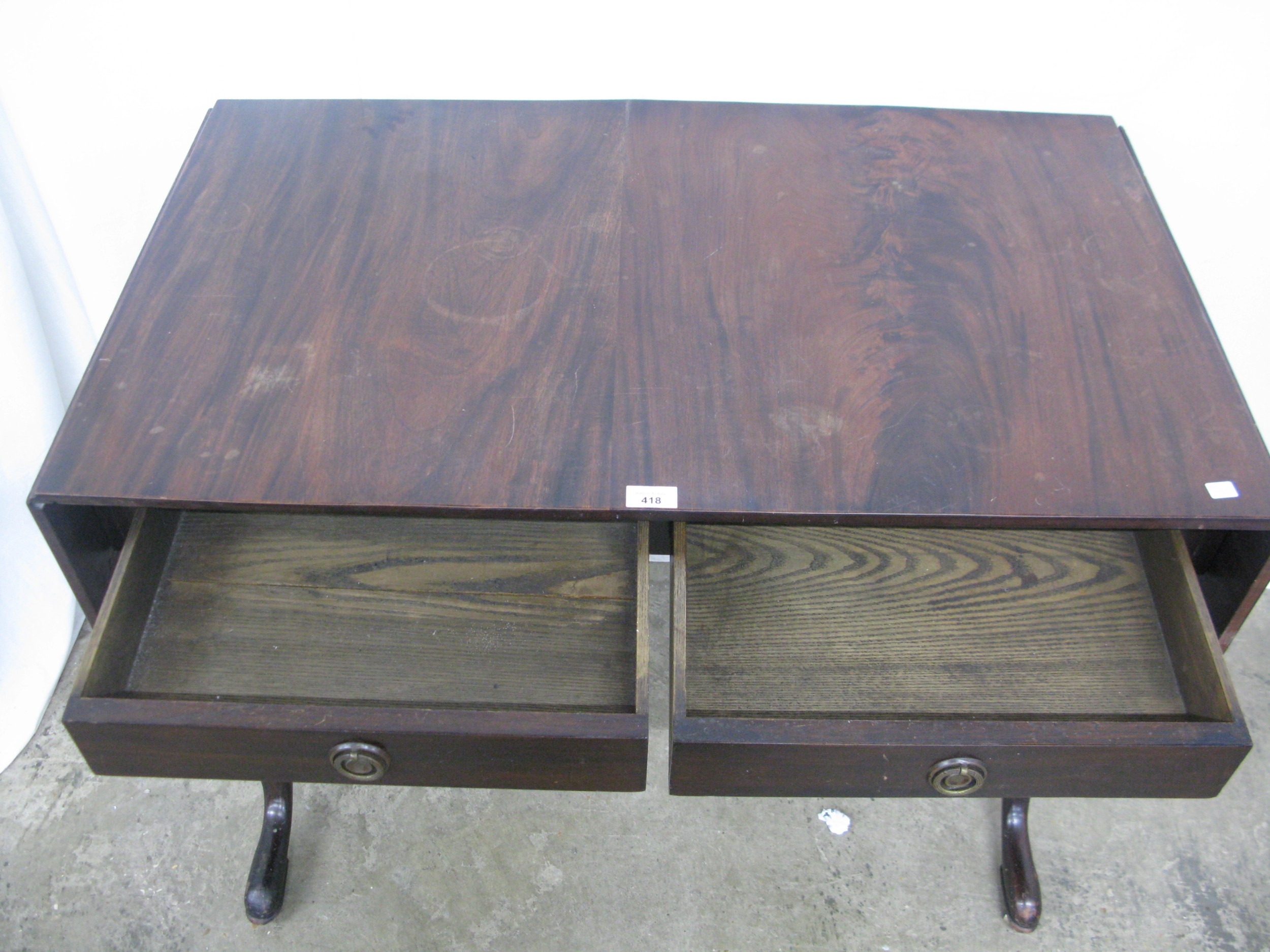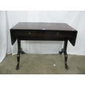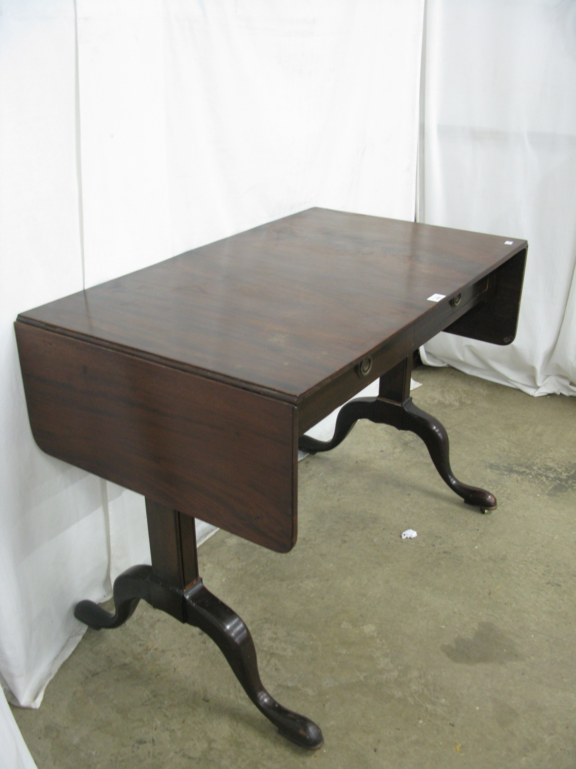 Mahogany sofa table, the rectangular top with drop flap to each side having rounded corners over two drawers with brass hoop handles, standing on swept feet ending in castors - 150cm x 50cm x 73cm tall (open) (signs of old woodworm and marks to top)