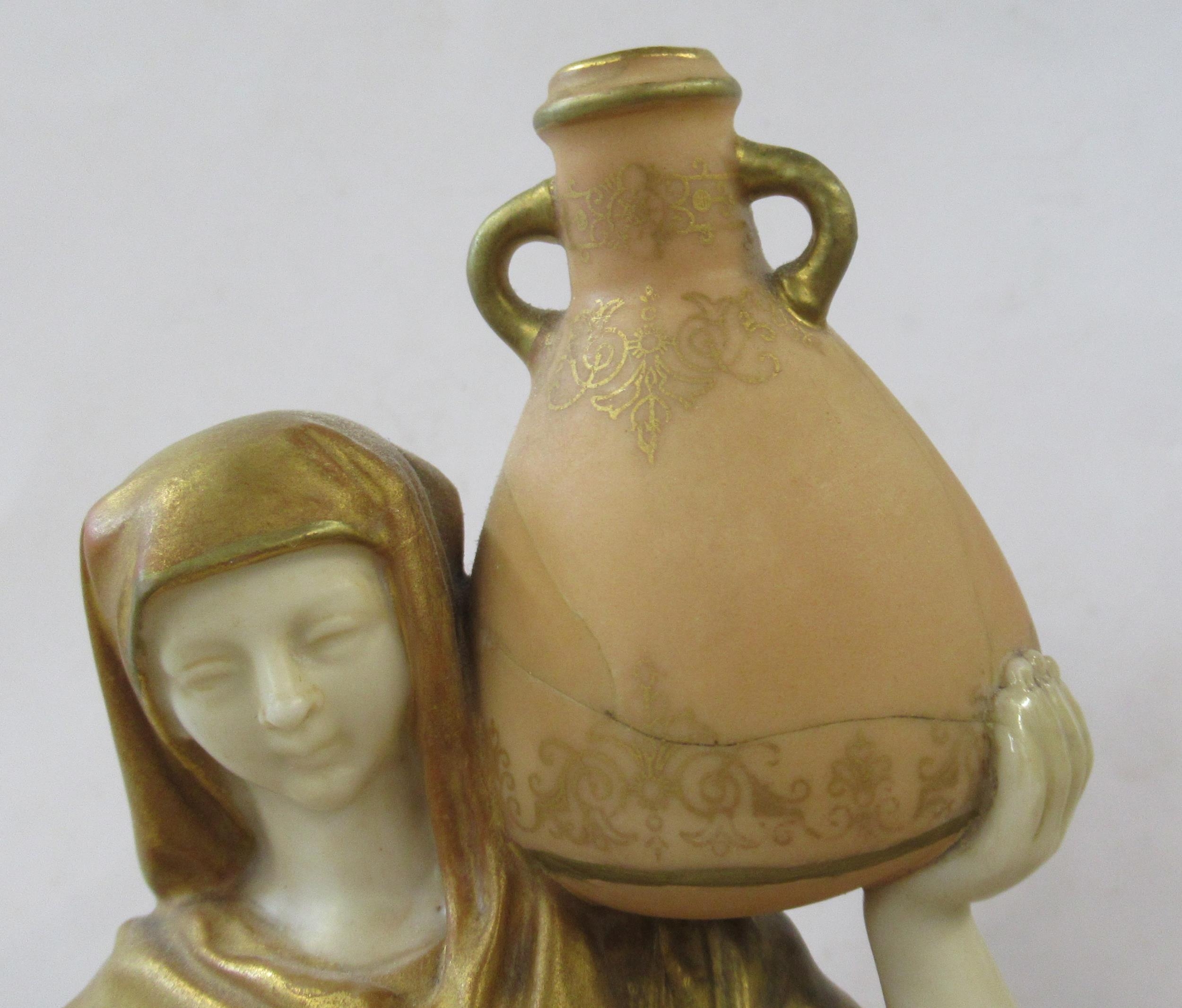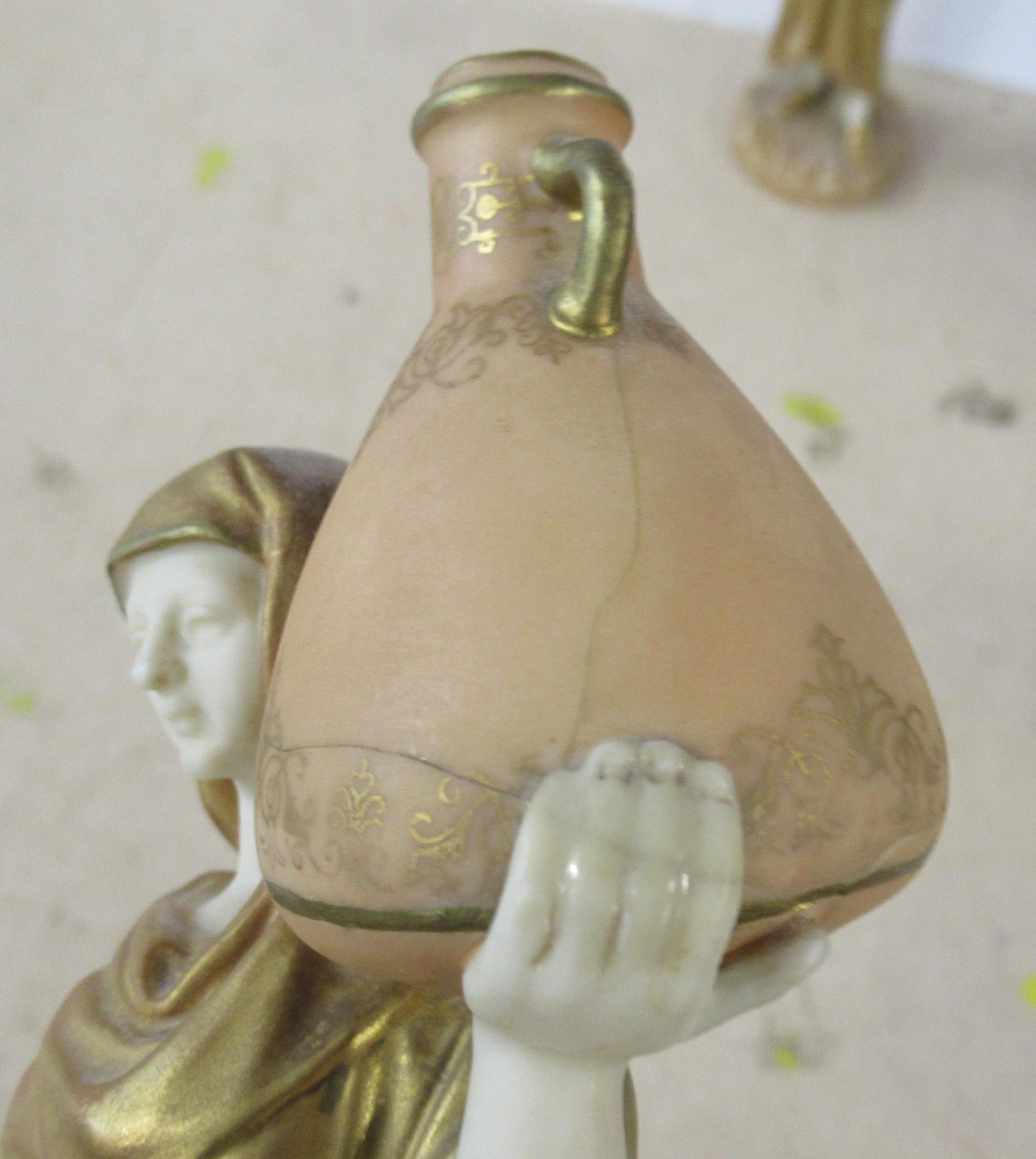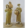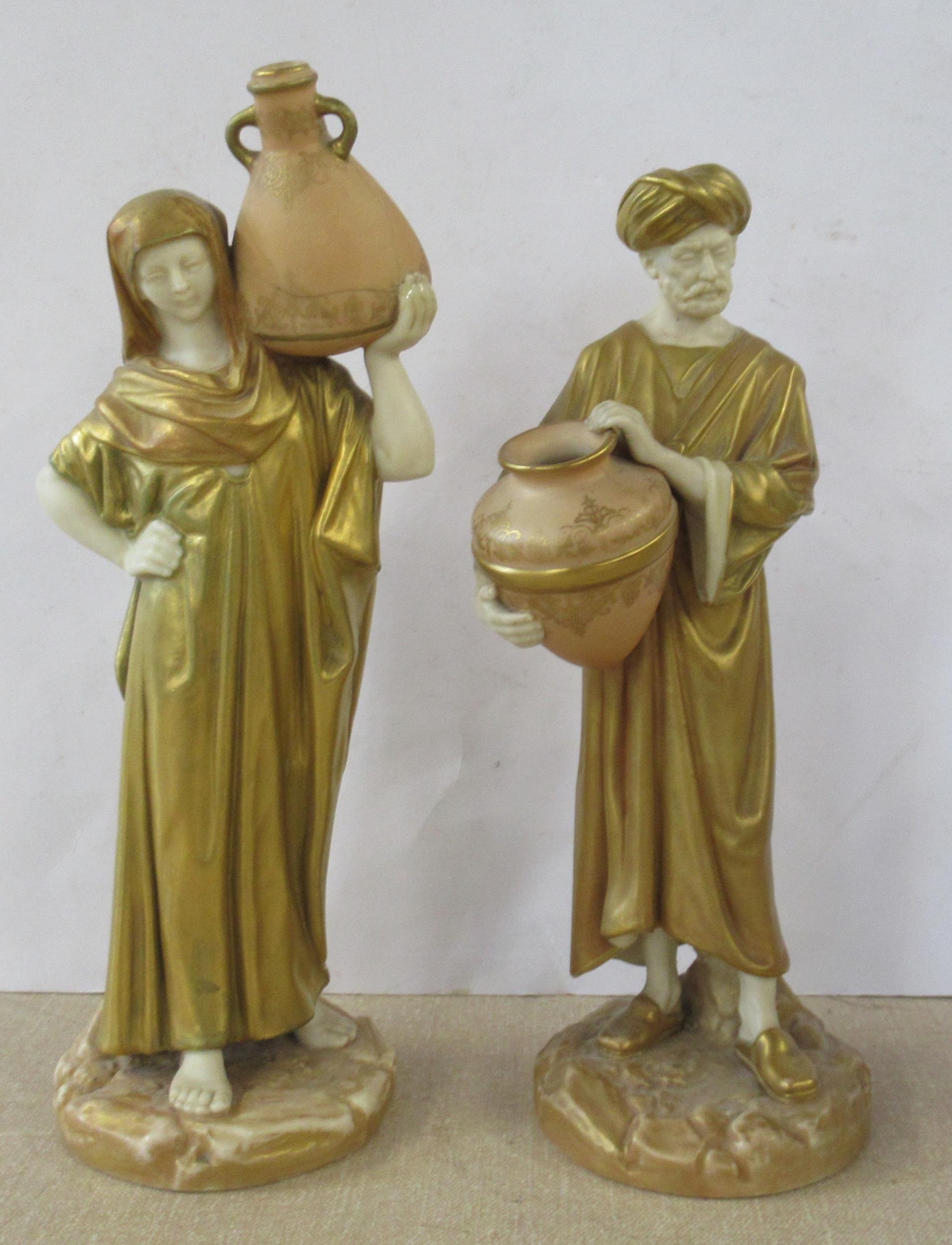 A pair of Royal Worcester shot silk figures, male and female water carriers, model number 1250, height 10ins