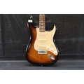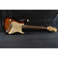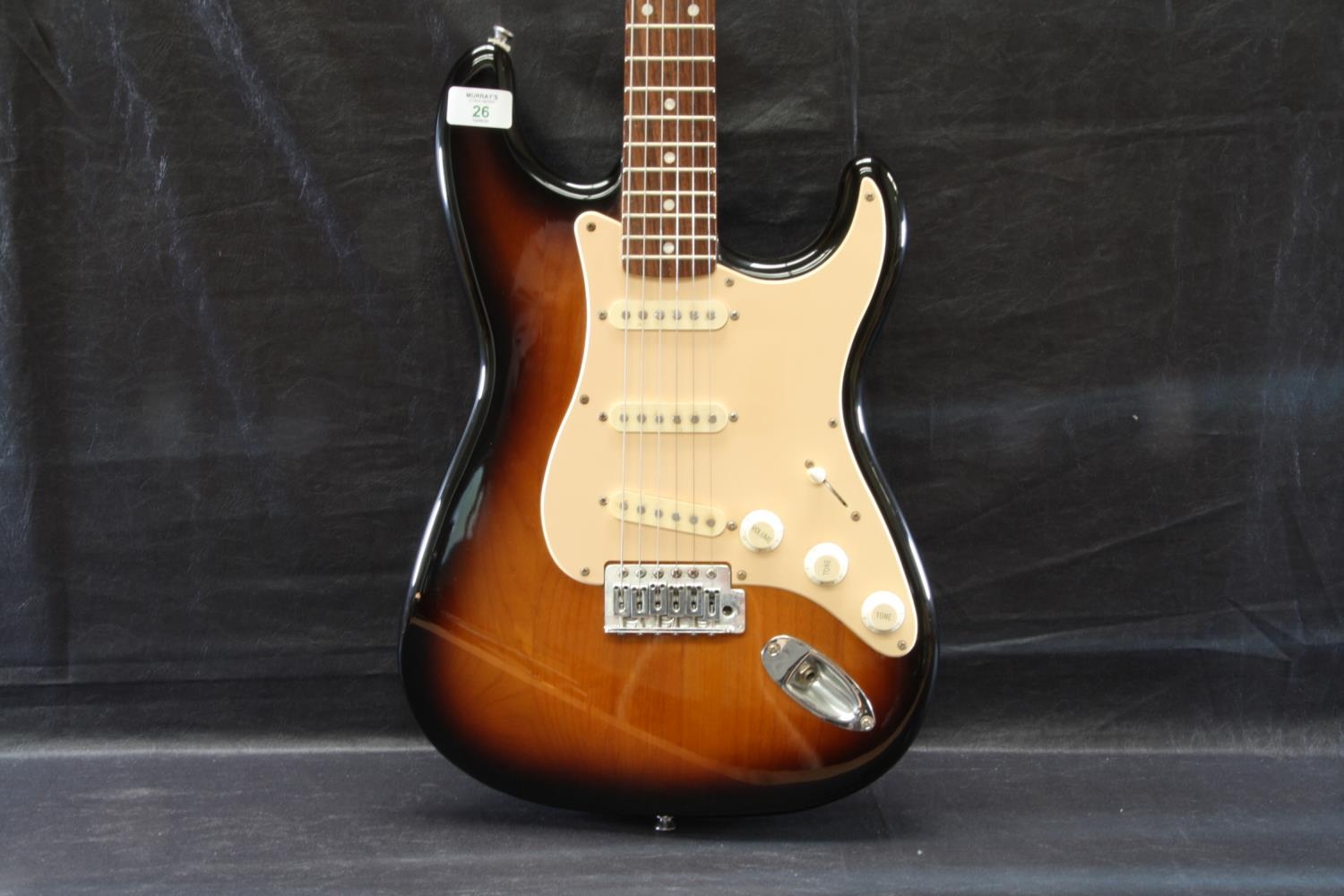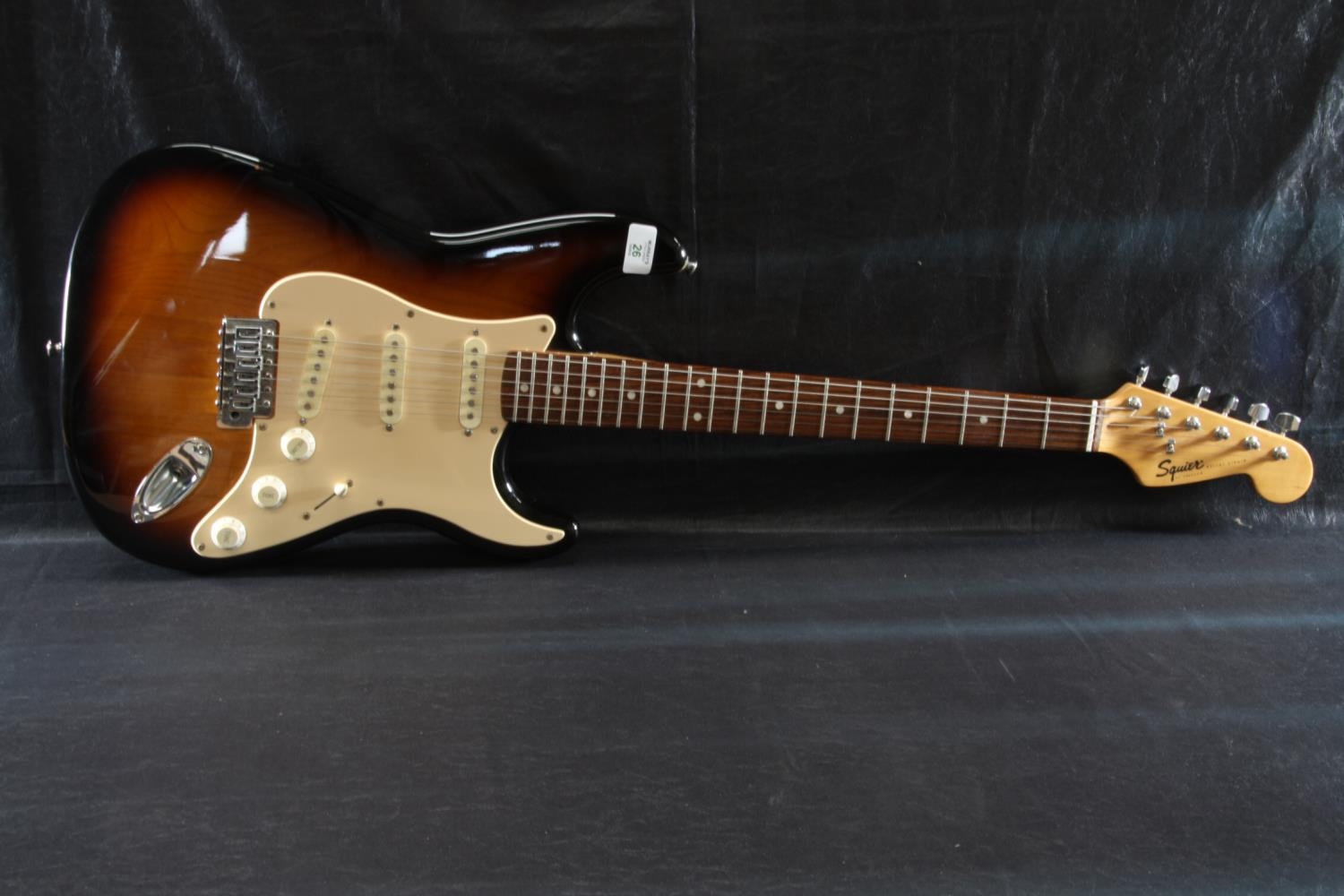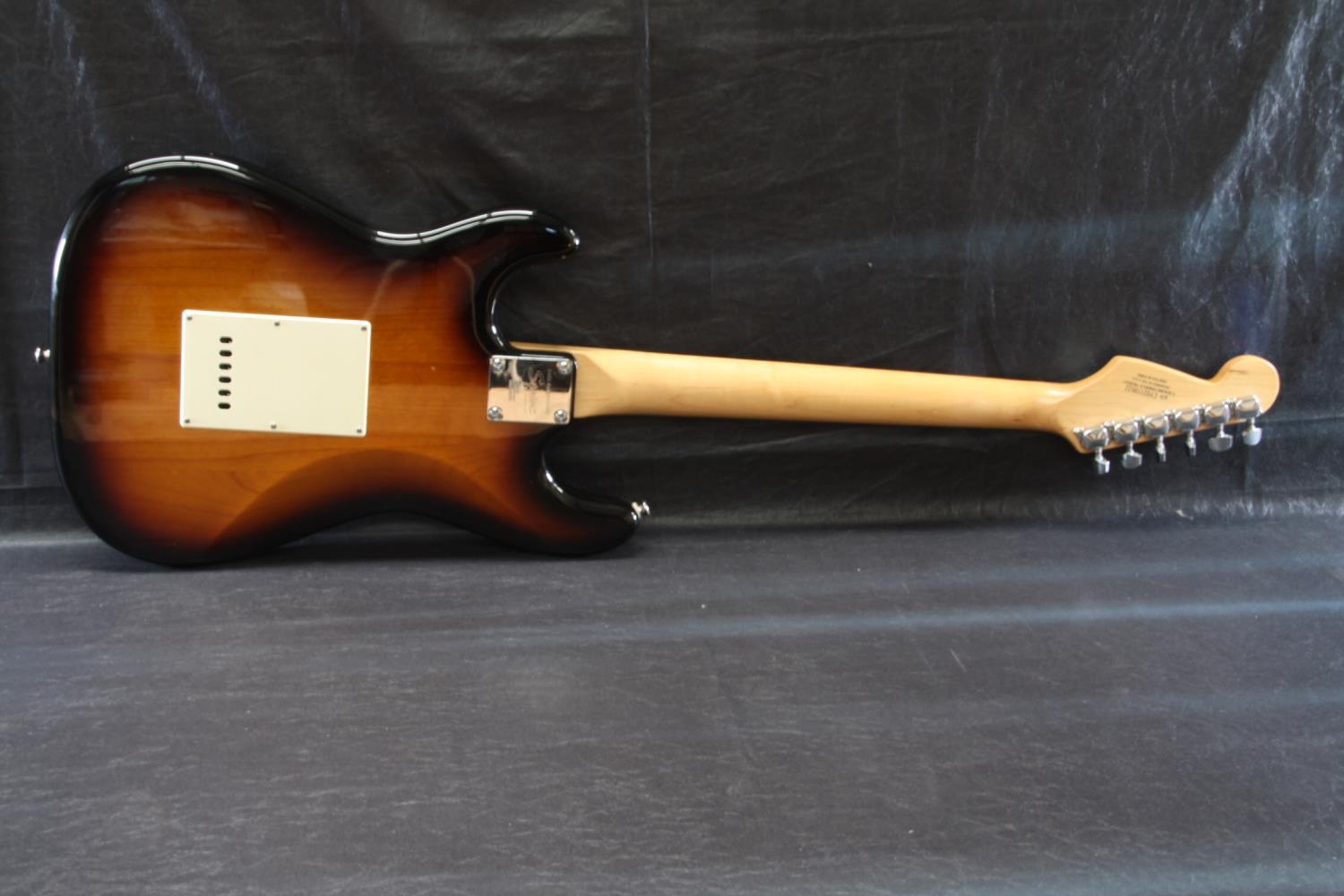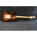 Fender Squire Bullet Stratocaster 20th Anniversary - sunburst, cream pickguard, three single coil pickups, five way switch, one volume two tone pots, whammy bridge (no bar) and mother of pearl dot inlays