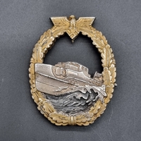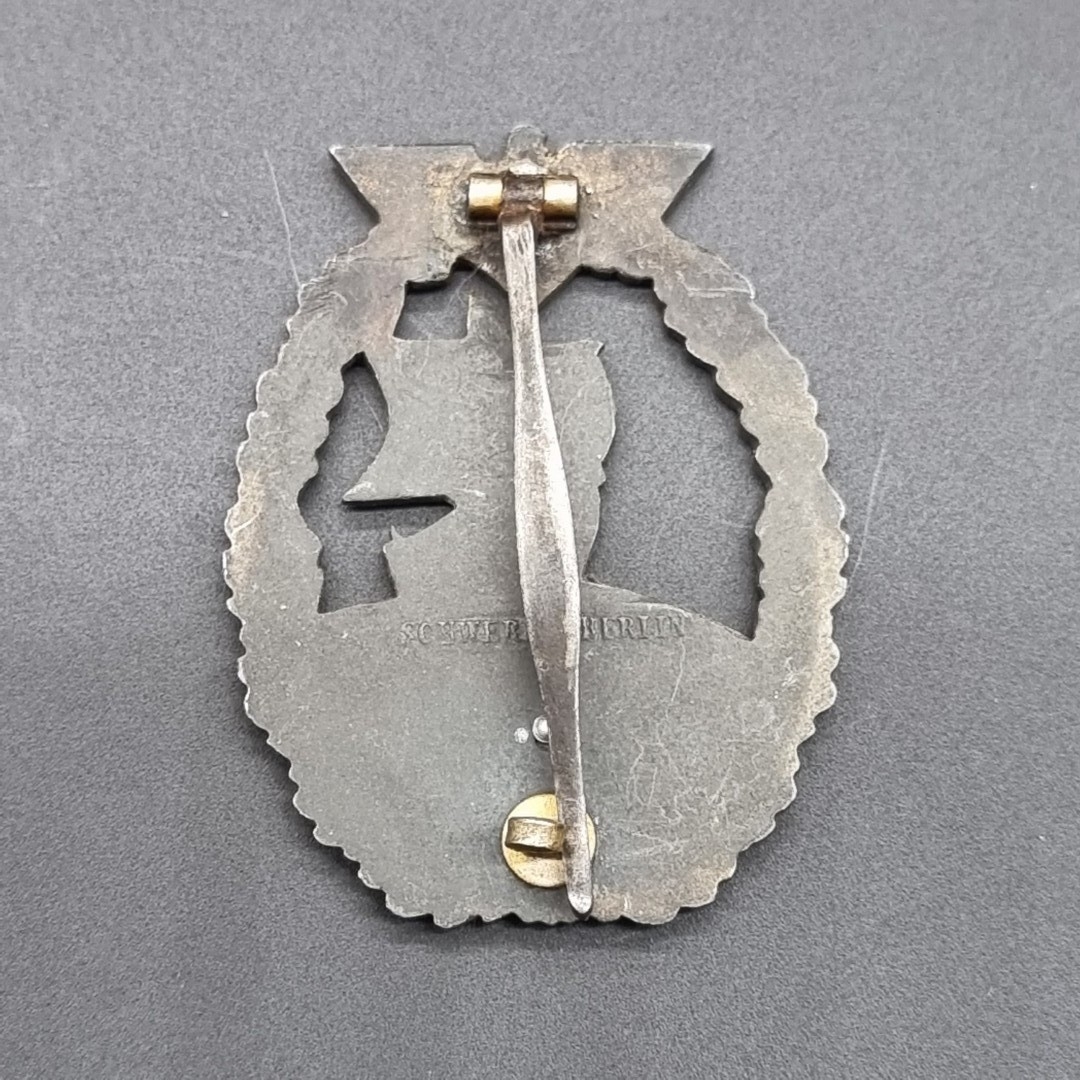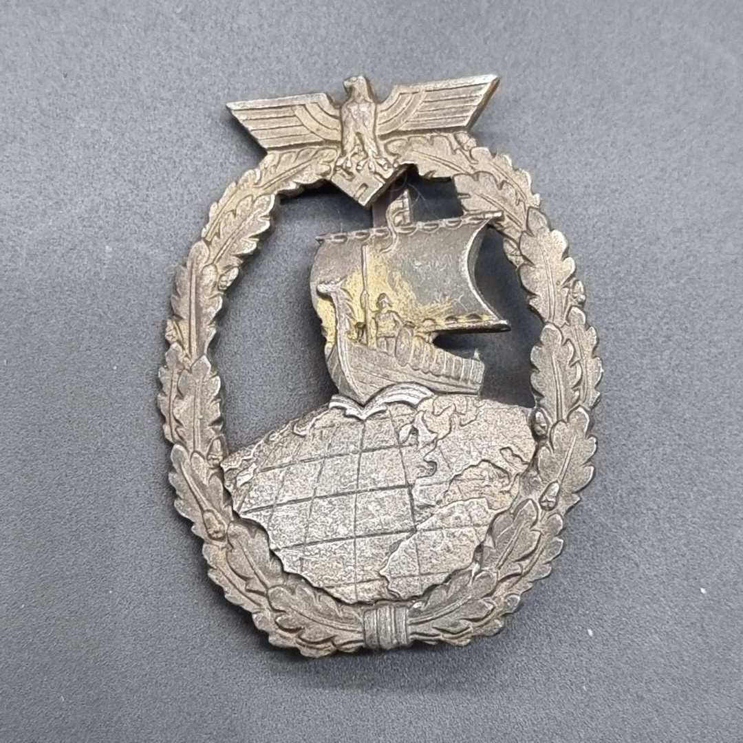 A WWII German Kriegsmarine Auxiliary Cruiser badge, by Schwerin Berlin, approx 55mm high.