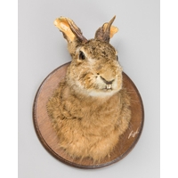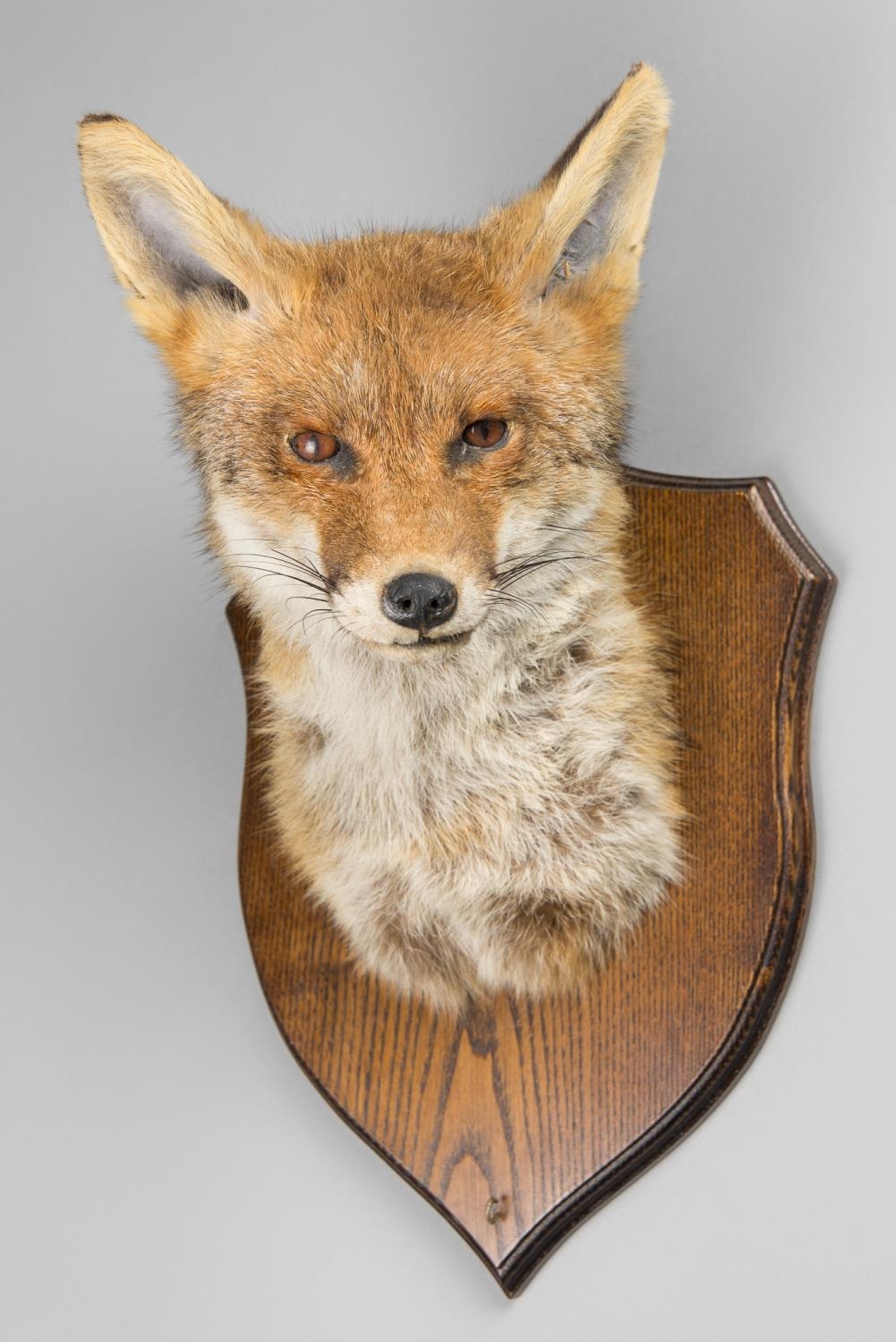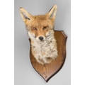 A LATE 20TH CENTURY TAXIDERMY FOX MASK UPON OAK SHIELD.