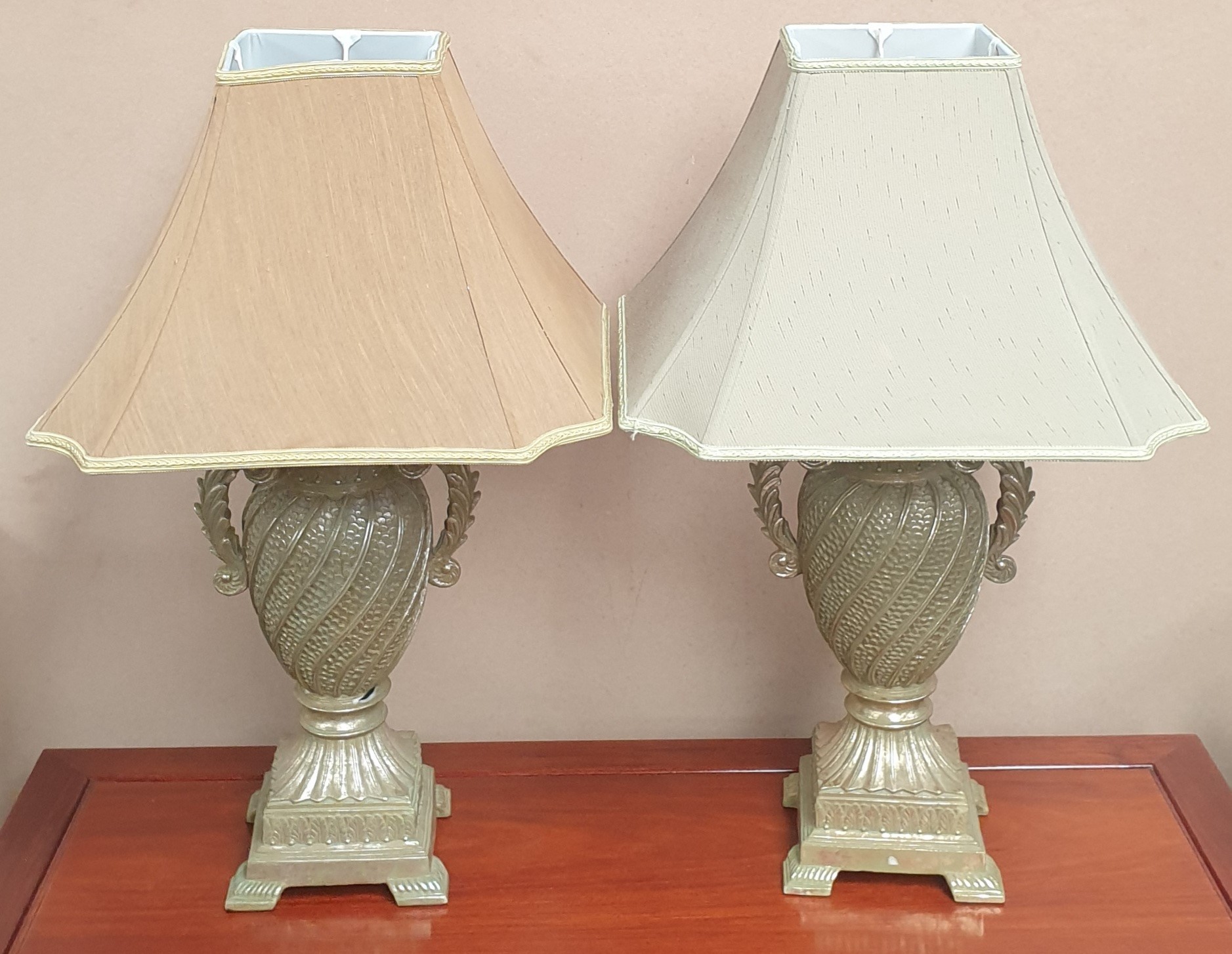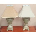 Pair of Ornate Table Lamps and Shades, Height 72cm (tonal difference to shades, damage to one base)