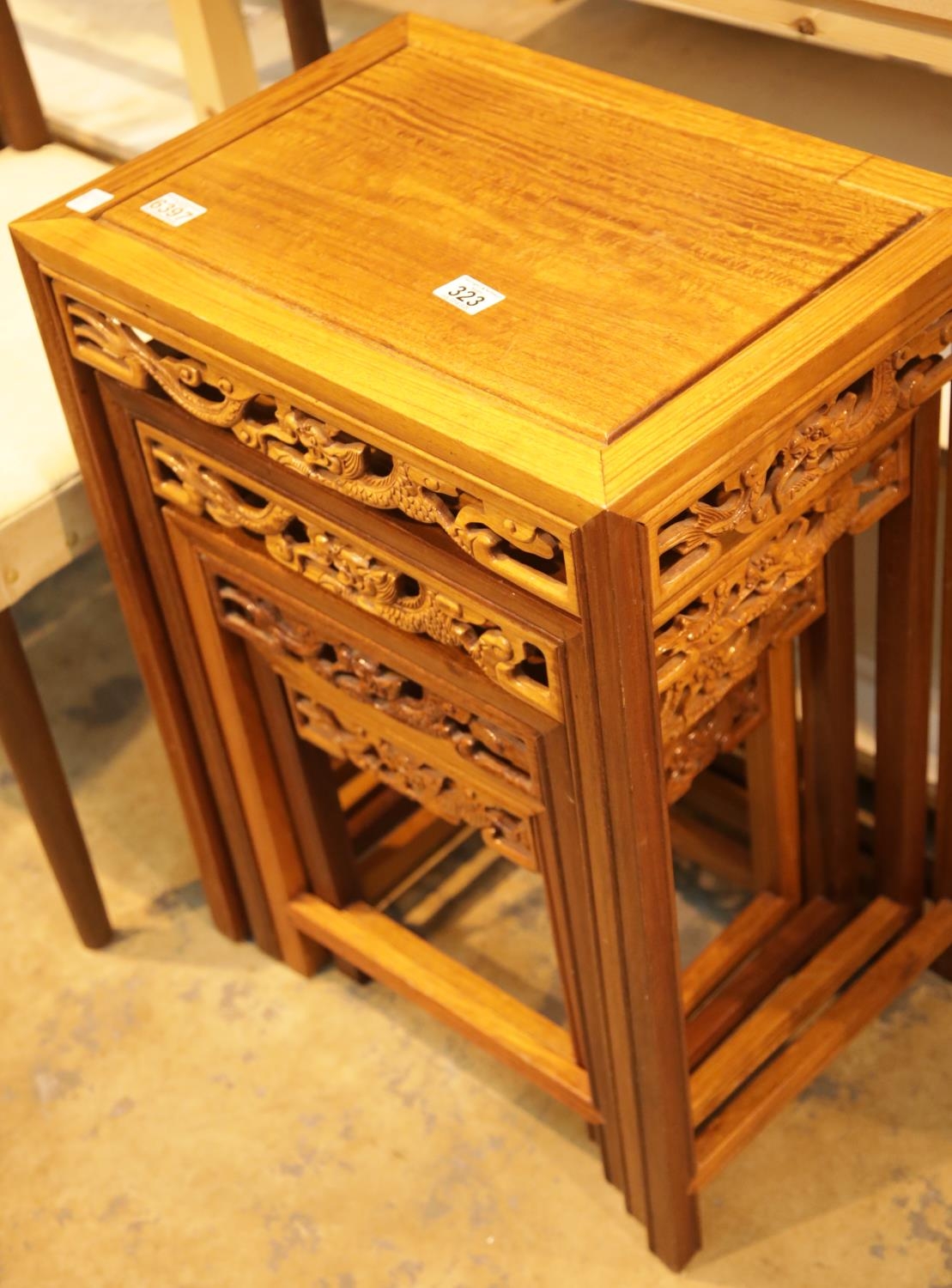 Nest of four side tables with Oriental dragons to the side. This lot is not available for in-house P&P.