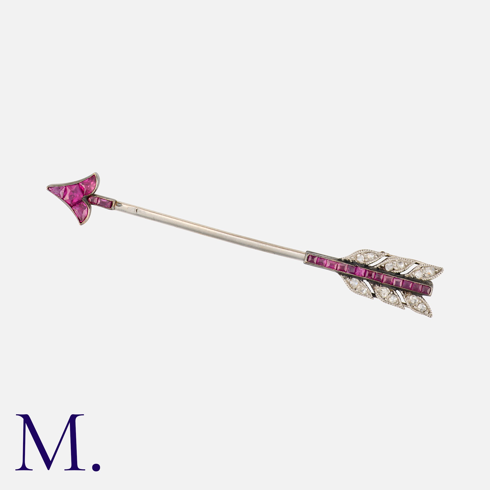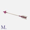 CARTIER. An Art Deco Ruby and Diamond Arrow Brooch in platinum, set with calibrated rubies and rose cut diamonds. Signed Cartier and serial numbered. French mark for platinum