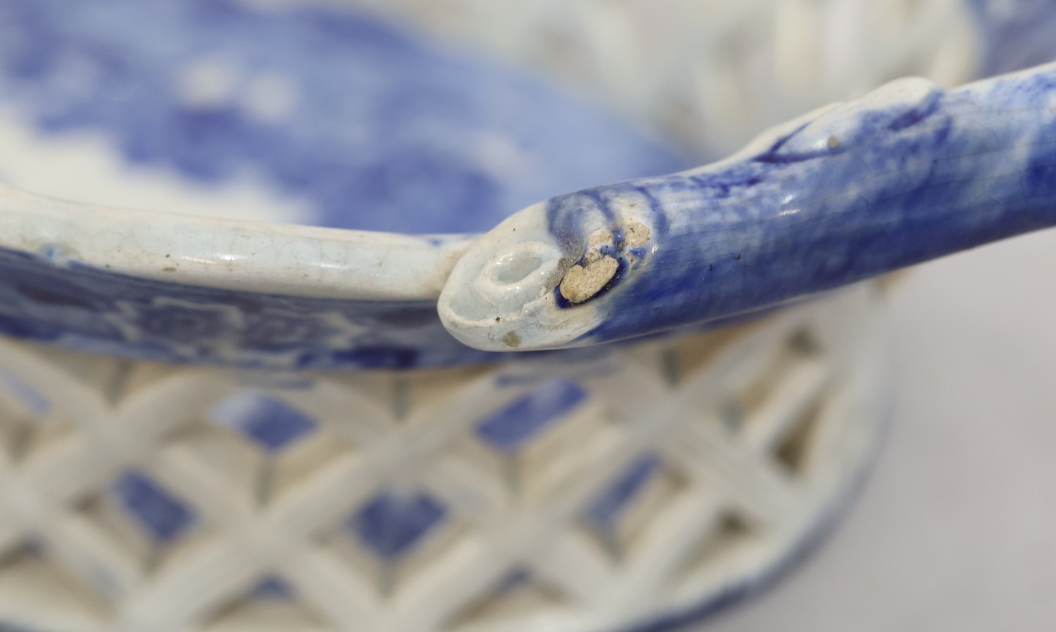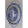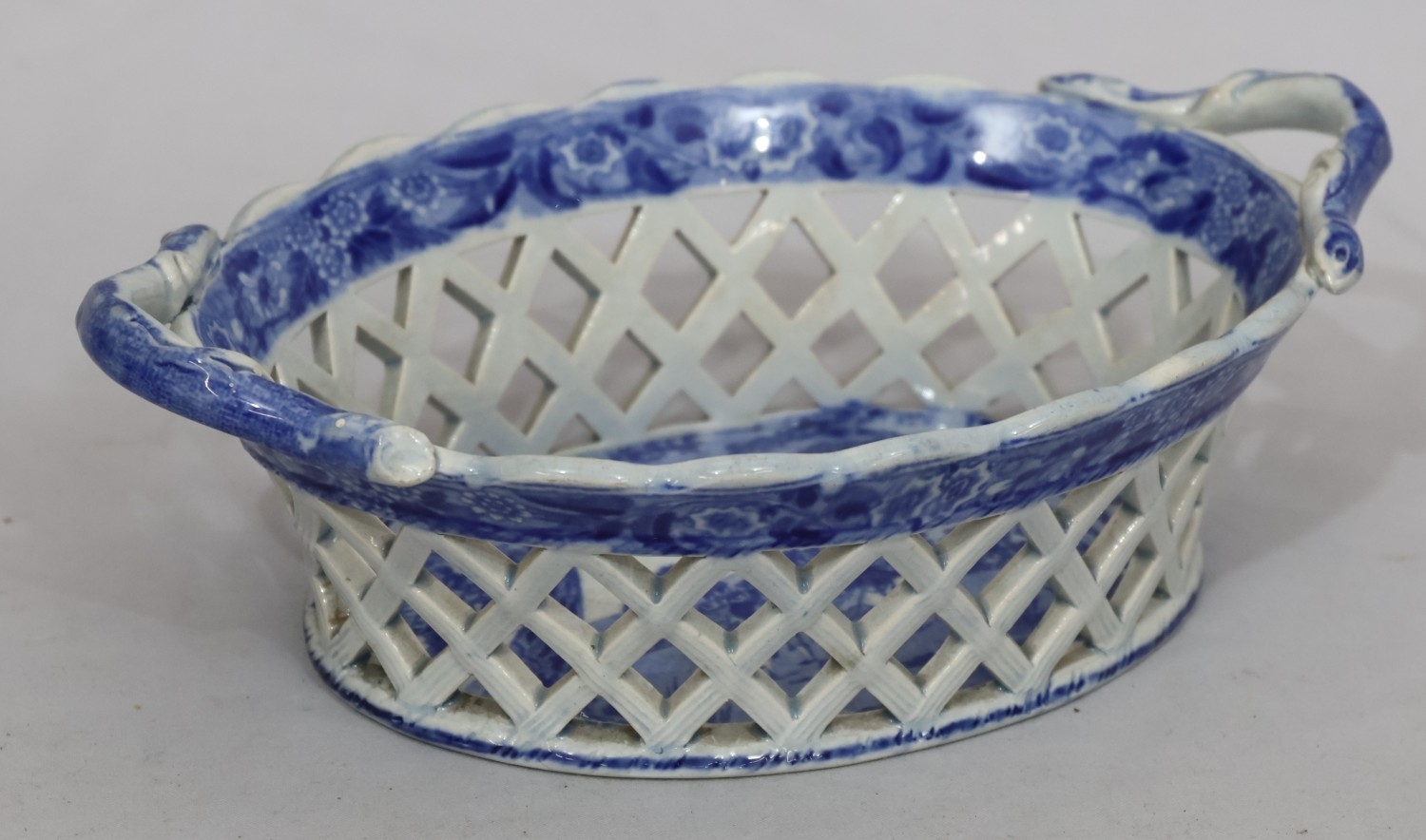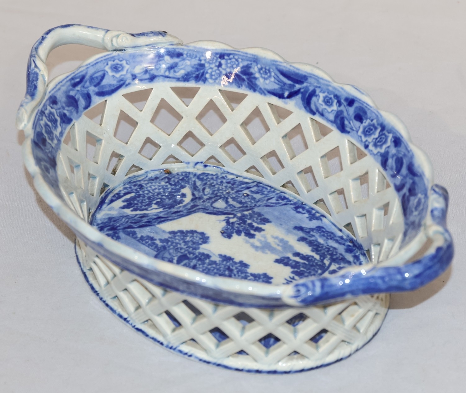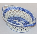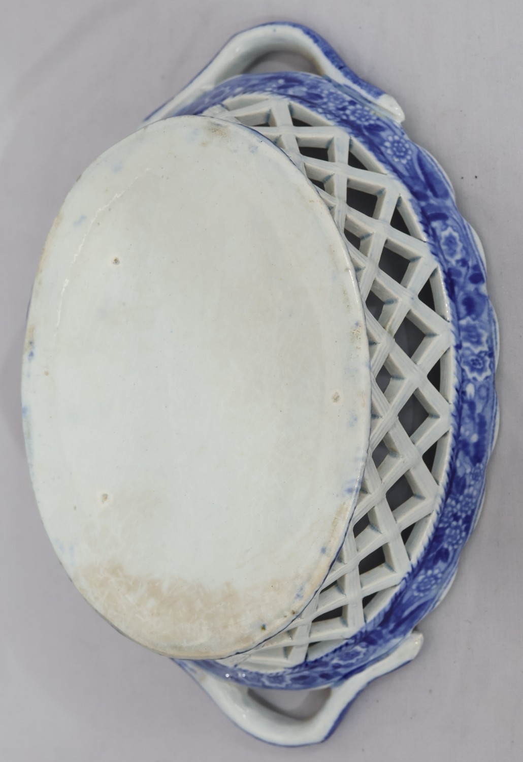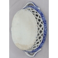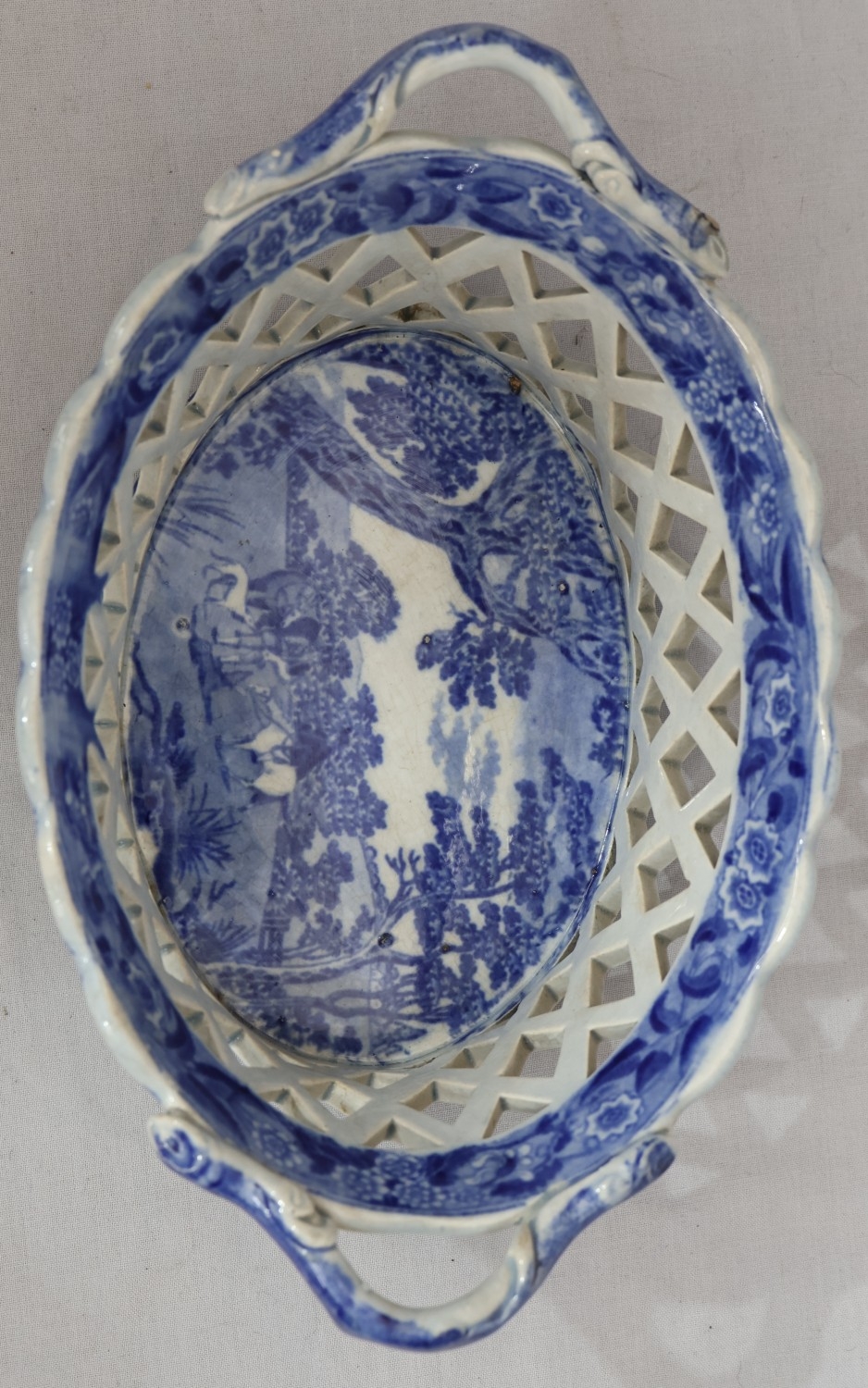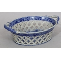 A 19th Century oval blue and white 2-handled basket with figure on horseback and landscape decoration, 22.5cm wide