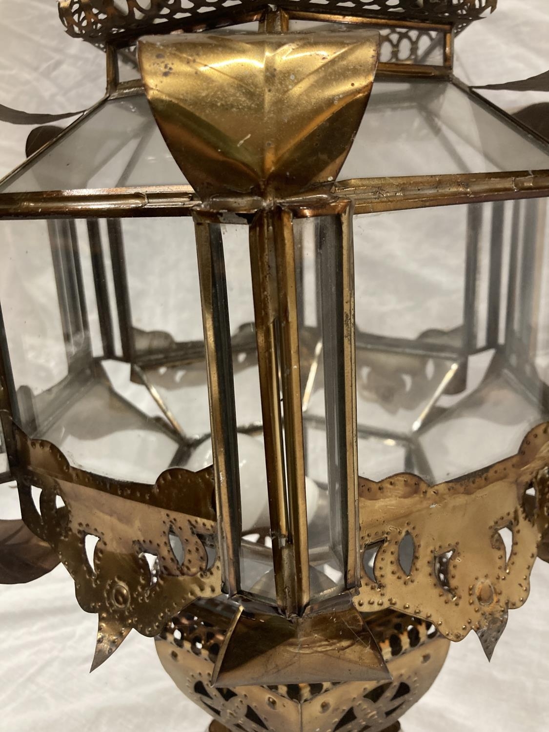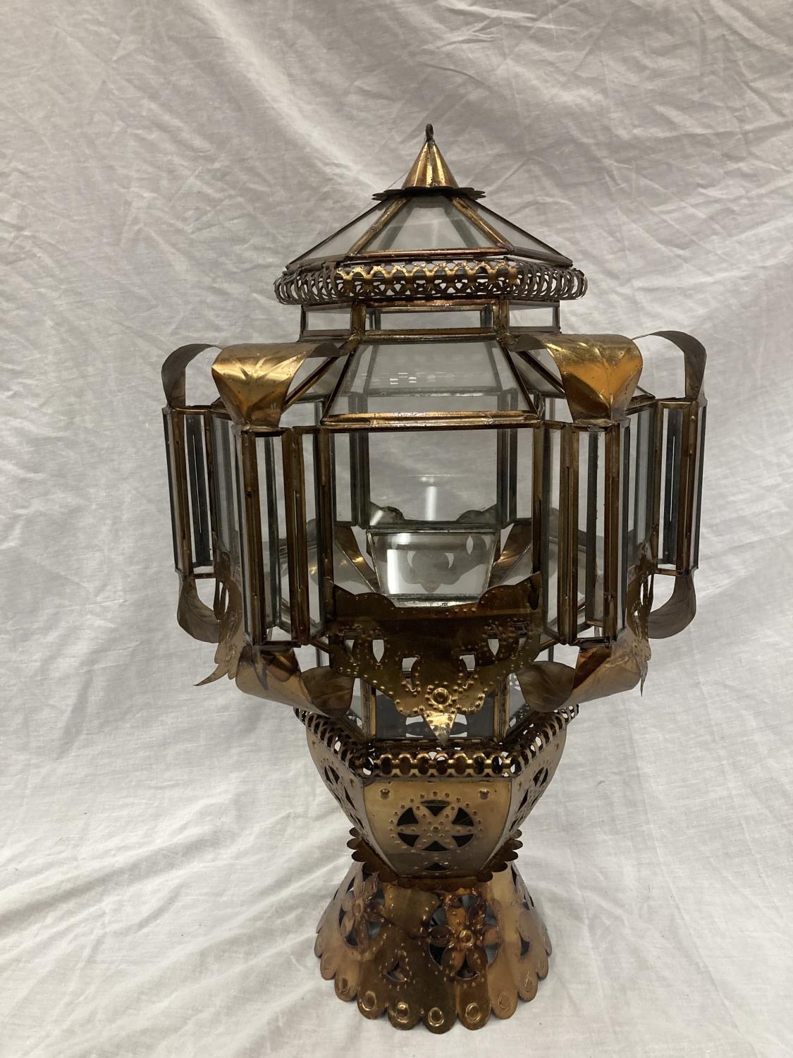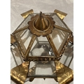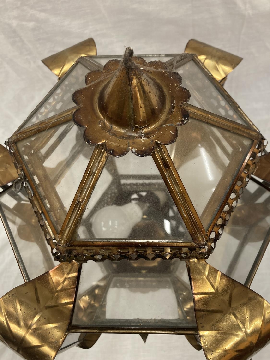 A METAL AND GLASS LANTERN STYLE LIGHT IN HEXAGONAL CASING WITH A PYRAMID STYLE TOP, HEIGHT 56CM, WIDTH APPROX 36CM