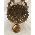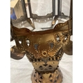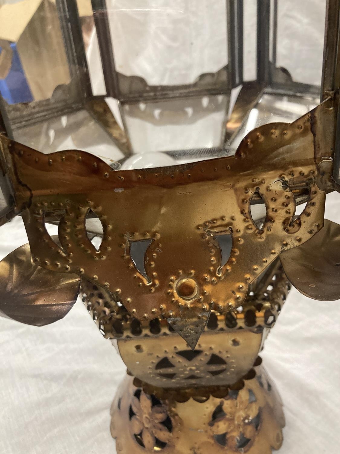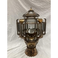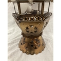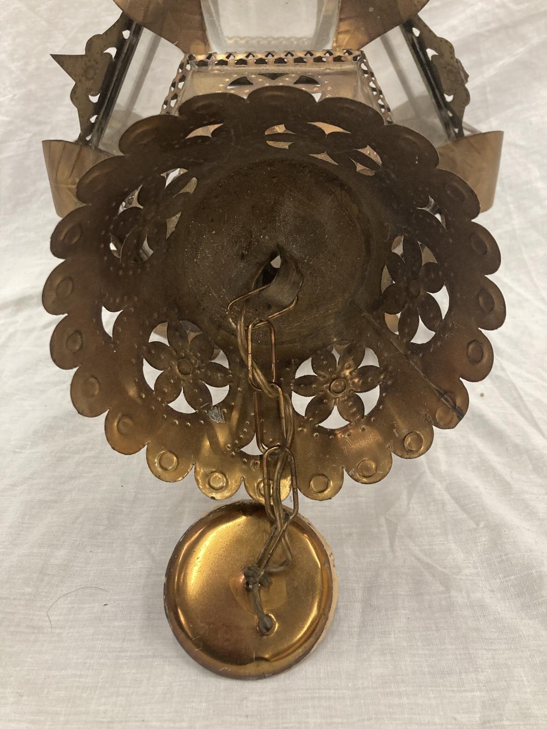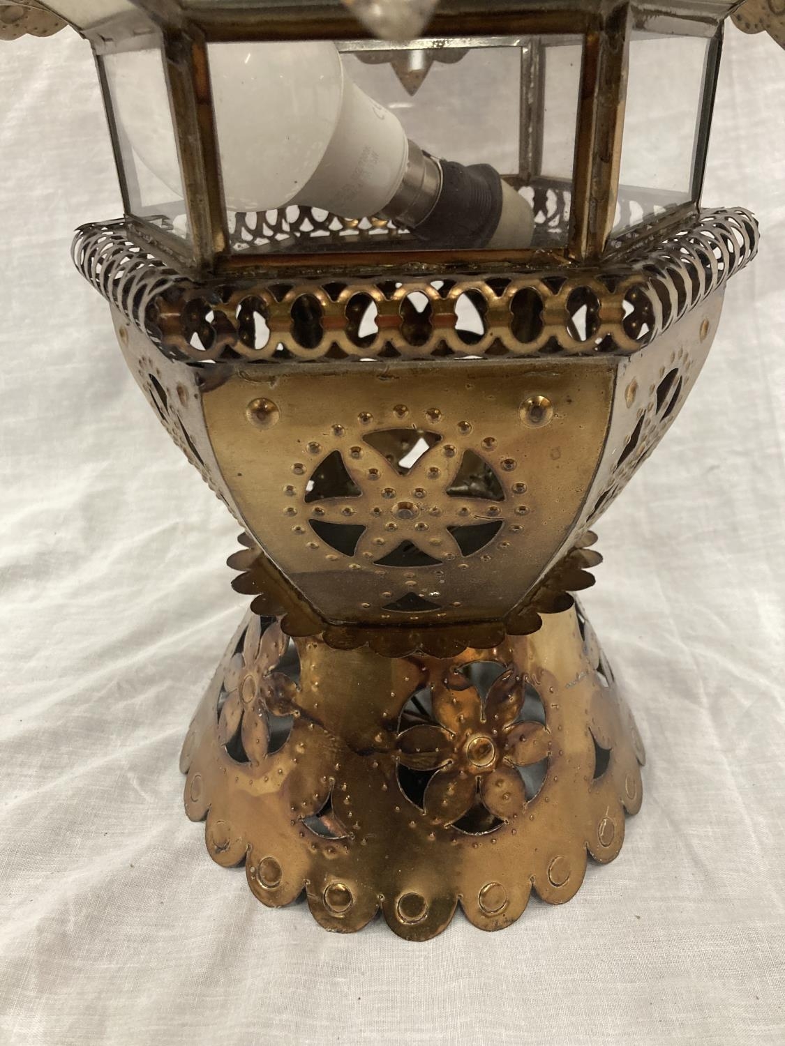 A METAL AND GLASS LANTERN STYLE LIGHT IN HEXAGONAL CASING WITH A PYRAMID STYLE TOP, HEIGHT 56CM, WIDTH APPROX 36CM