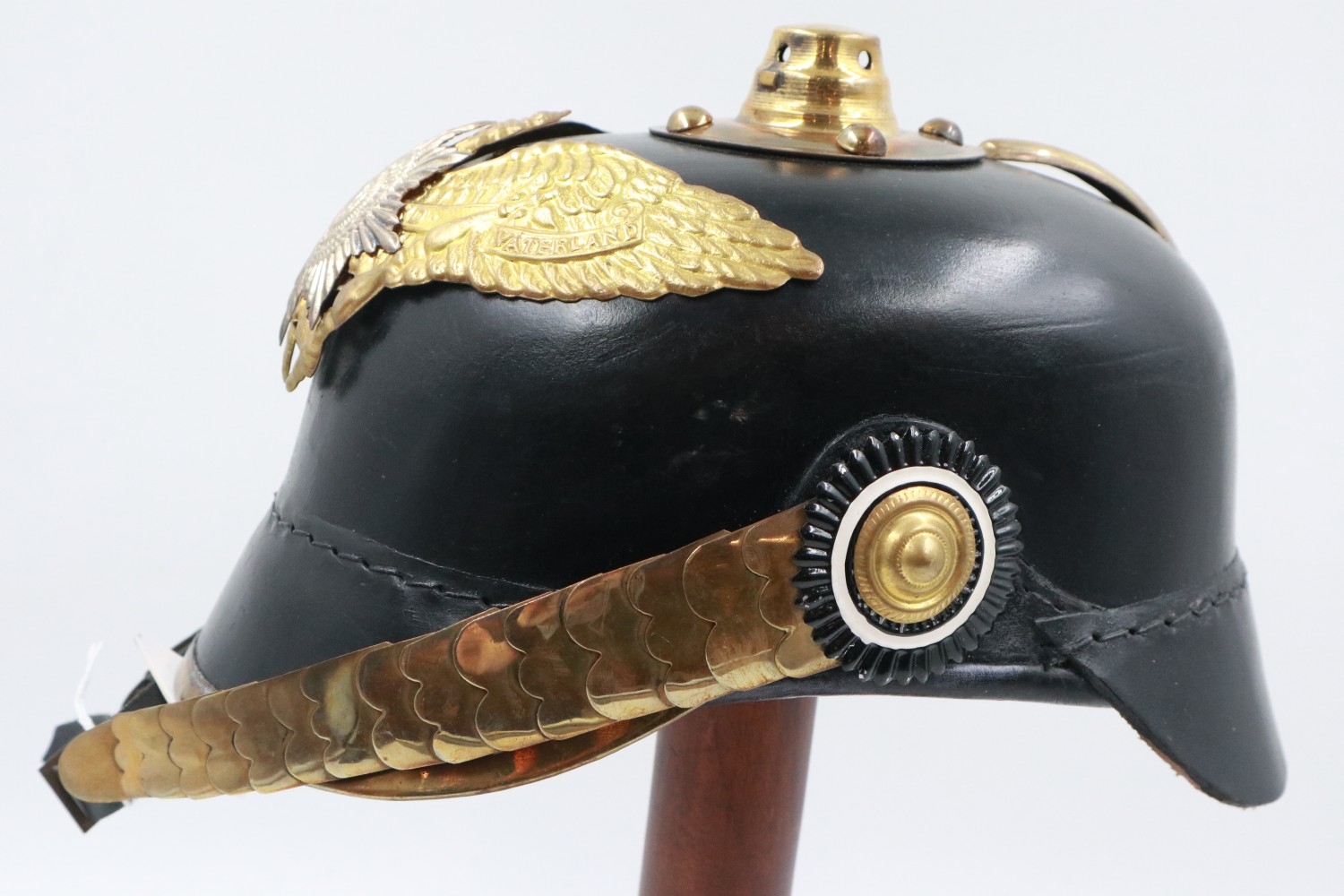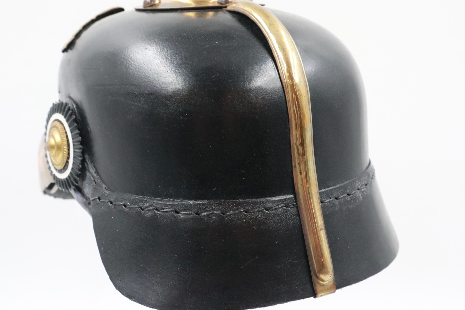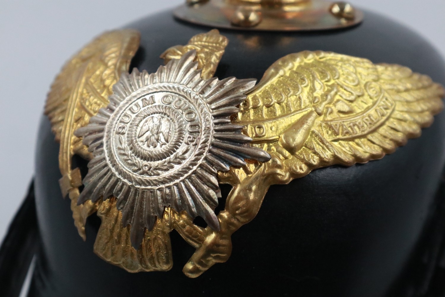 Replica WWI pickelhaube, badged to the Imperial Prussian Garde Korps Regiment, lacking spike. UK P&P Group 2 (£24+VAT for the first lot and £5+VAT for subsequent lots)