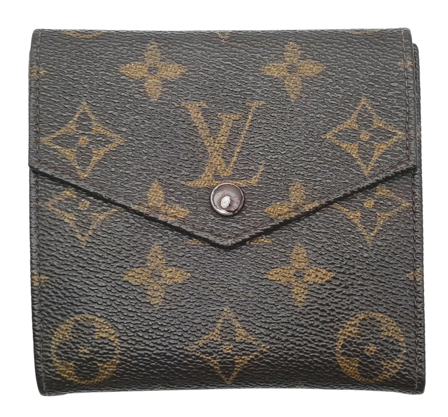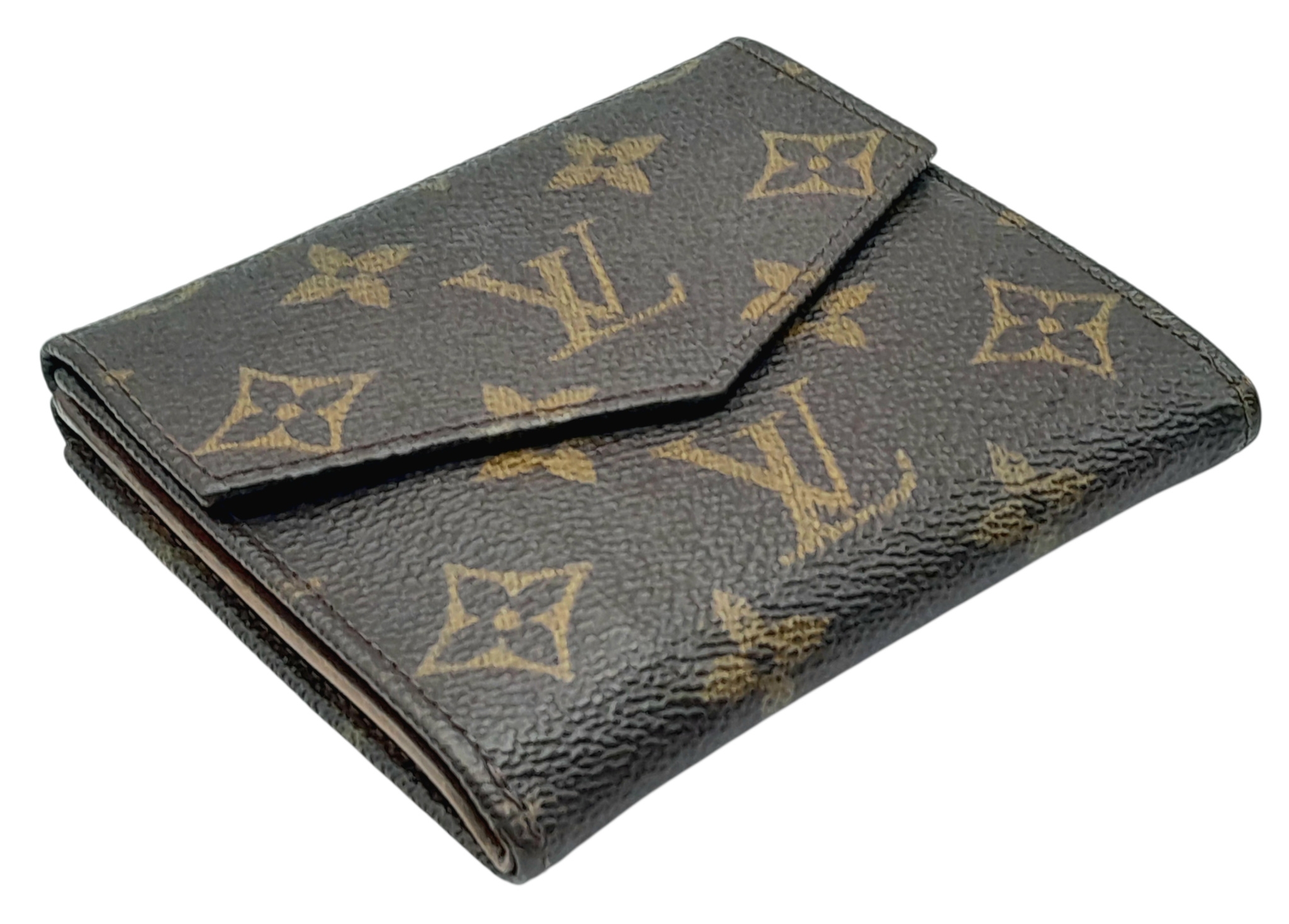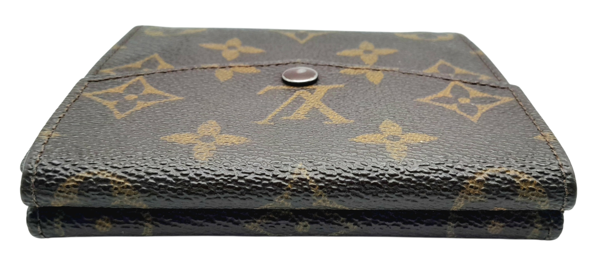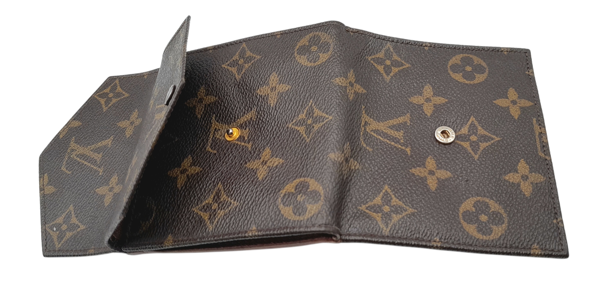 A Louis Vuitton Monogram Canvas Wallet. Brown monogram canvas exterior with a press-stud closure. Double-sided design; one side opens to a light brown leather interior with multiple card slots and compartments, while the other side features two coin compartments. Approximately 11.2cm x 10.4cm when closed, and 26.2cm x 11.2cm when open. Stains and marks to the interior - Please see photos or request a condition report. Ref: 27305