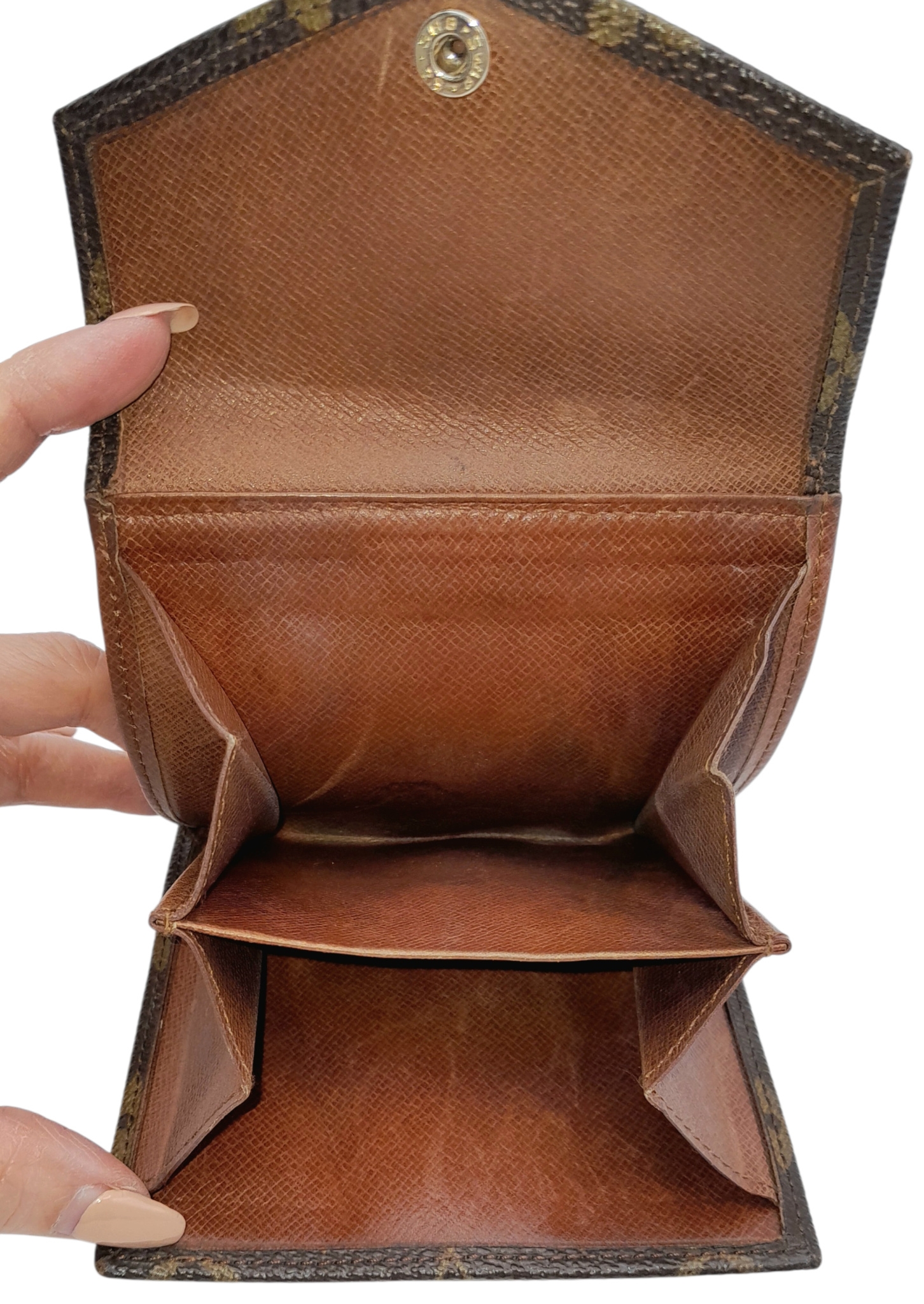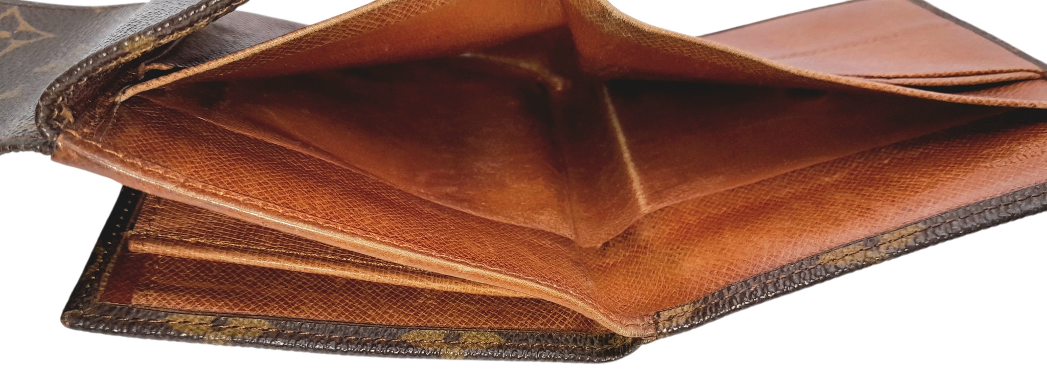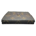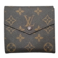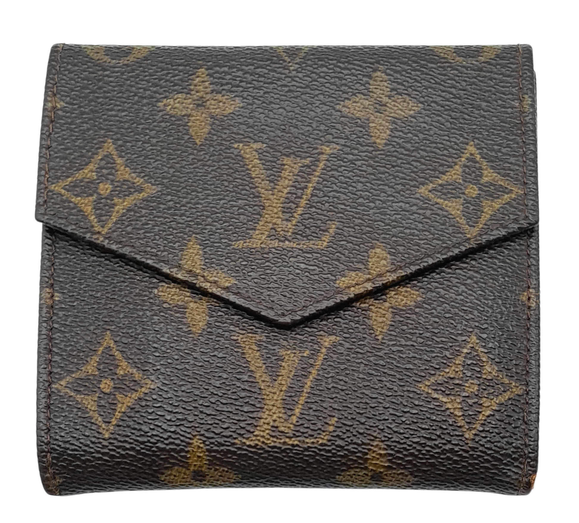 A Louis Vuitton Monogram Canvas Wallet. Brown monogram canvas exterior with a press-stud closure. Double-sided design; one side opens to a light brown leather interior with multiple card slots and compartments, while the other side features two coin compartments. Approximately 11.2cm x 10.4cm when closed, and 26.2cm x 11.2cm when open. Stains and marks to the interior - Please see photos or request a condition report. Ref: 27305