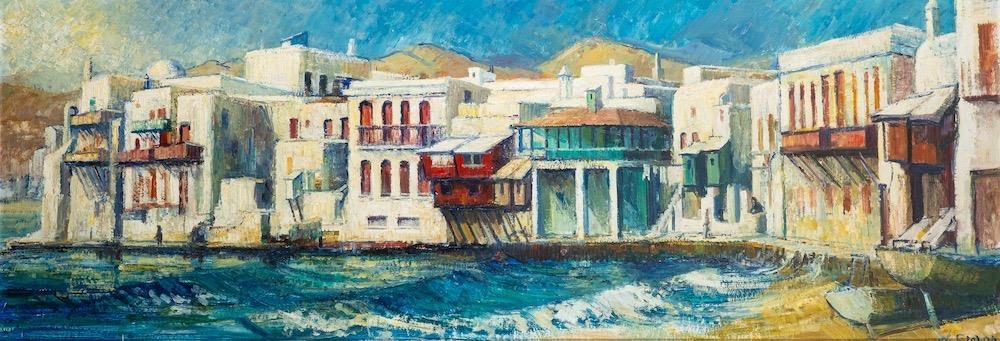 William Genge (British, fl. 20th century) Mykonos - Little Venice signed lower right oil on board 41 x 120cm.