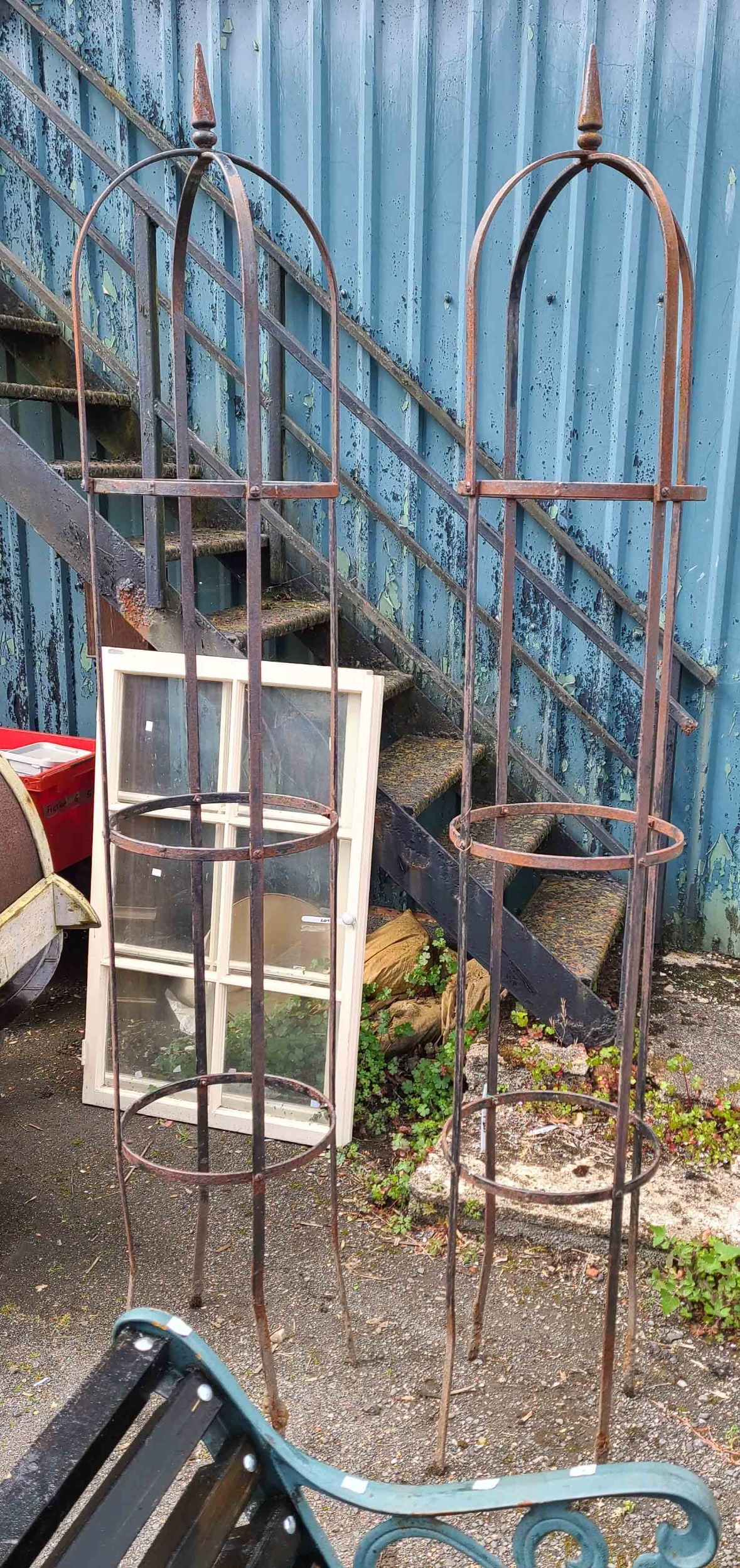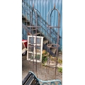 A tall pair of wrought iron garden obelisks, each finished with an arched top and pointed finial