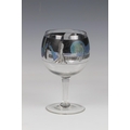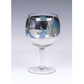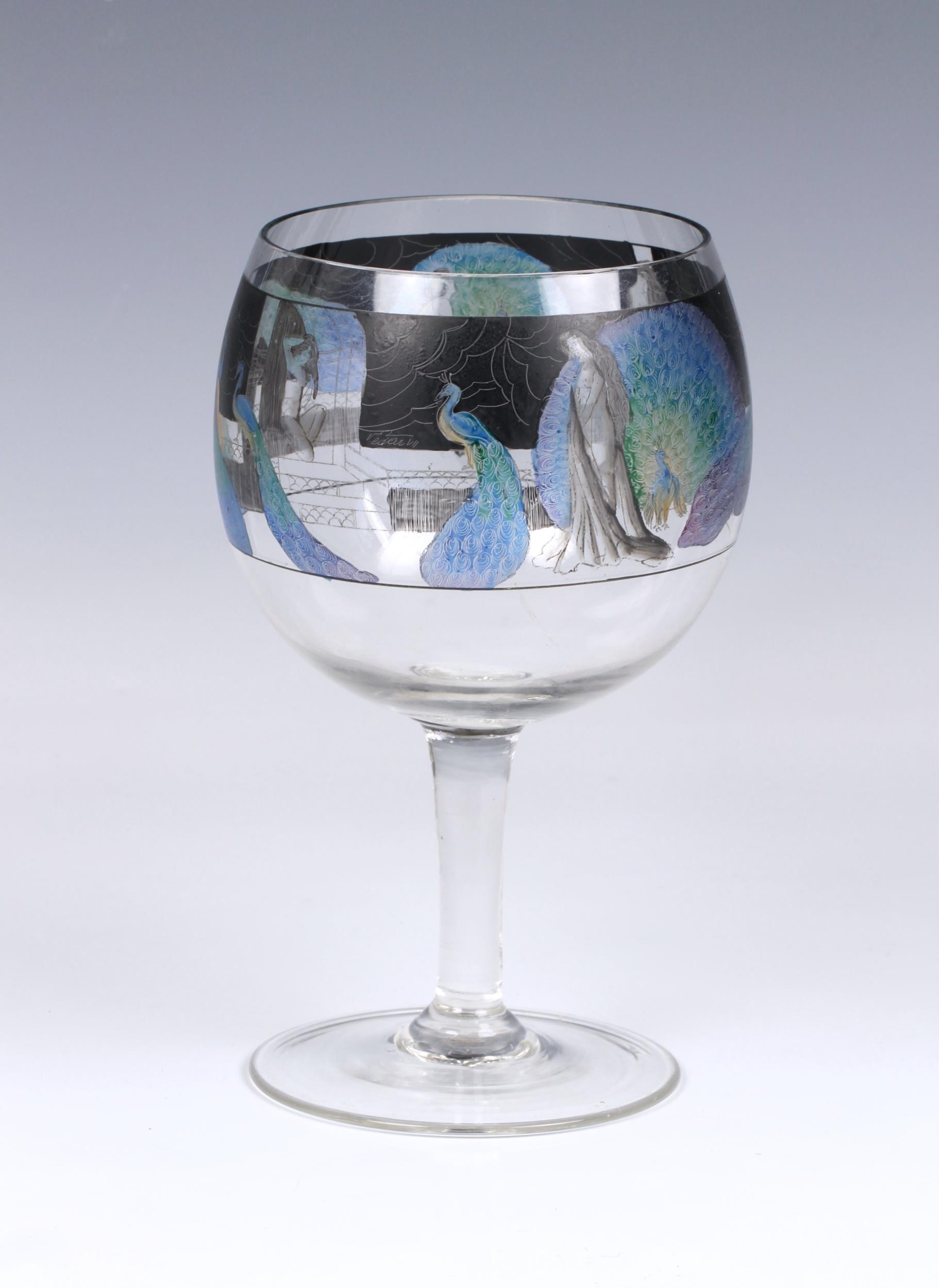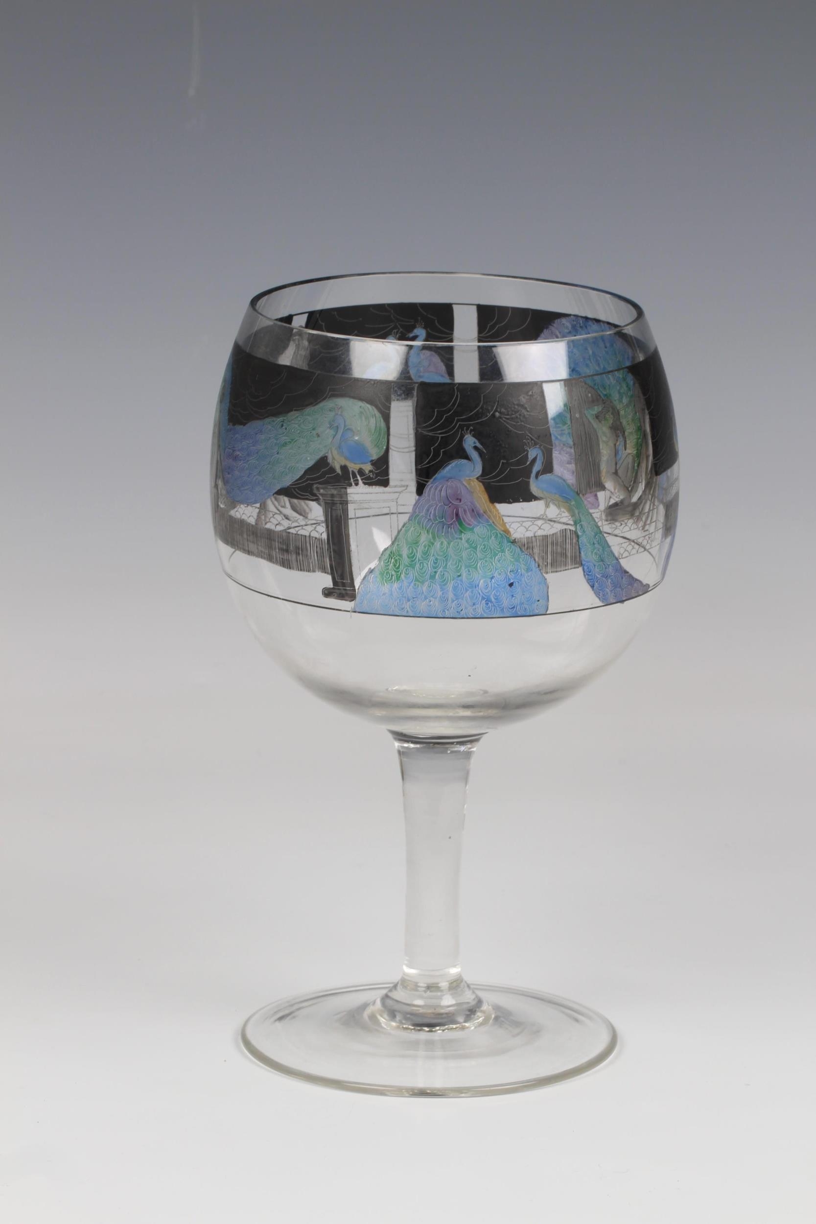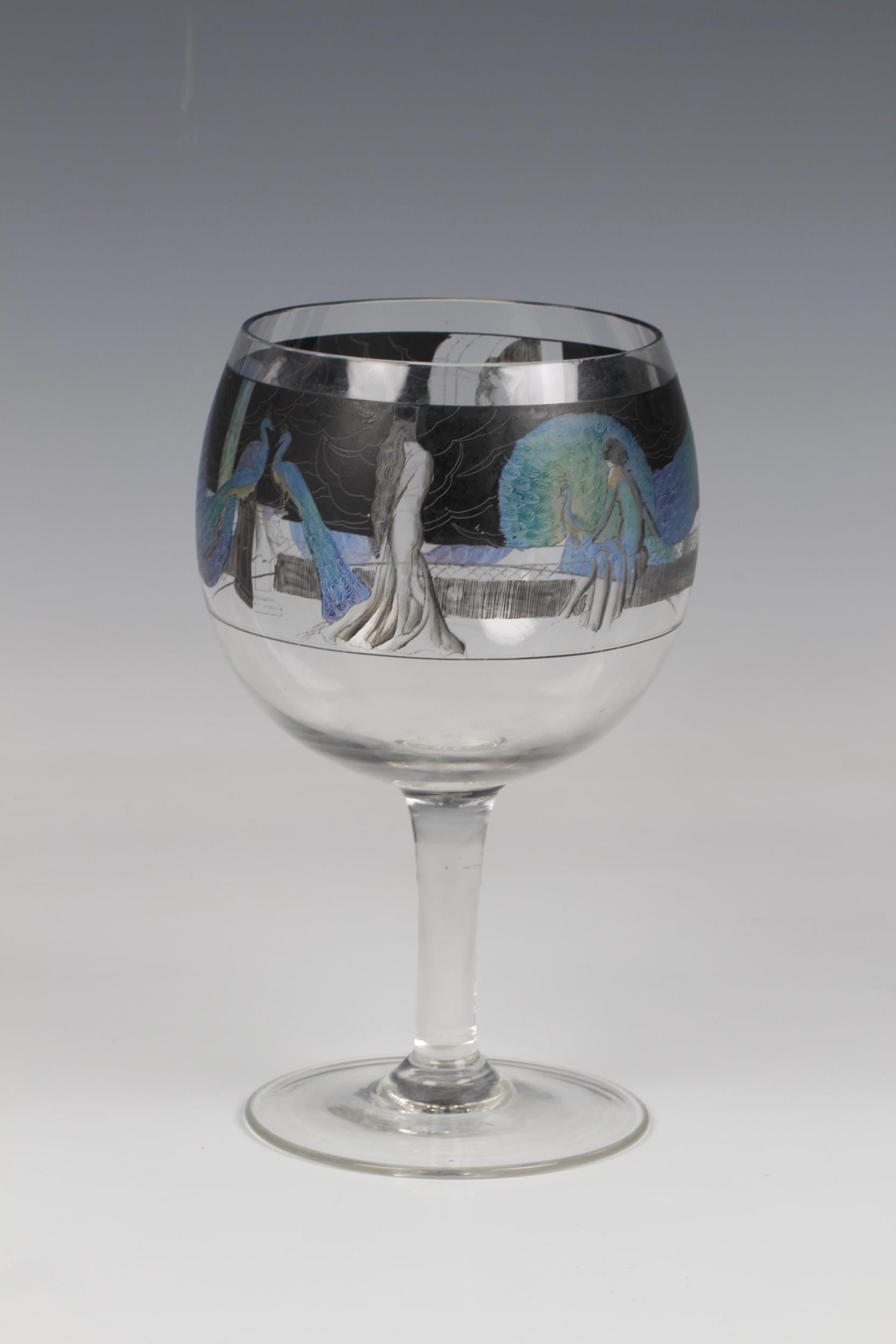 An Art Deco Vetri della Arte (Vedar) wine goblet, the bowl enamelled with a continuous frieze of nudes and coloured peacocks against a black background on a plain stem and disk foot, having a ground pontil, 7¾in. (19.7cm.) high.. * No chips or cracks found, very good.