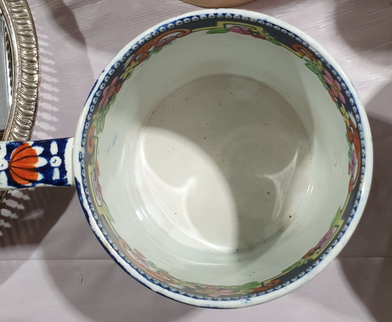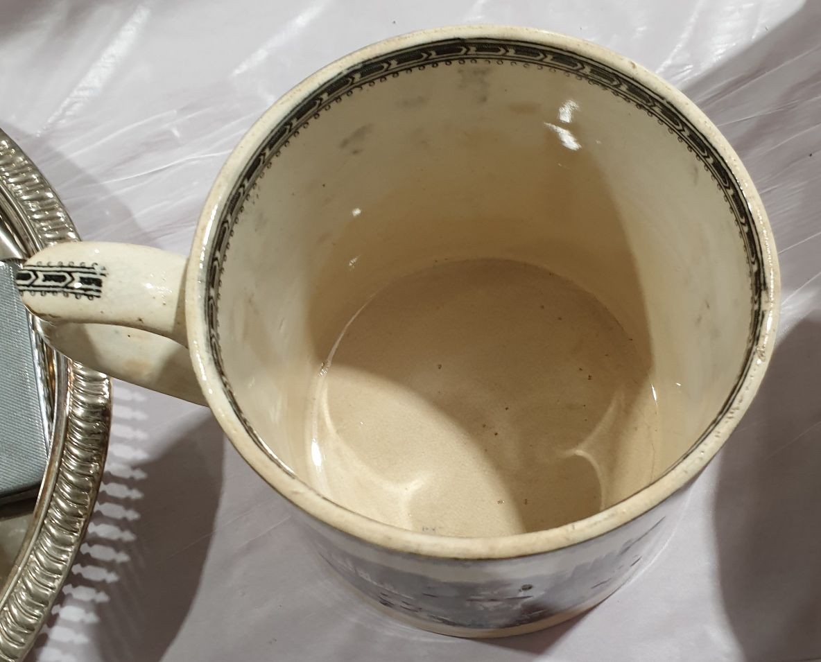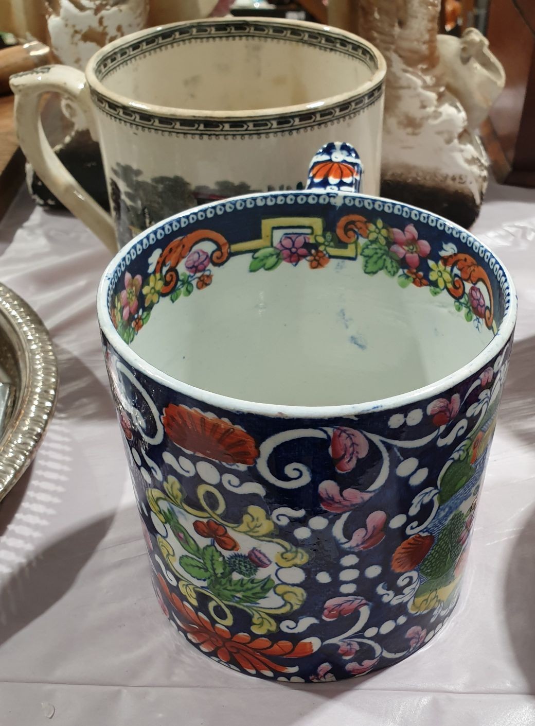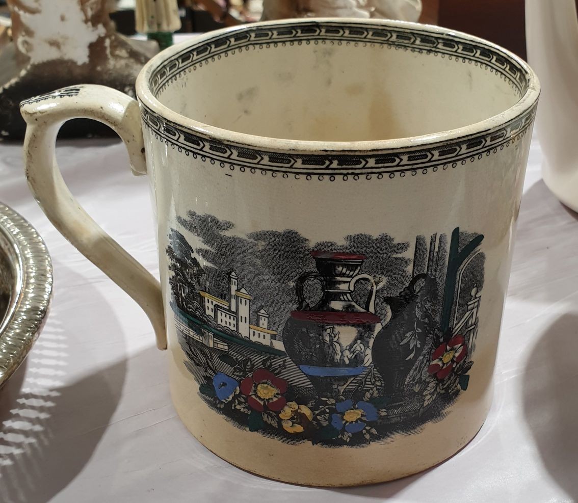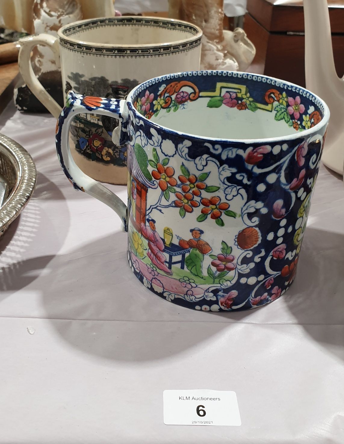 A 19th century Opaque China large mug, hand coloured with oriental scenes, height 4.5" together with one other large 19th century mug. No in house shipping. Please arrange your own collection or packing and shipping.