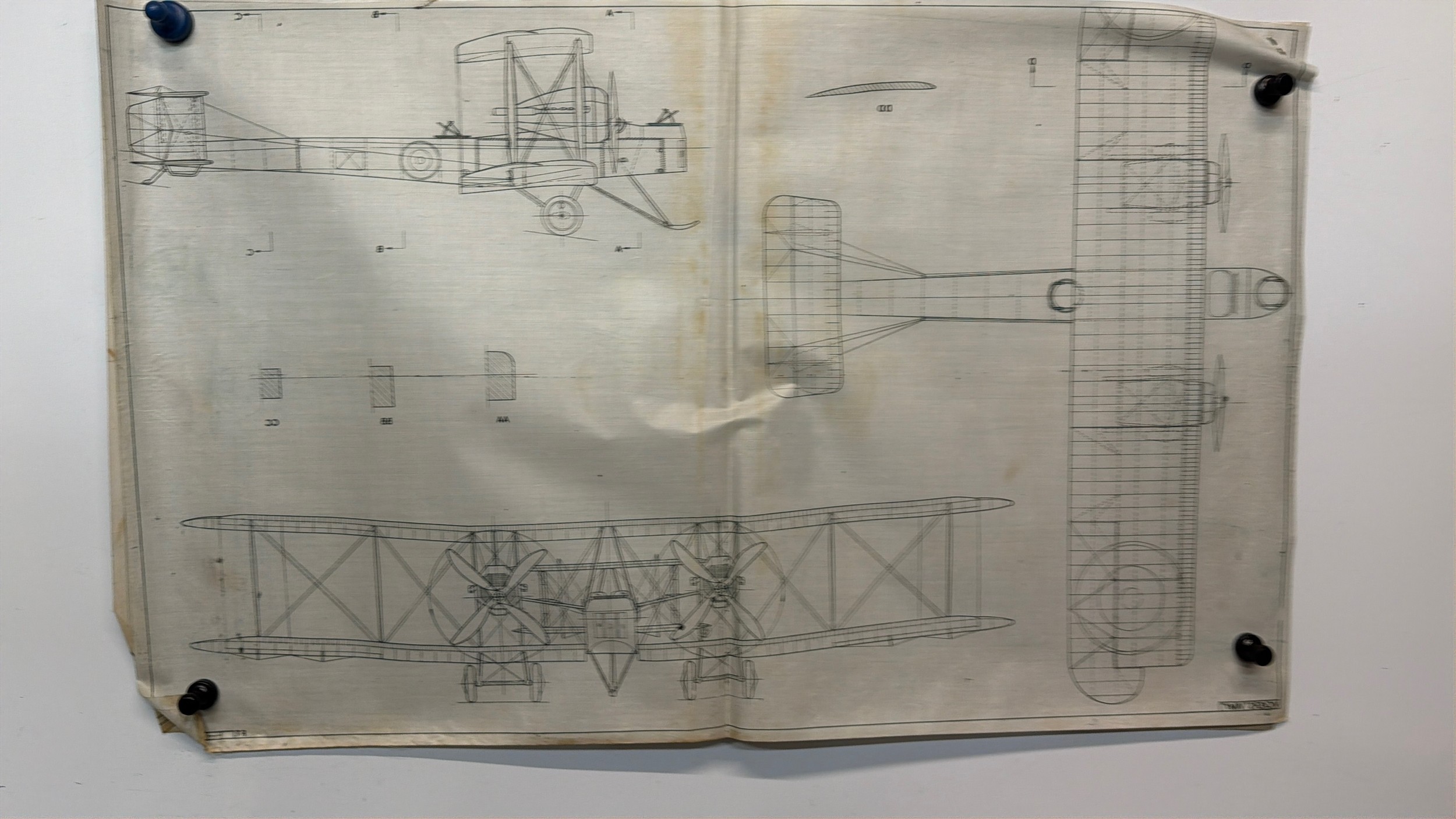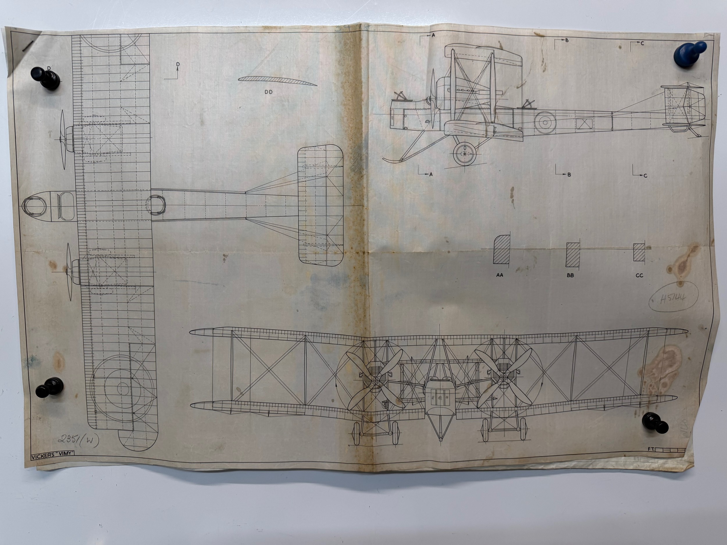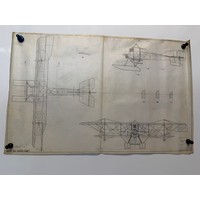 British aviation RAF RFC WWI & WWII planes, Vintage aircraft plans on linen of a Vickers Vimy, 60cm x 38 cm.