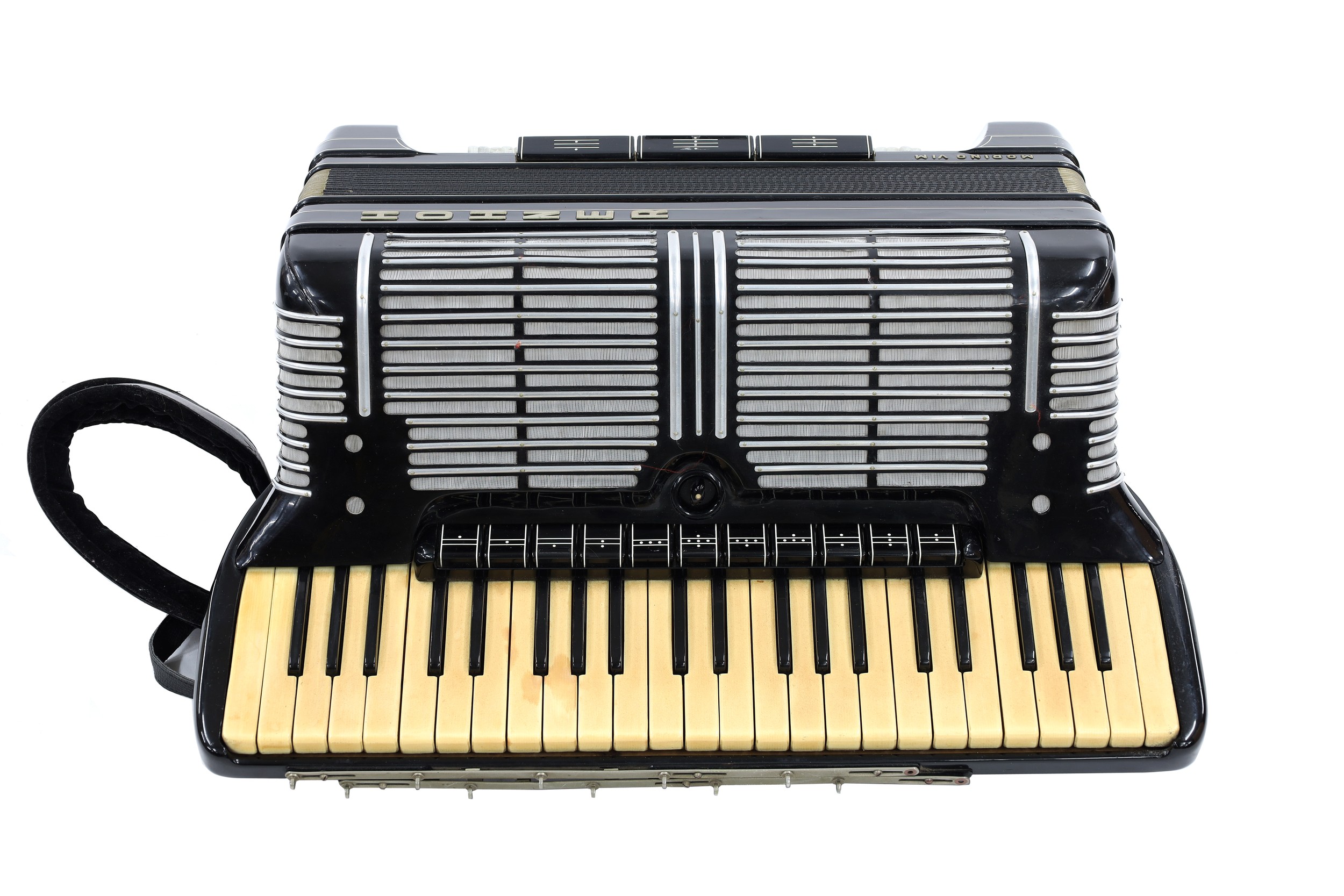 Good Professional Model Hohner Morino VI M piano accordion, circa mid 1960s, double cassotto, with one hundred and eighty-five bass buttons, normal and and extra three rows of chromatic buttons (free-bass), three bass registers and eleven treble registers, black finish and within the original case adapted with wheels and handle to facilitate transportation