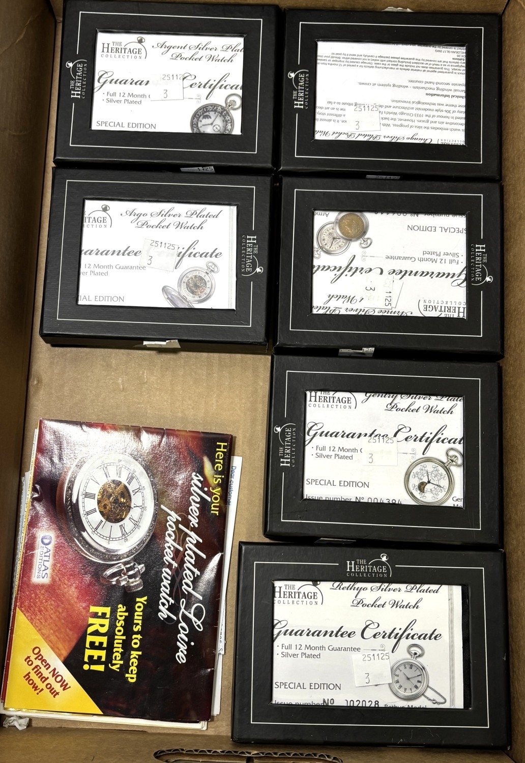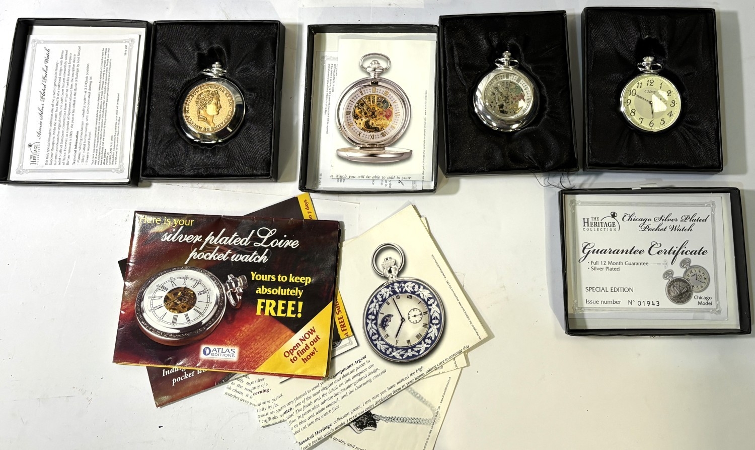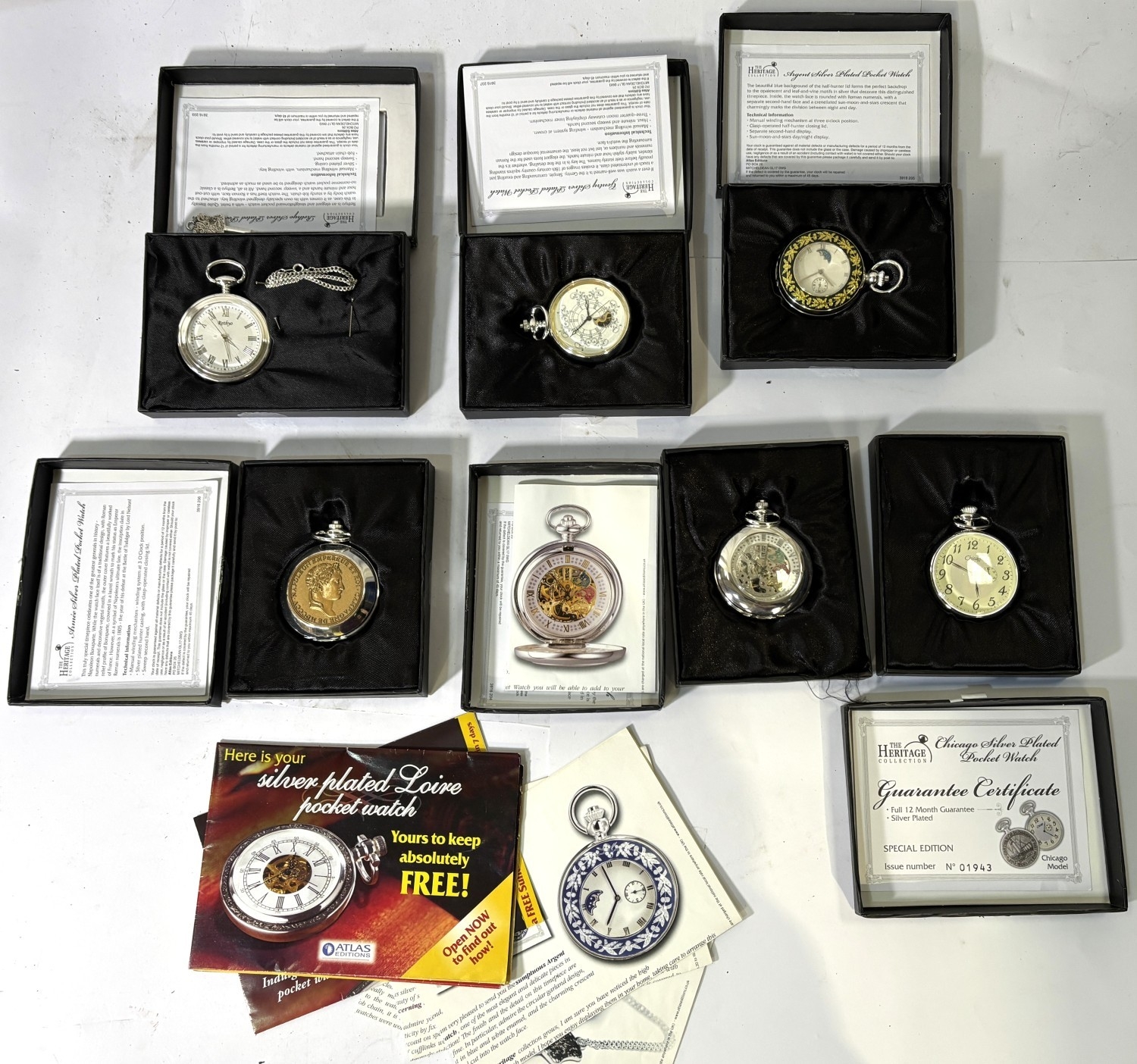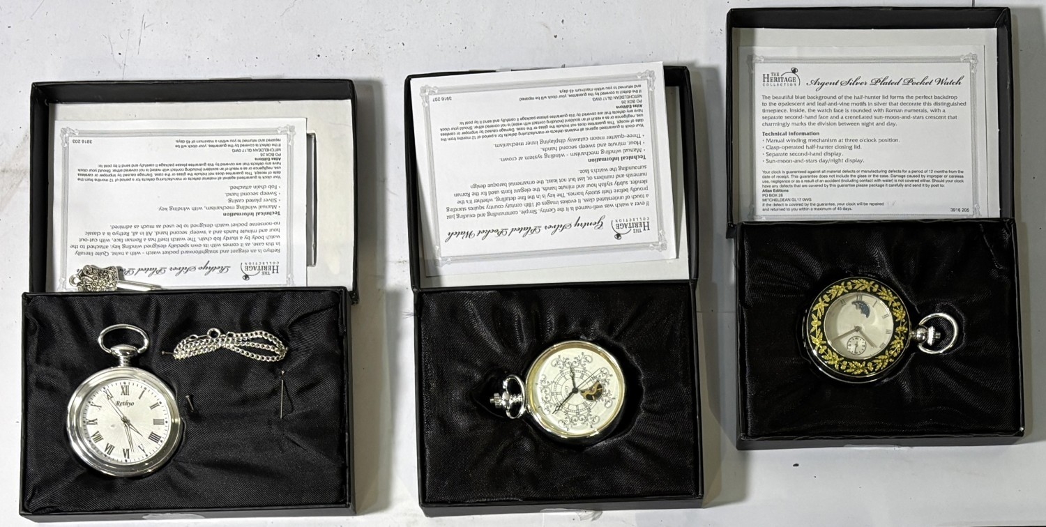 A collection of 5 originally boxed "The Heritage" gents reproduction pocket watches.
