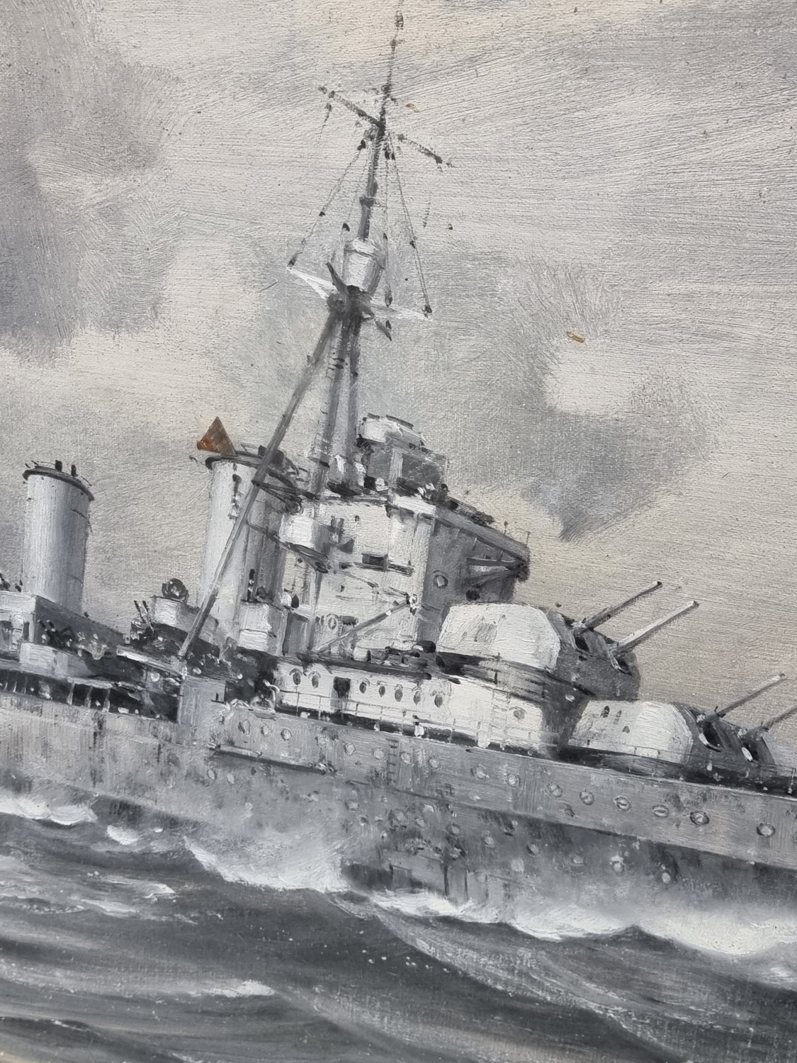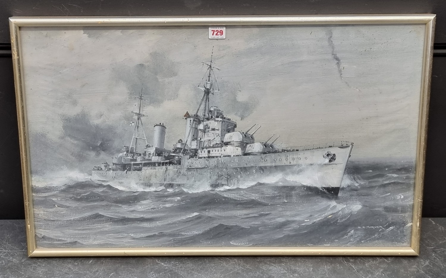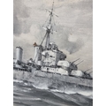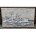 Charles Eddowes Turner, a Royal Navy cruiser at sea, signed, signed, en grisaille watercolour and gouache, on canvas board, 44 x 75cm.