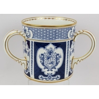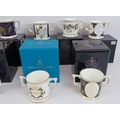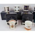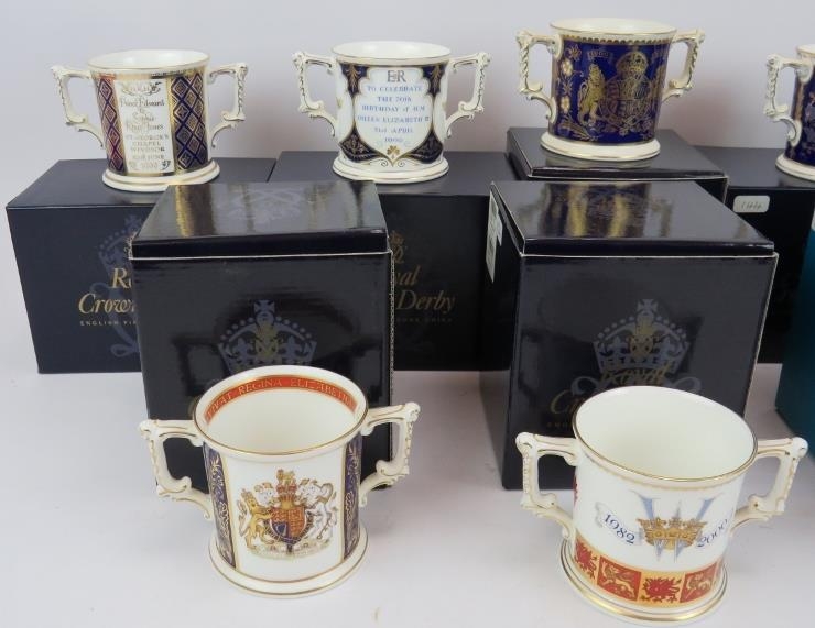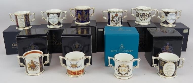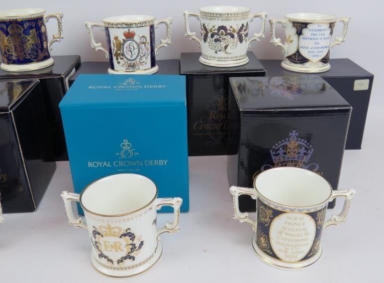 Ten Royal Crown Derby royal commemorative loving cups with certificates and boxes celebrating various weddings, birthdays etc. (10).