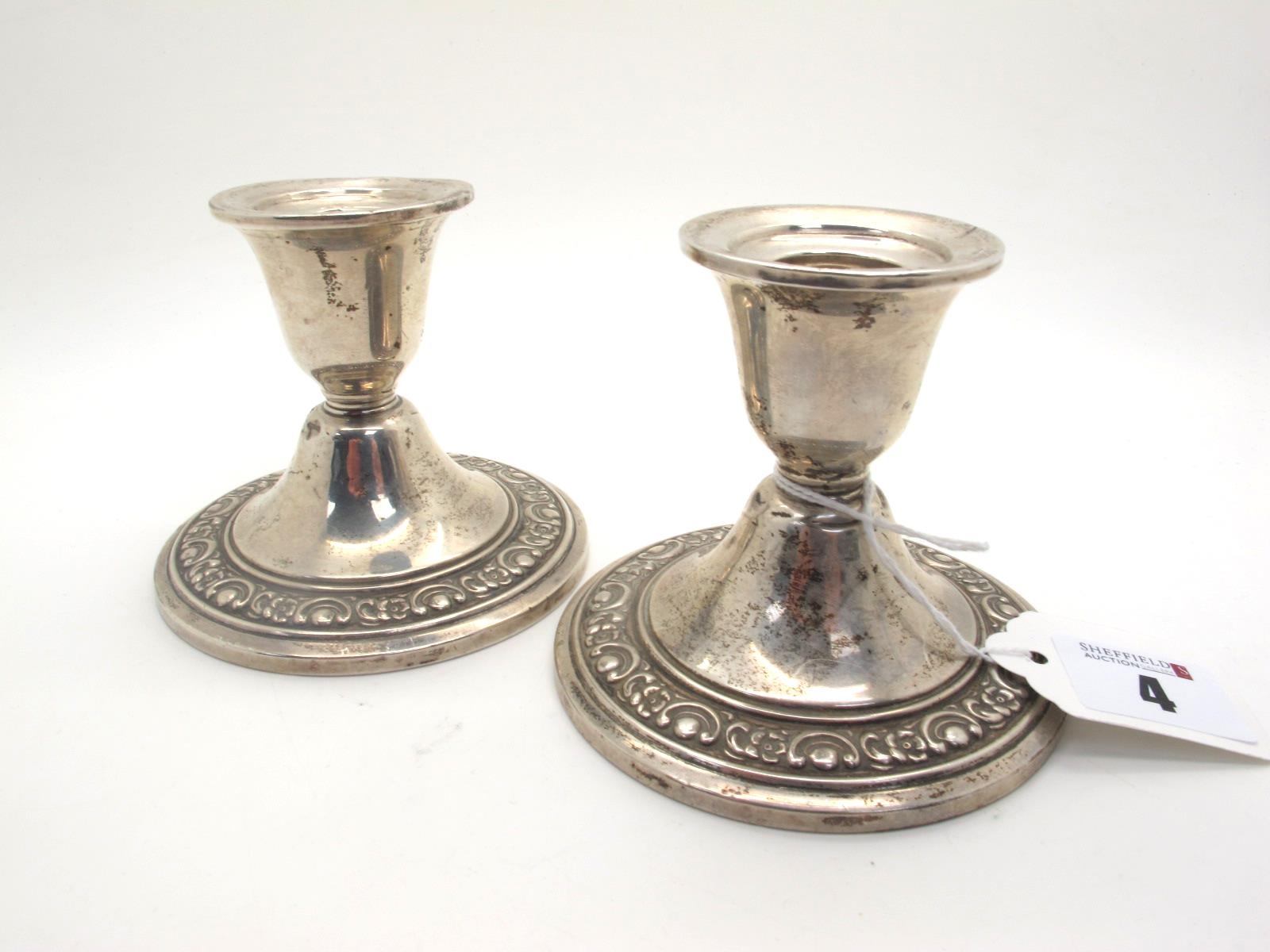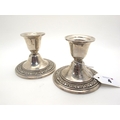 A Pair of American Dwarf Candlesticks, each with textured foliate band, on circular spreading base (weighted), stamped "Newport Sterling" (dents).