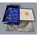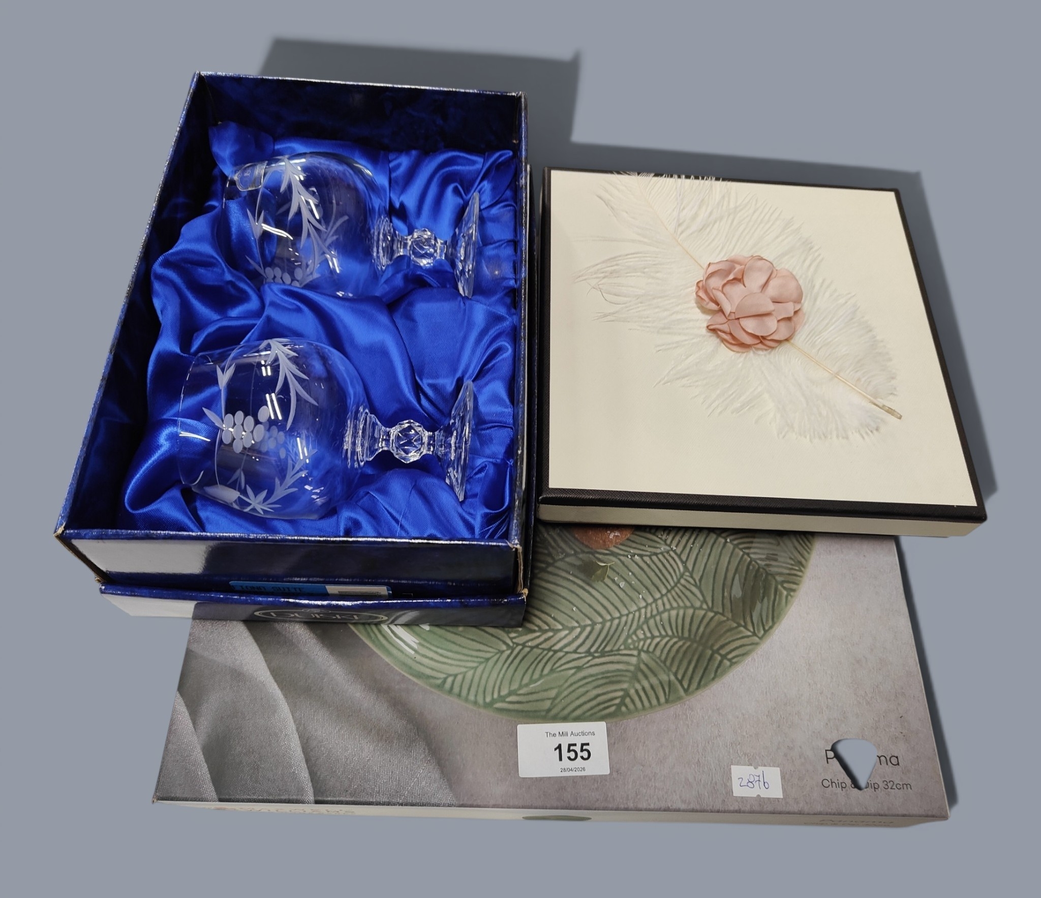 SHELF LOT TO INCLUDE CHIP & DIP, DUSKE GLASS WARE , LADIES SCARF