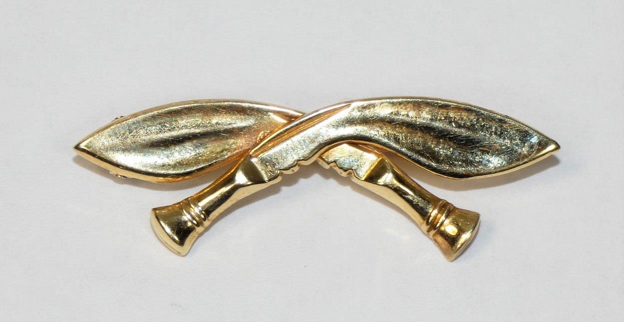 A 14ct gold Gurka sweetheart brooch, London import 1964, in the form of crossed Kukri, length 39 mm, weight 2 gms.