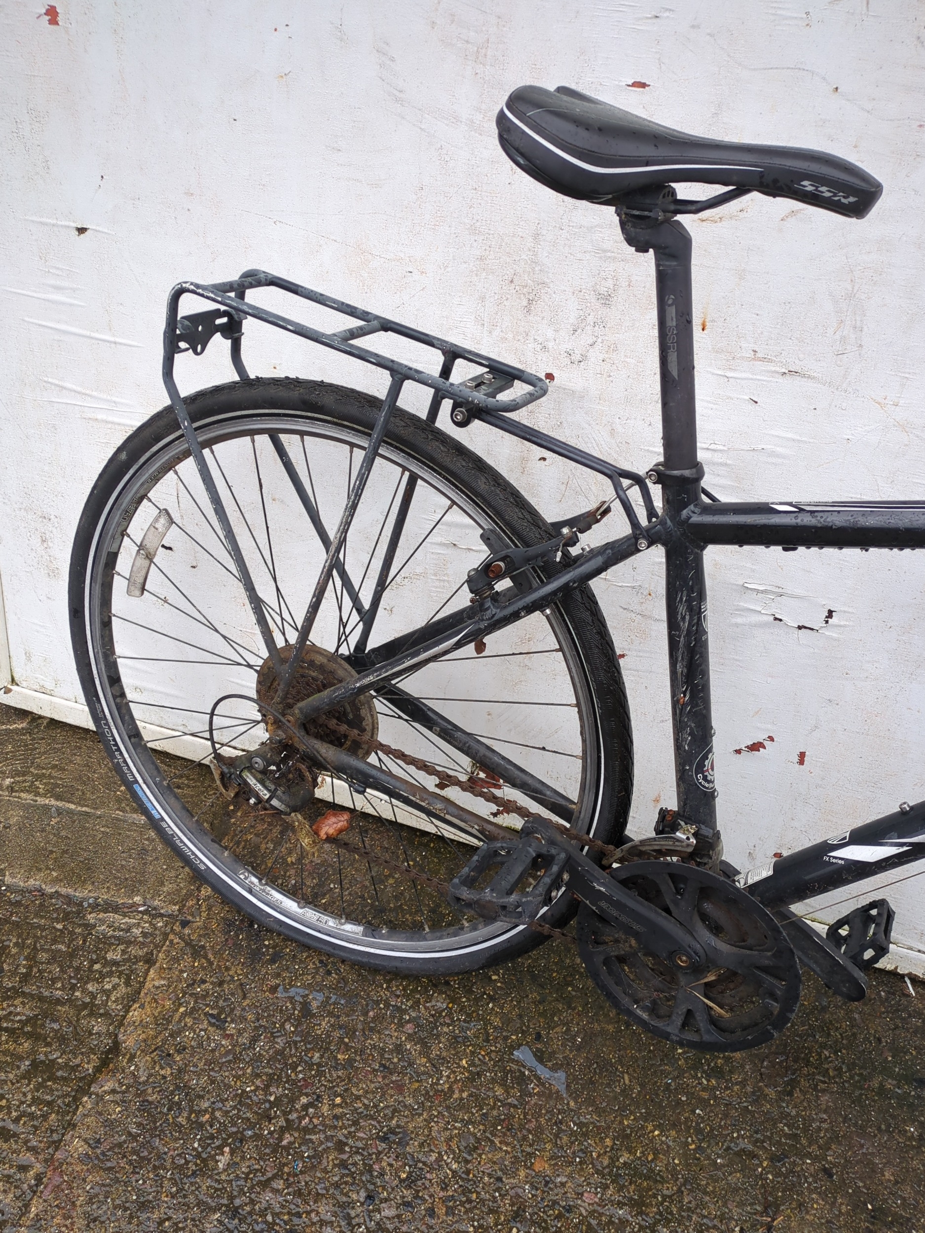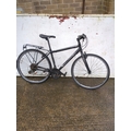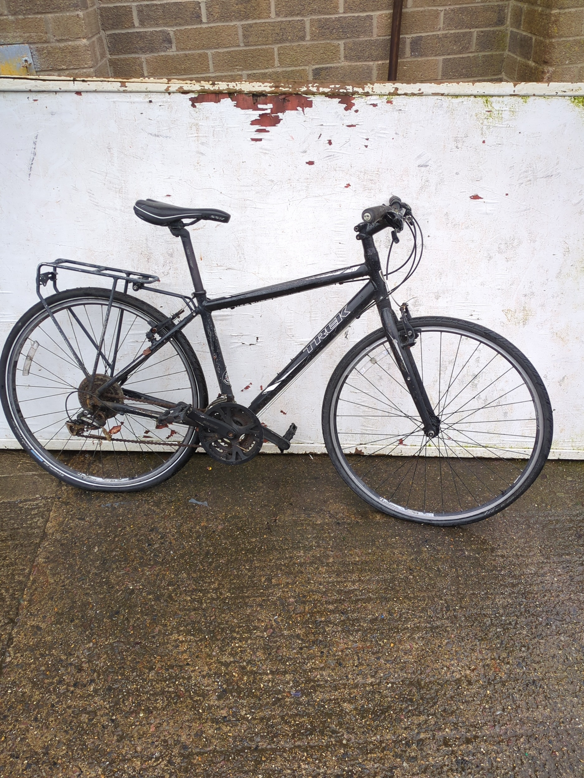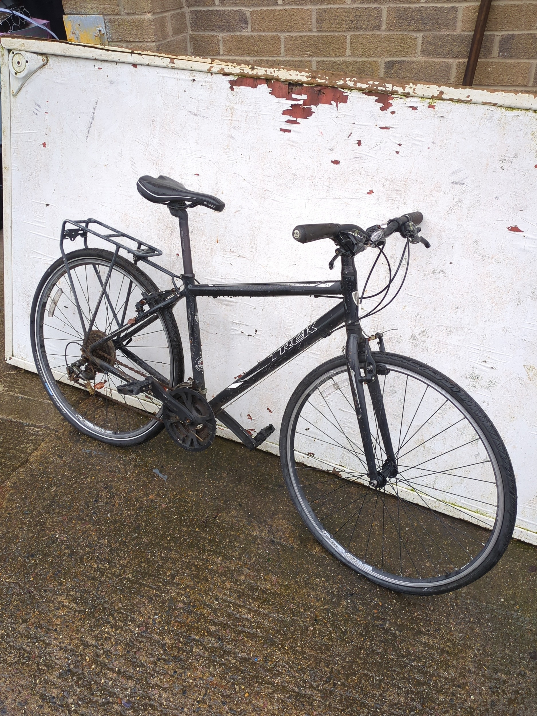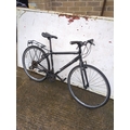 This is a Trek-brand bicycle featuring a black frame and standard road bike design. It includes a rear luggage rack and appears to support both front and rear handbrakes. The bike is suitable for everyday commuting or casual rides.