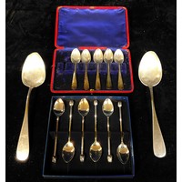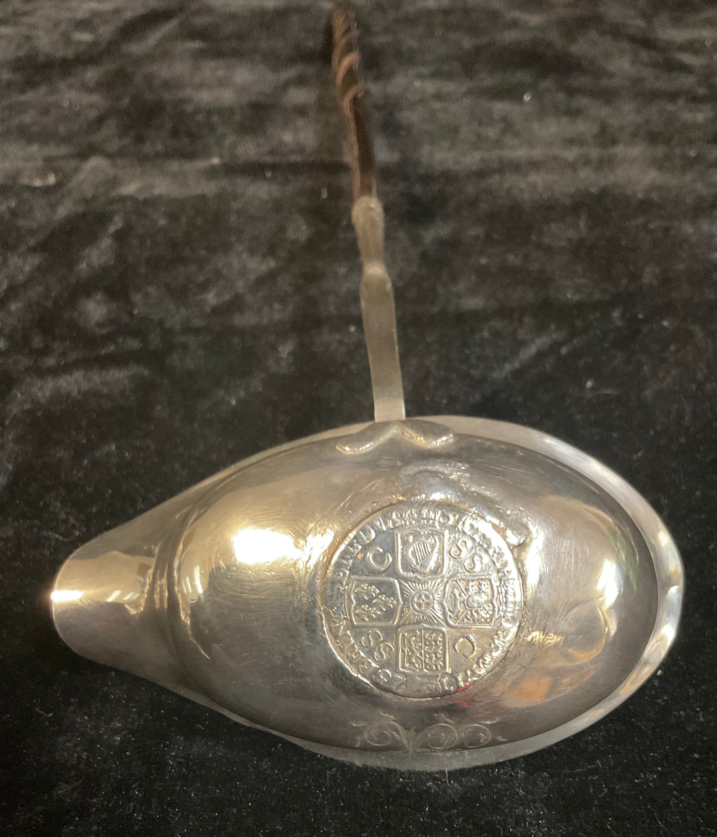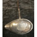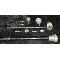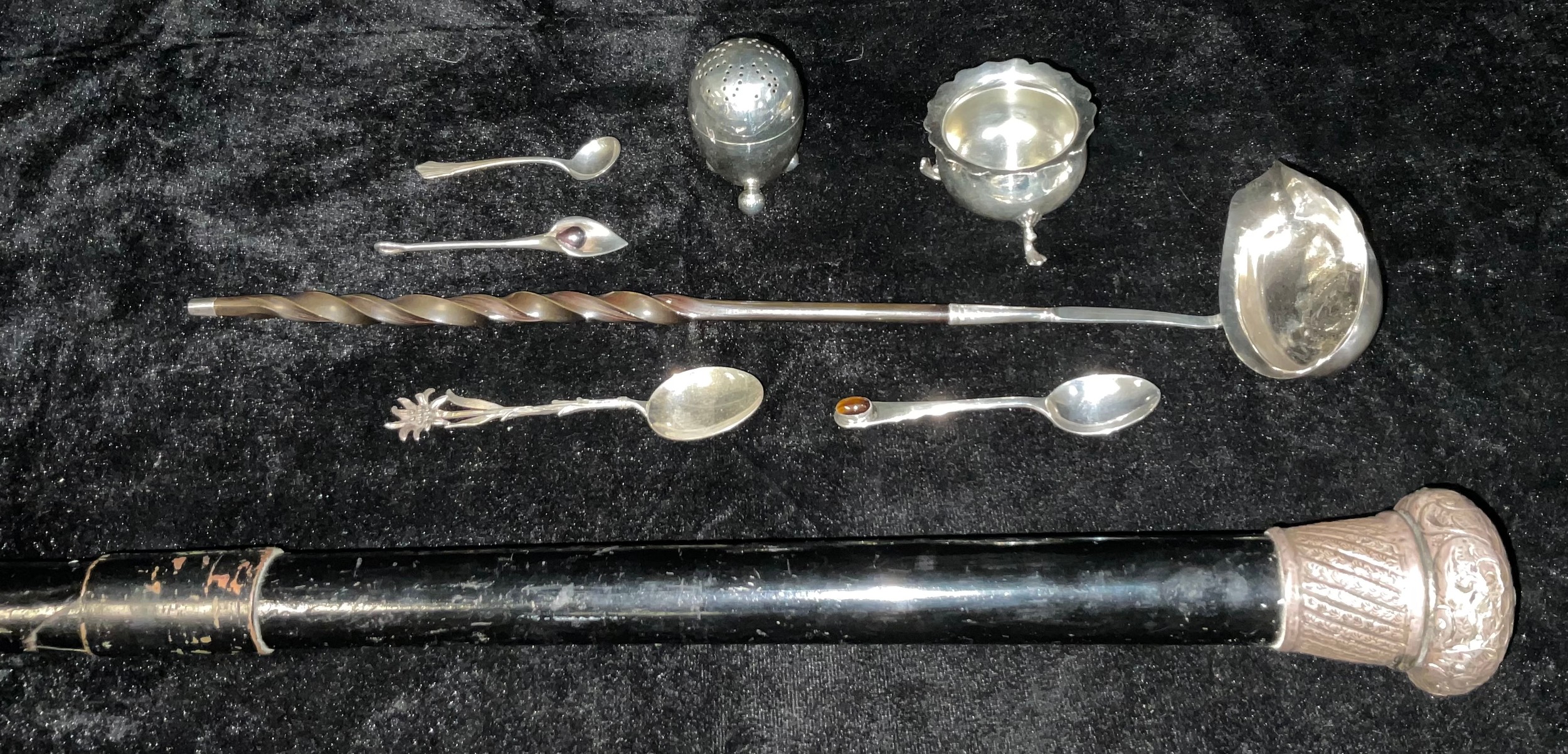 A Georgian silver toddy ladle, set with a George I coin 1723, twisted baleen handle, unmarked; a late 19th century ebonised walking stick, silver and replacement base metal knop, unmarked; an Edwardian silver table salt, Chester 1903, 32g; a silver teaspoon set with a polished oval tiger's eye cabochon, a silver condiment spoon, a silver flower pendant, 22g; an unmarked edelweiss spoon; an EPNS pepper pot (8)