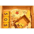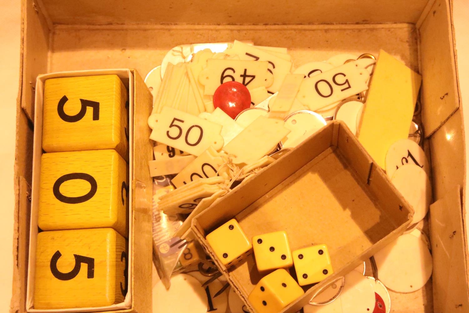 Box of dice and a bakelite number tab. P&P Group 2 (£18+VAT for the first lot and £3+VAT for subsequent lots)