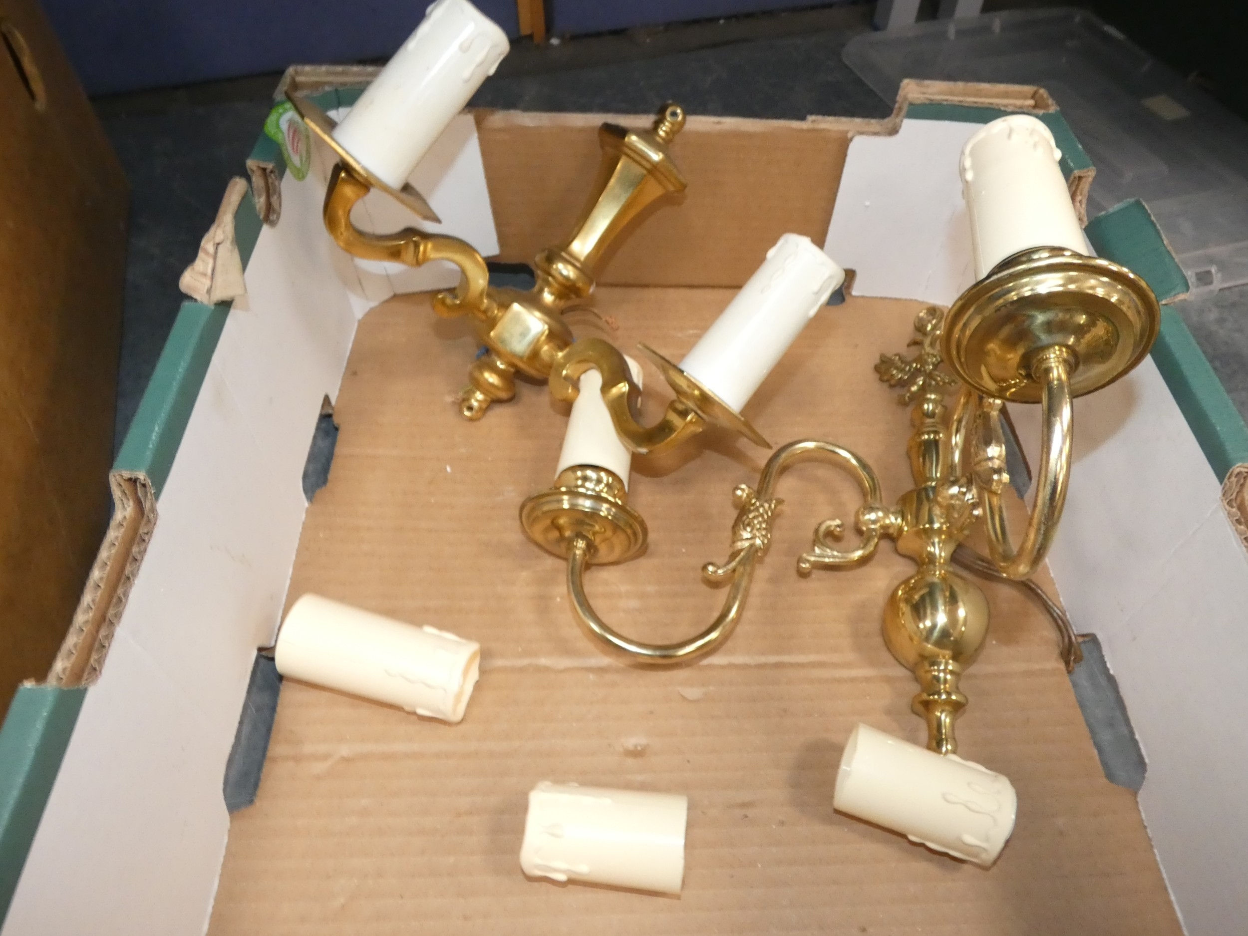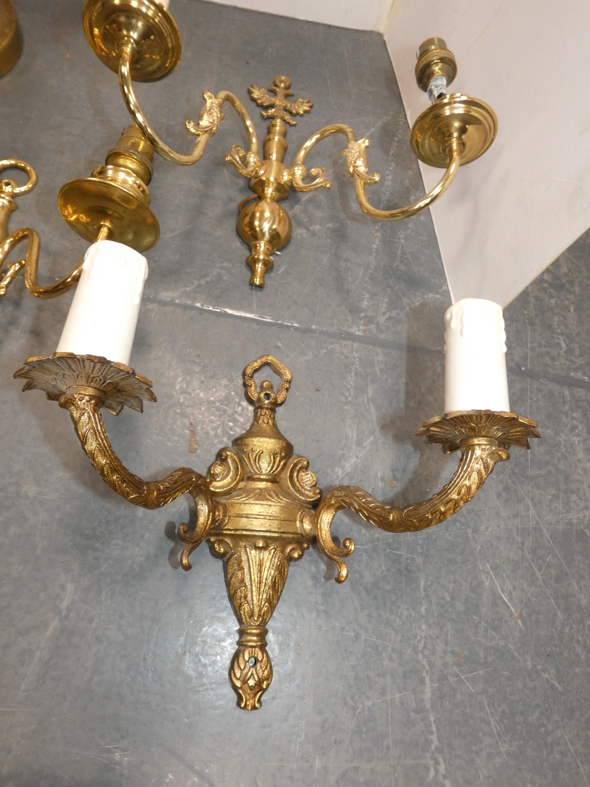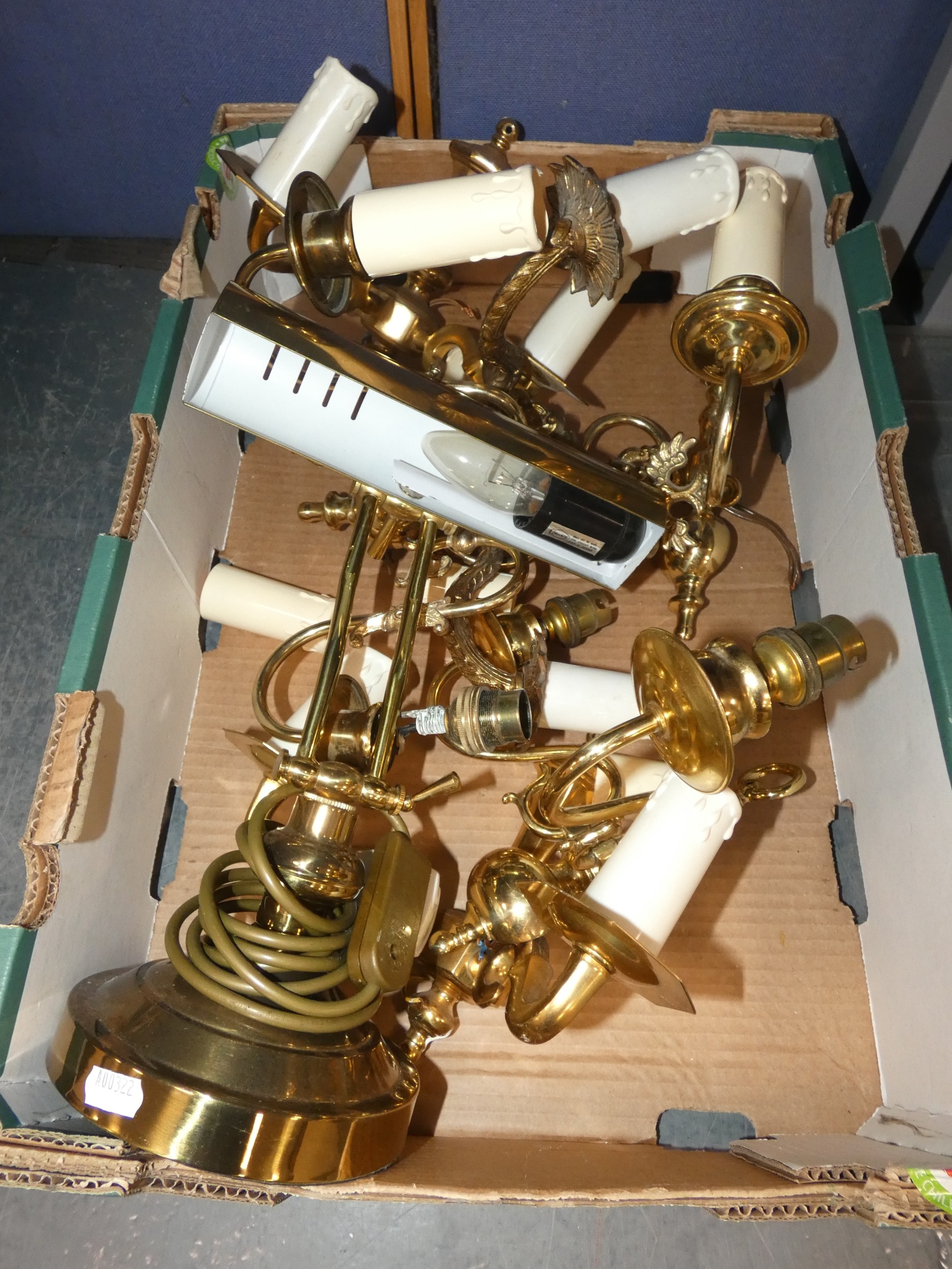 Assorted wall sconces, and a banker's-style lamp.