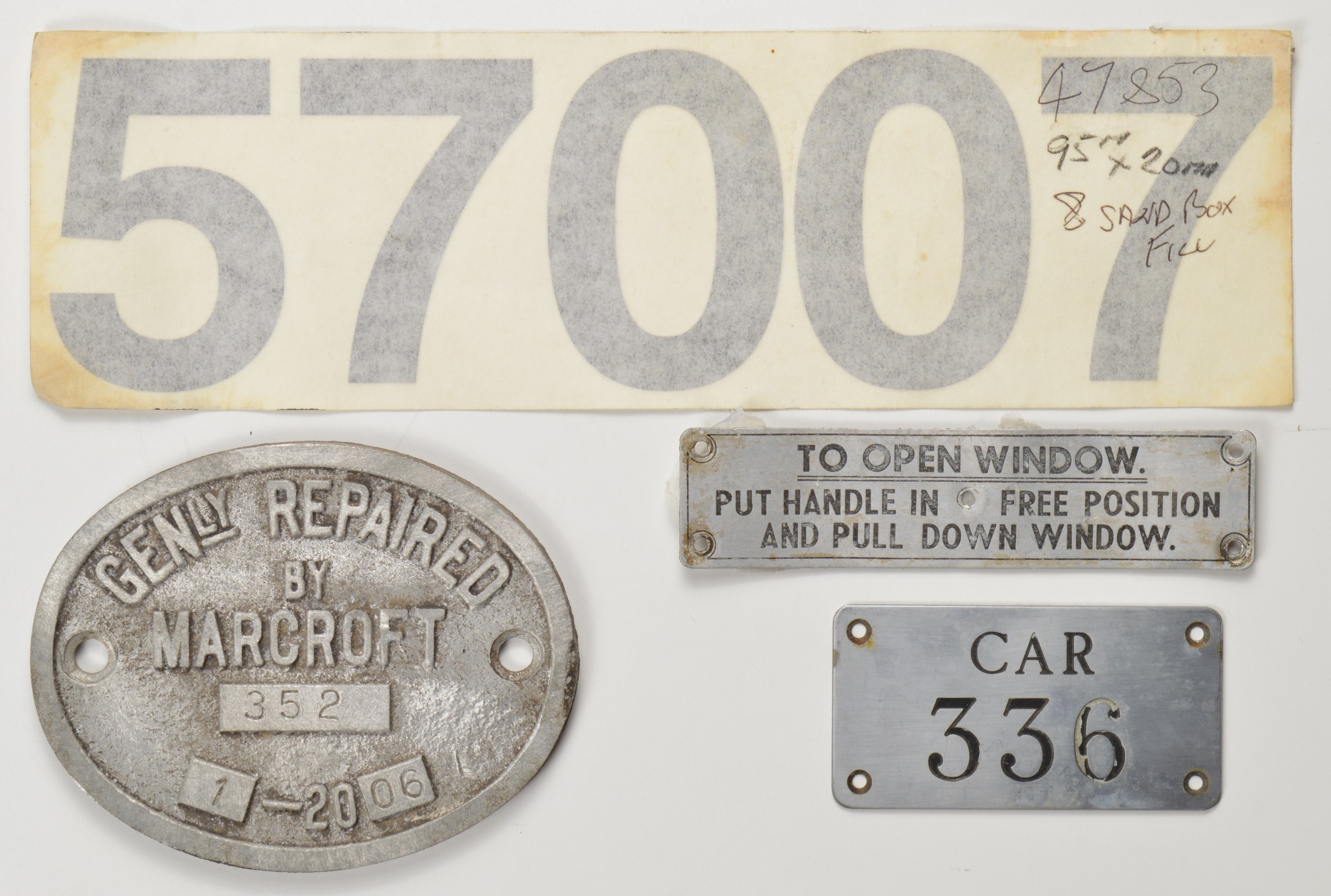 Mixed lot. Class 57007 small TOPS number decal, 11 1/2 x 3 1/2 inches; alloy GENLY REPAIRED MARCROFT 2006 plate, 5 x 4 inches; stainless steel CAR 339, 3 1/2 x 2 7/8 inches; alloy TO OPEN WINDOW plate, 5 1/4 x 1 1/4 inches. 4 items. Shipping band - B.