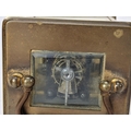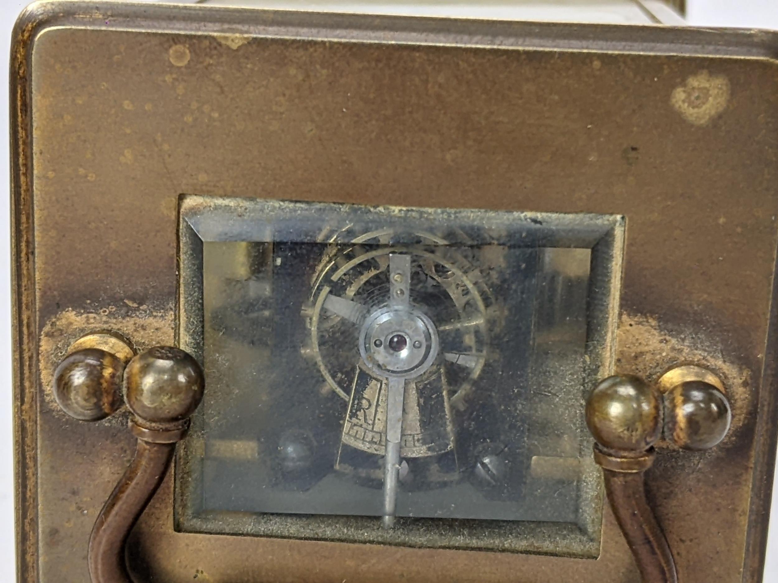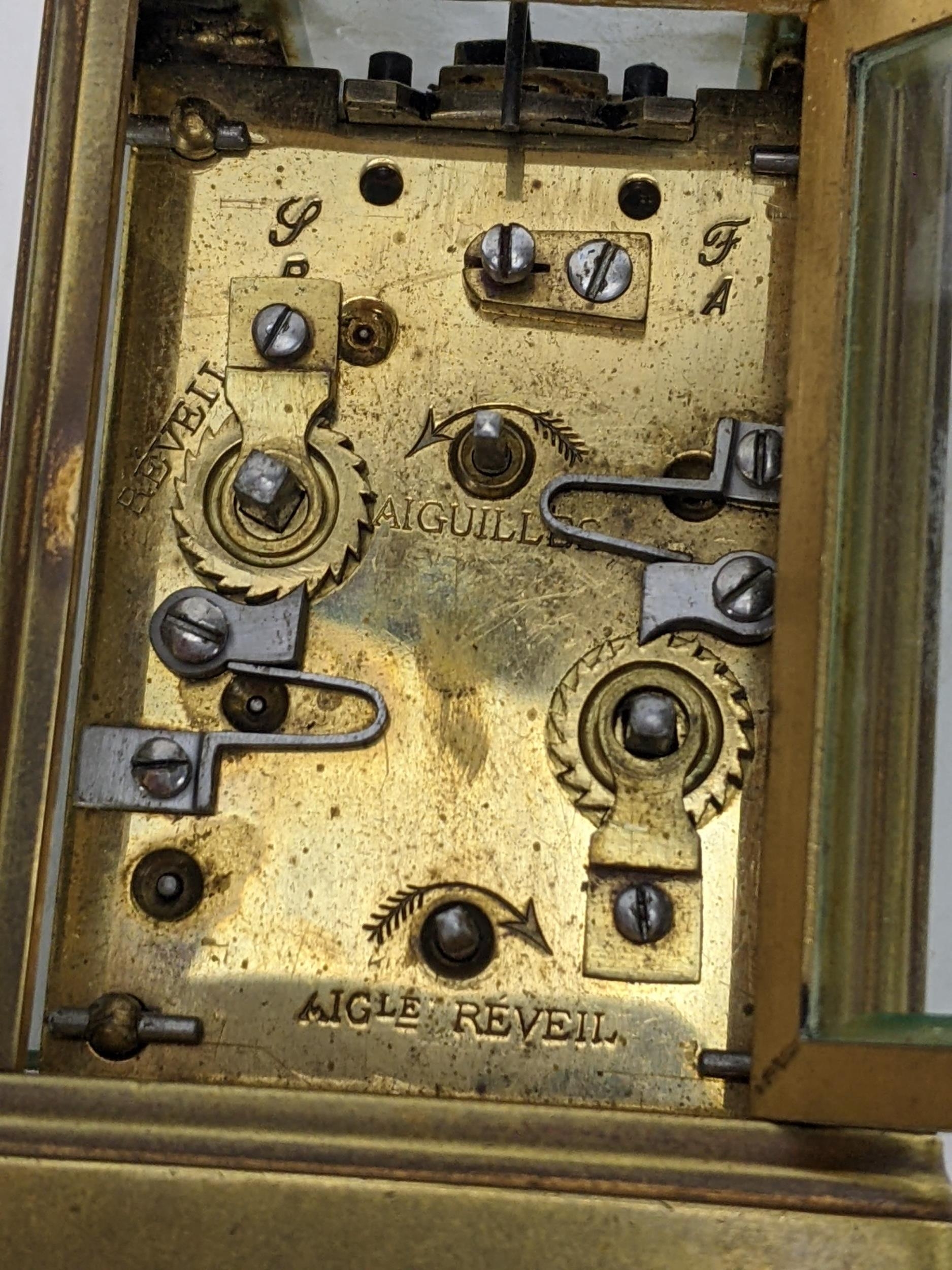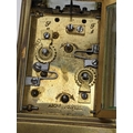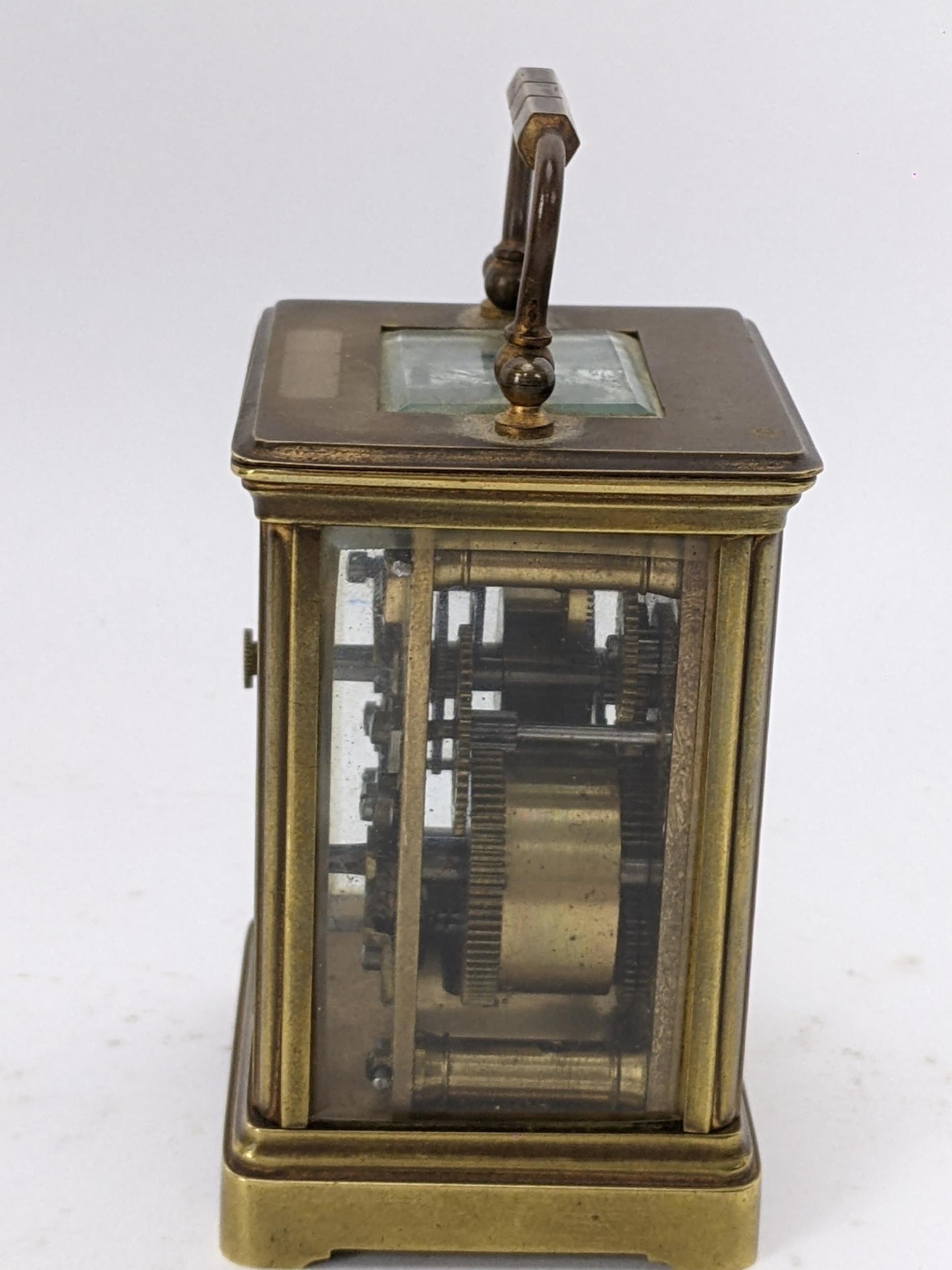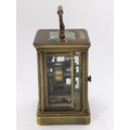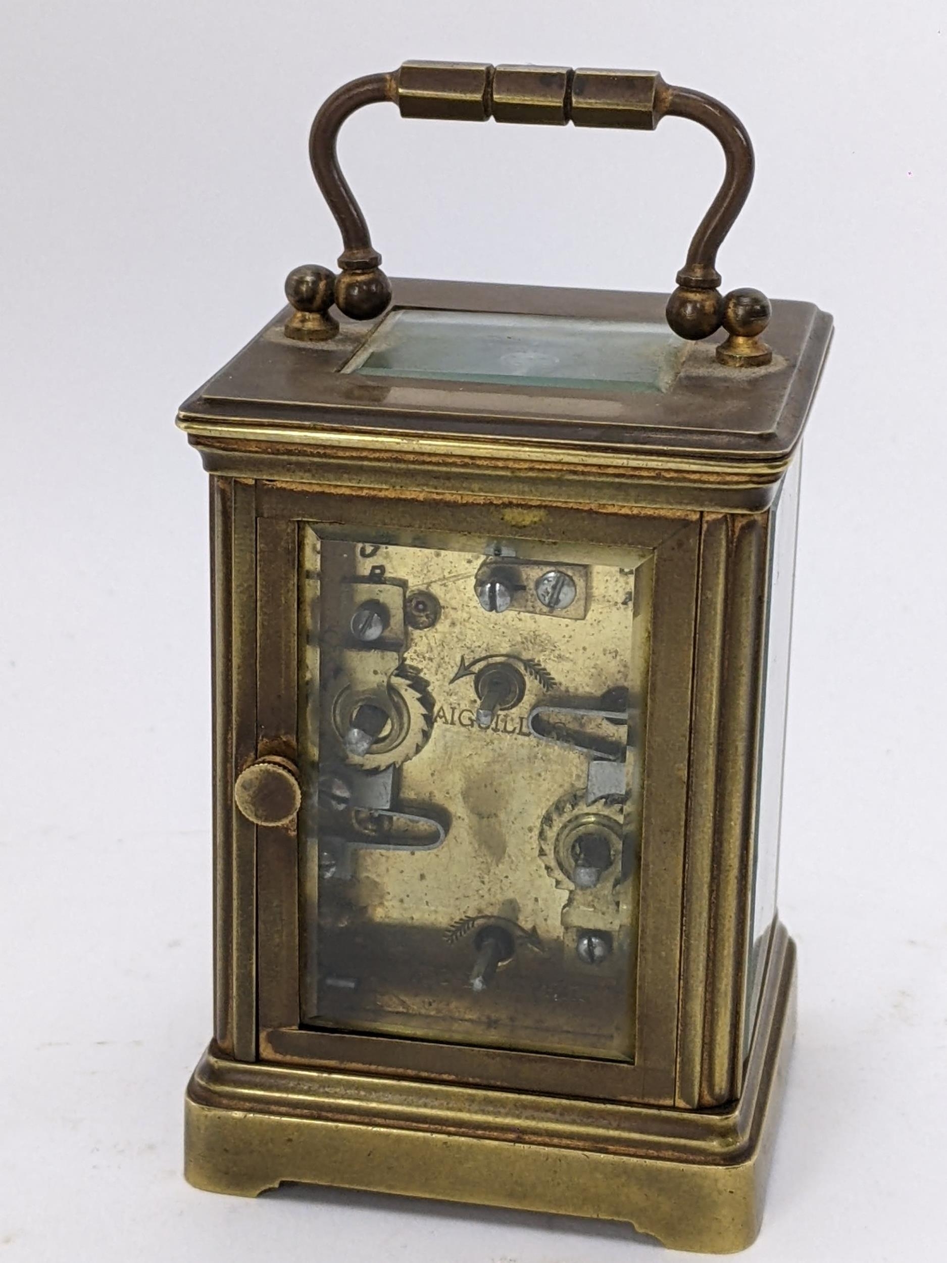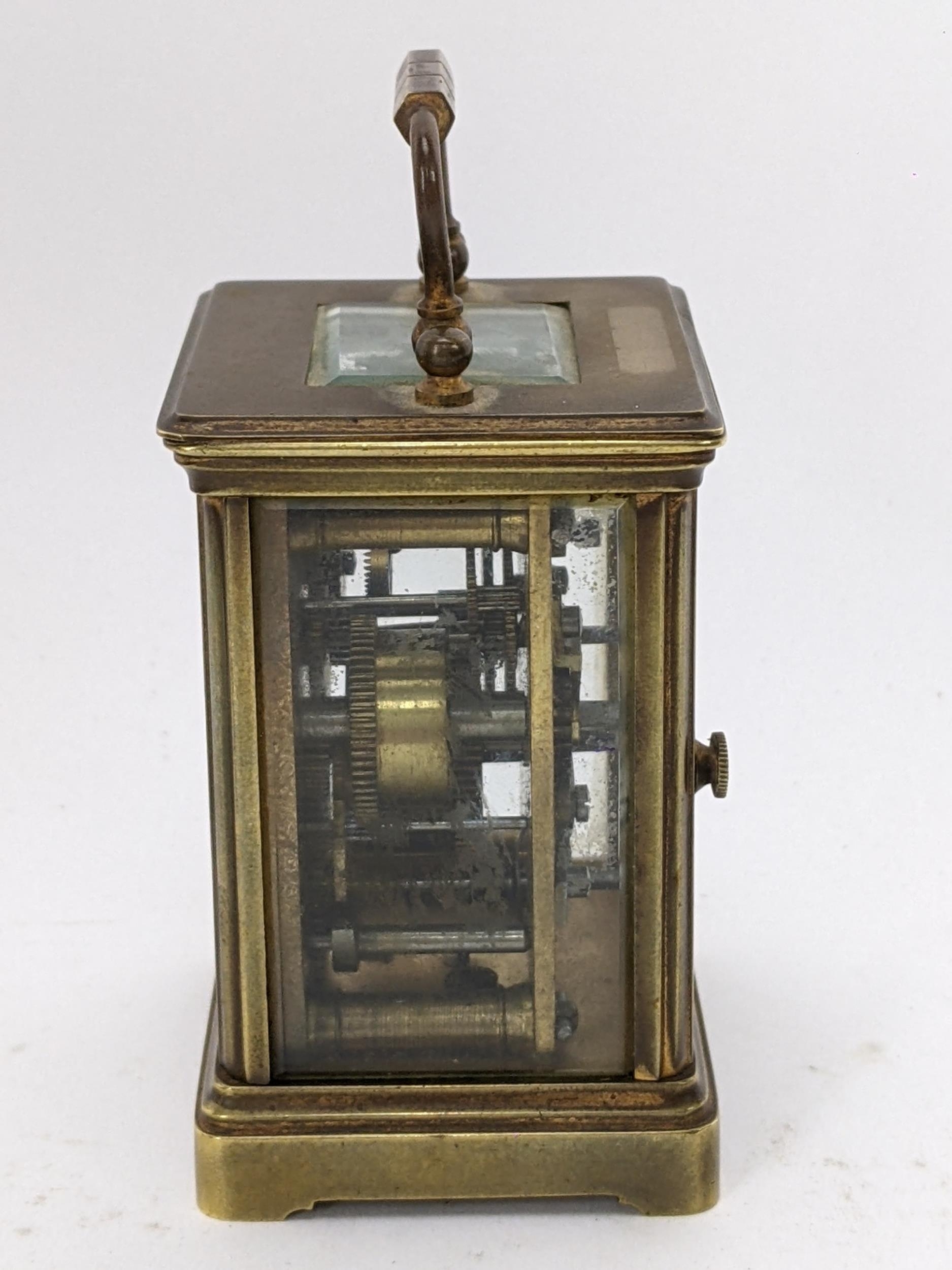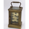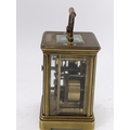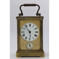 A 19th century French brass miniature carriage alarm clock, the white enamel dial having black Roman numerals above an alarm dial with Arabic numerals, the lever escapement movement having bell to the underside, 10.5cm high including handle x 5.5 cm wide