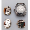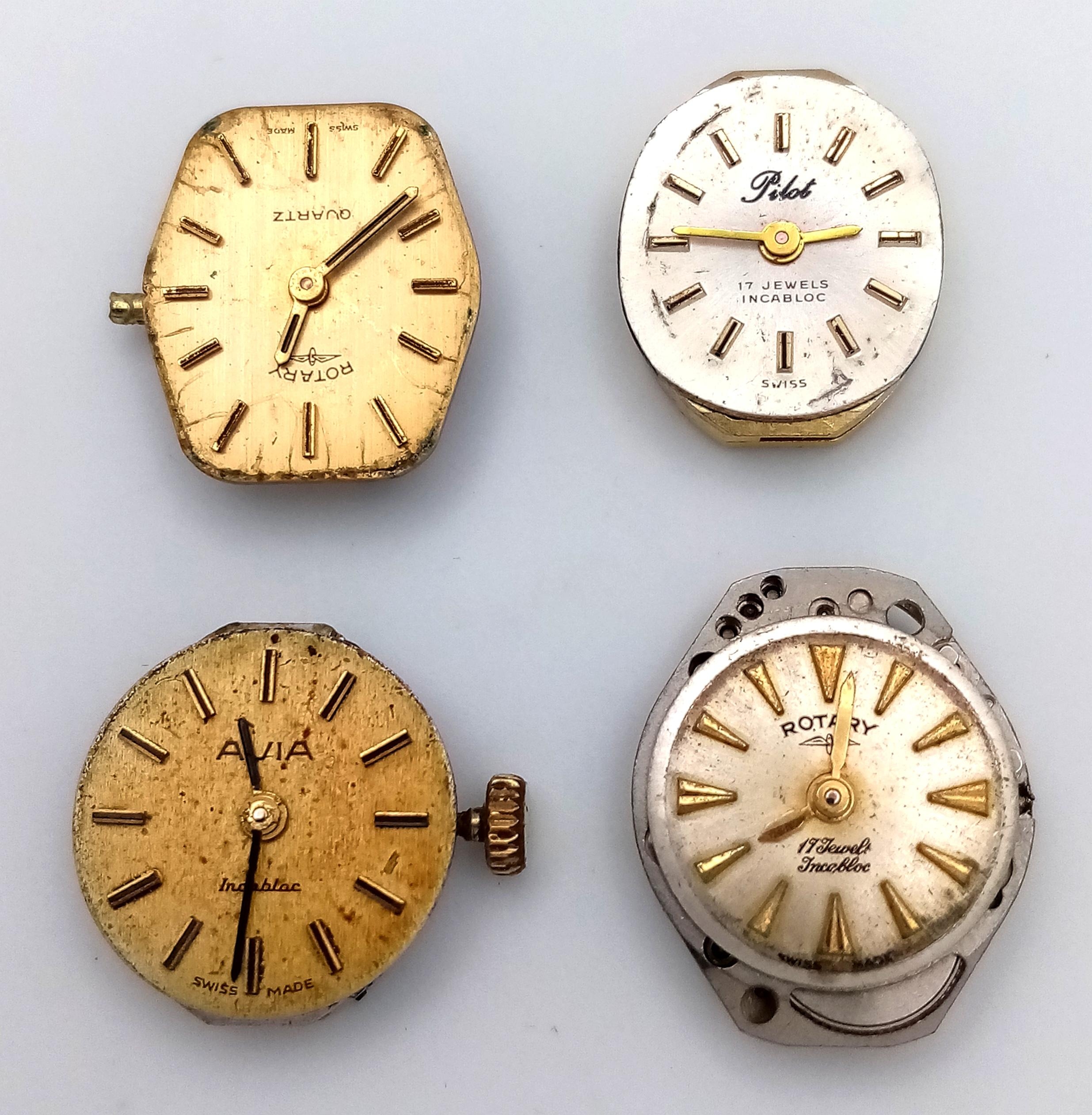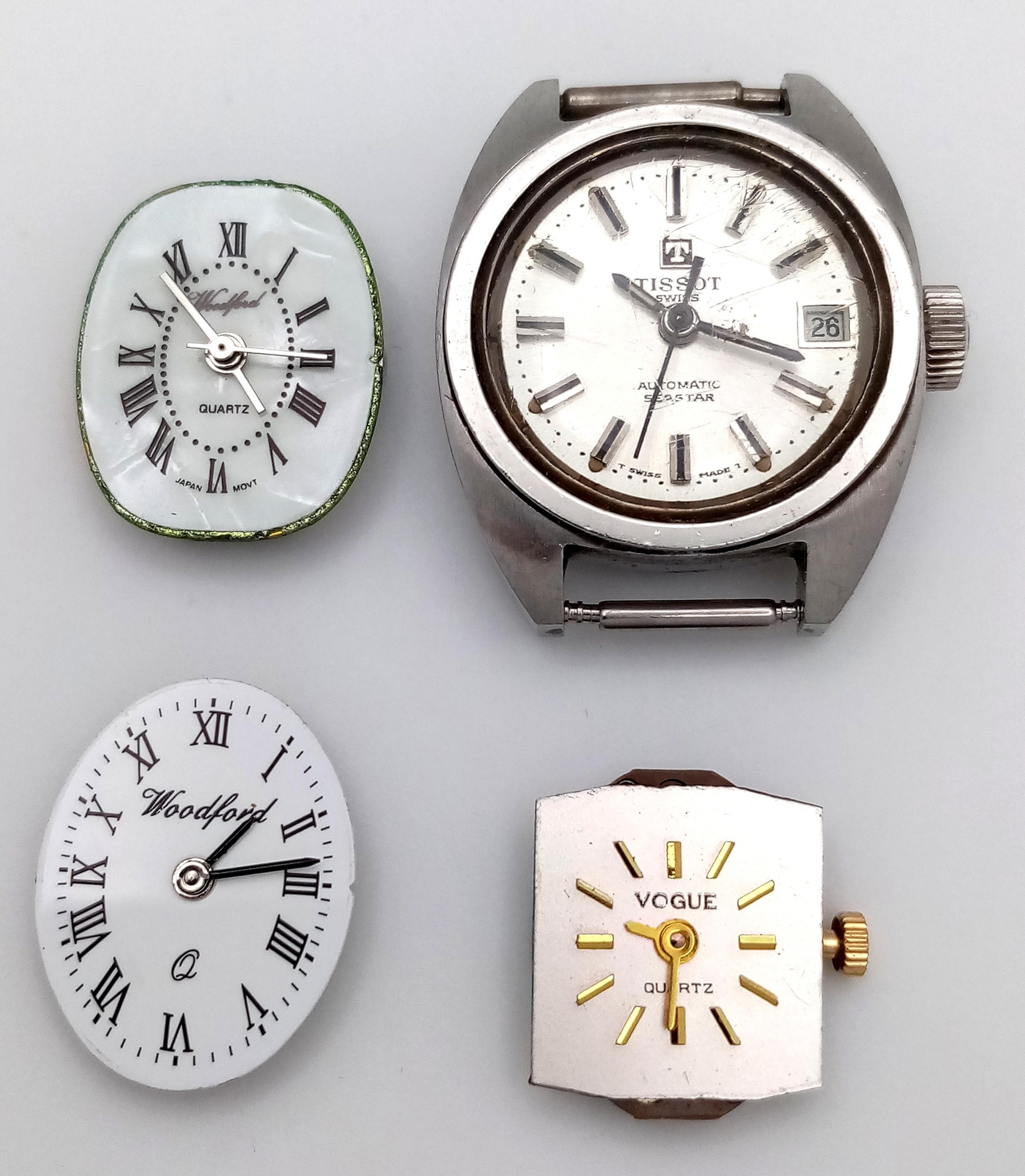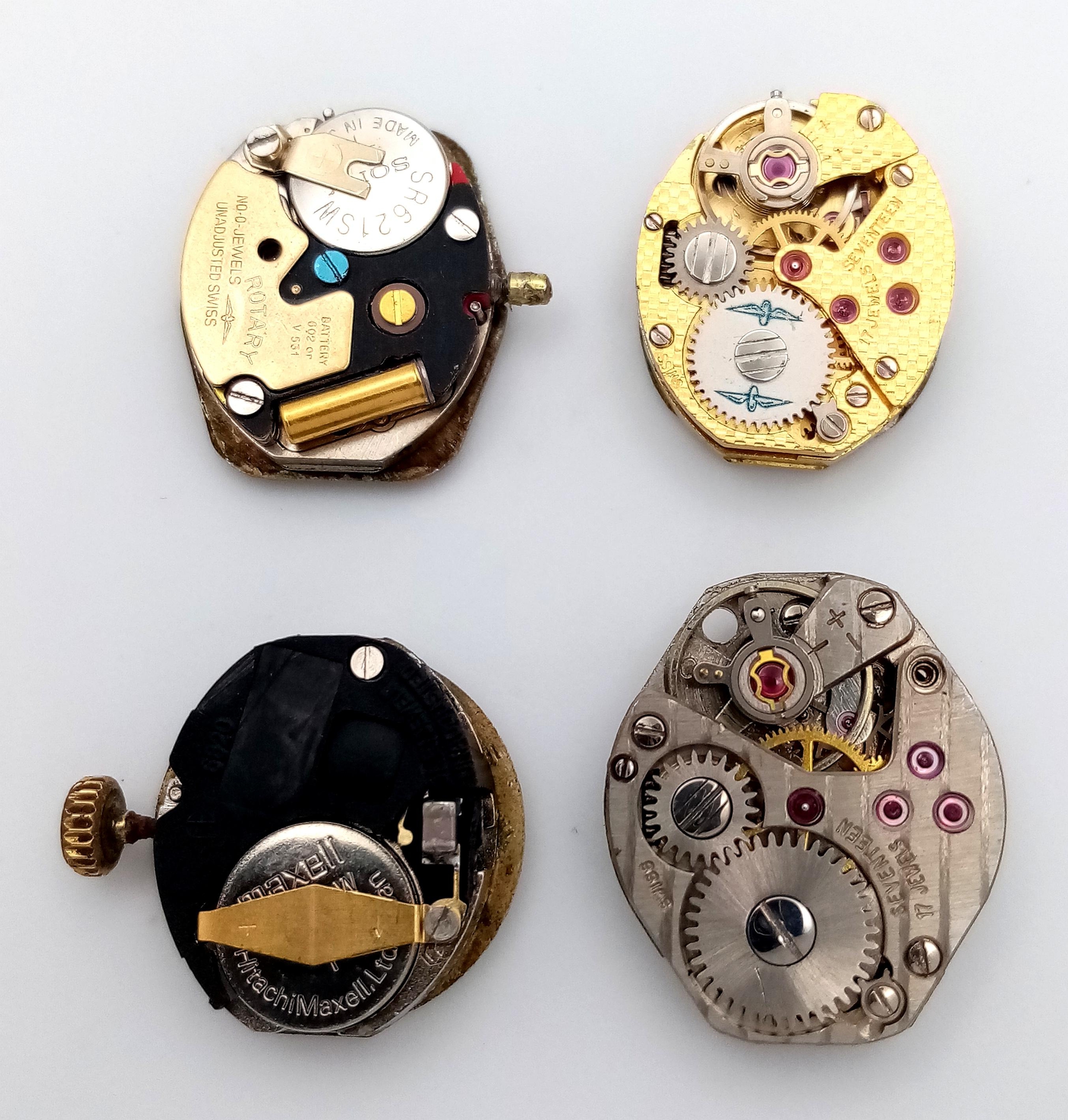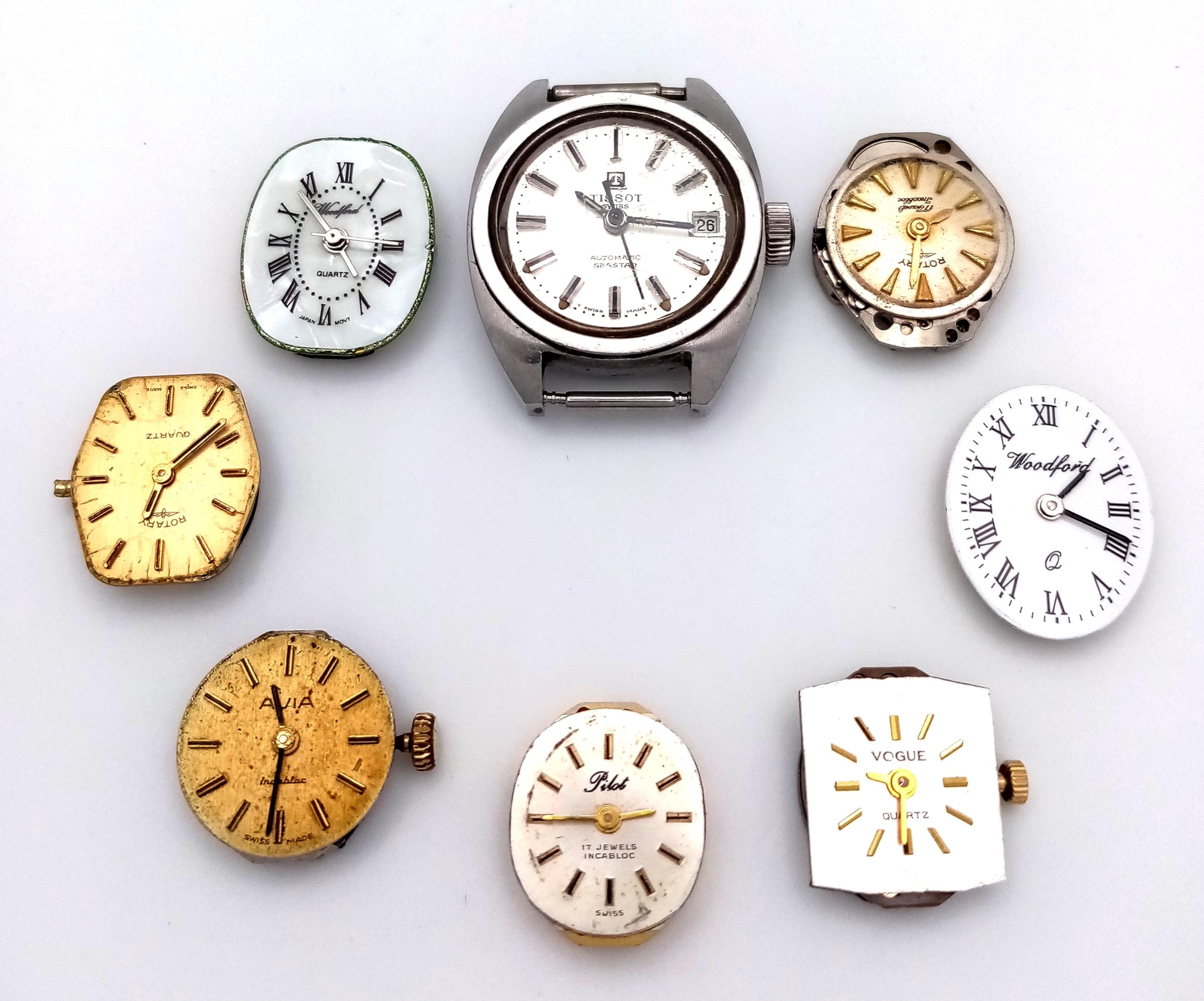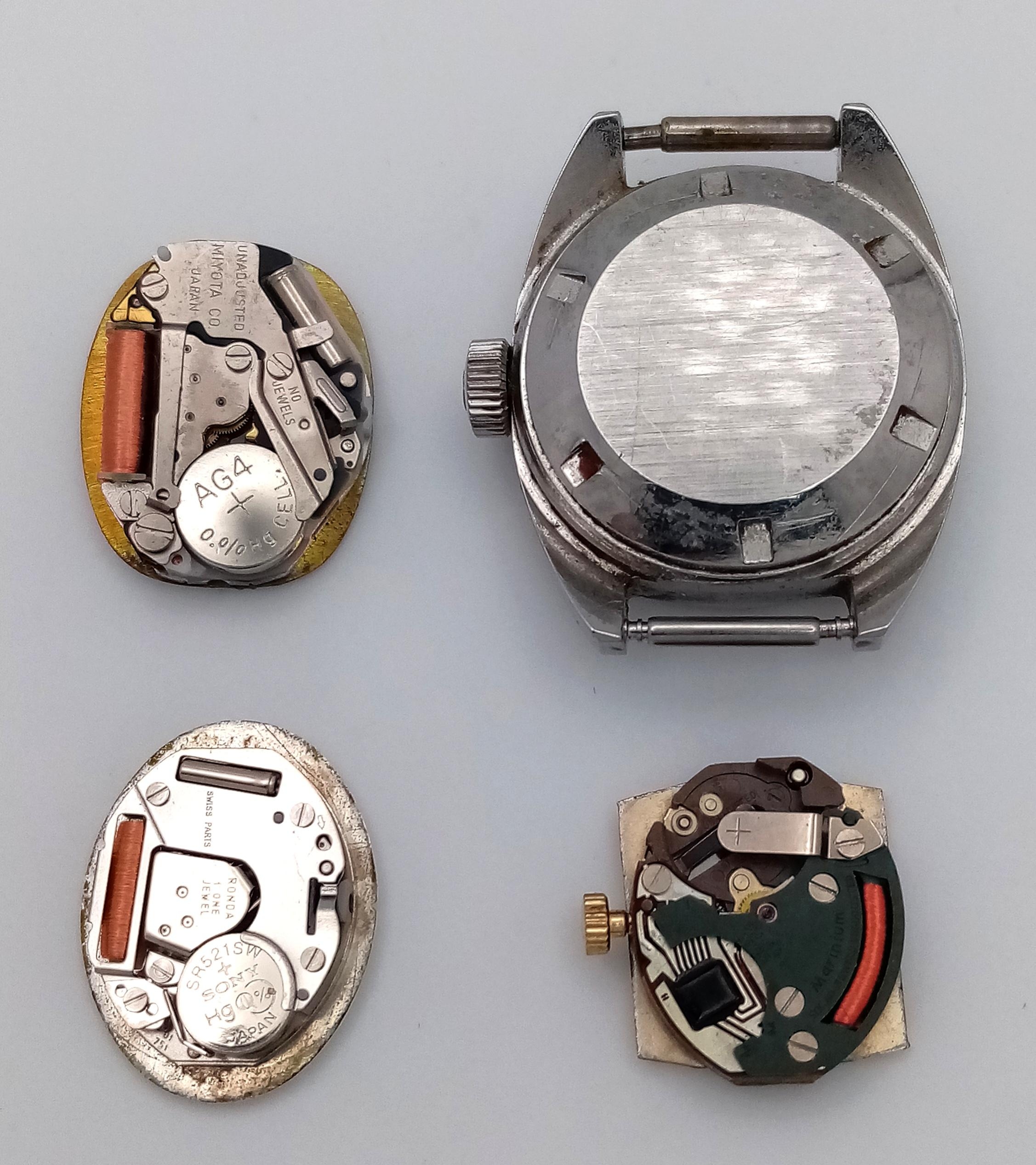 An assortment of watch movements and dials, including various designs and brands, as found. Perfect for restoration or watchmaking projects.