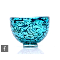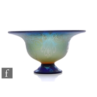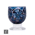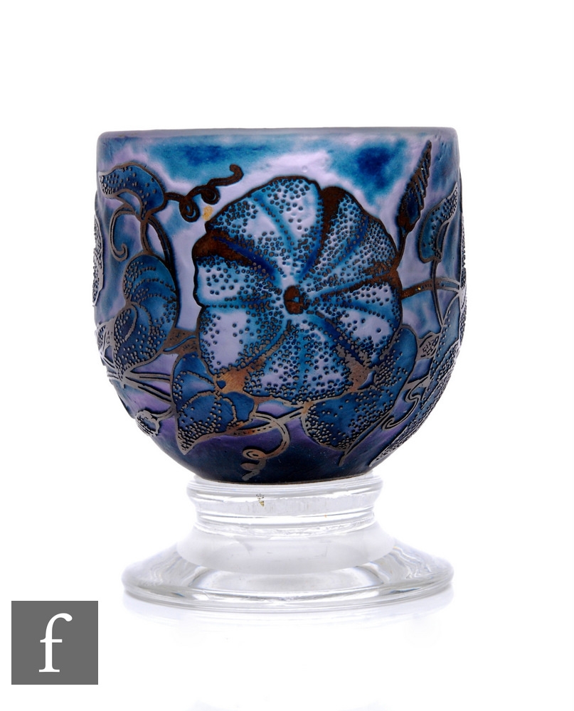 Jonathon Harris - Ironbridge - A cameo glass 'Moonflower' Trial bowl, of ovoid footed form, silvered mottled green convolvulus flowers and leaves over amethyst and green ground, on clear glass knopped stem and foot, engraved signature and dated 2002, height 9cm.