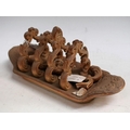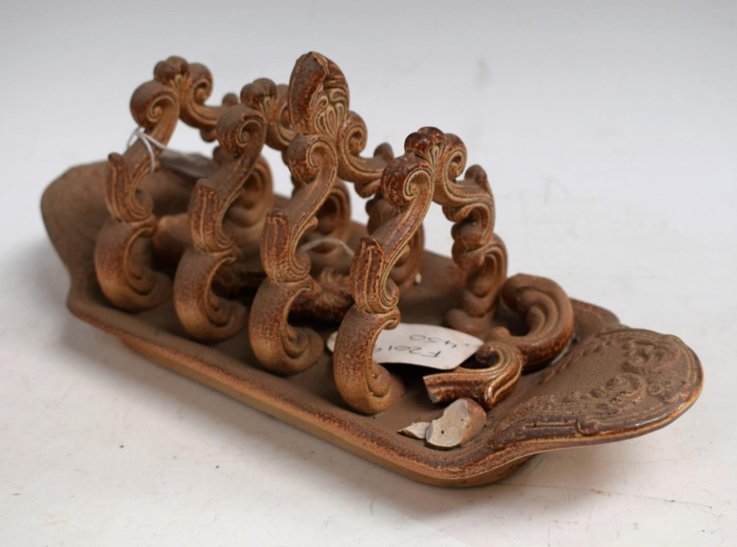 A Brampton Derbyshire brown salt glazed stoneware five bar toast rack, scroll divisions, boat shaped base moulded in relief with scrolls, 25cm wide, c.1840