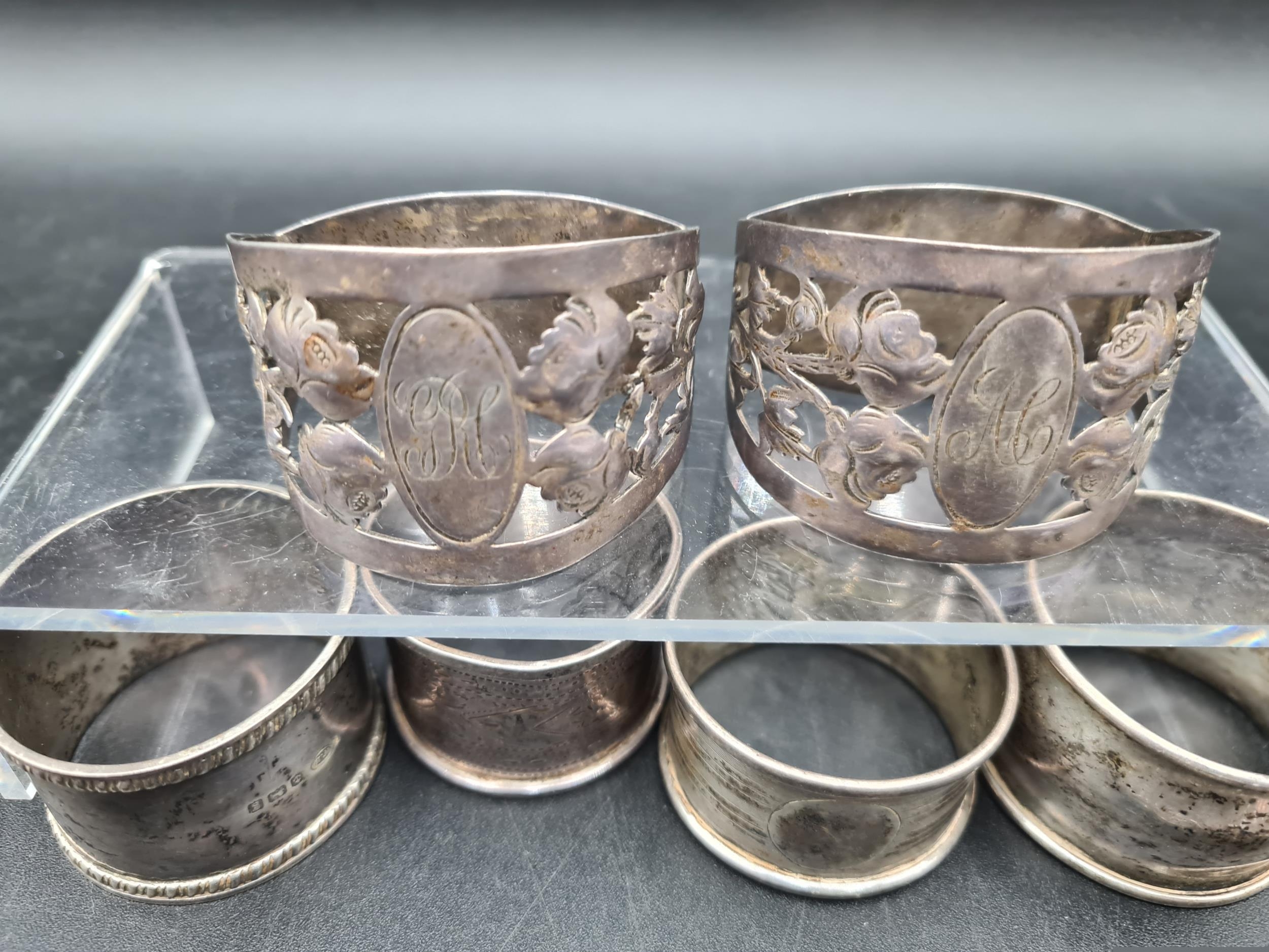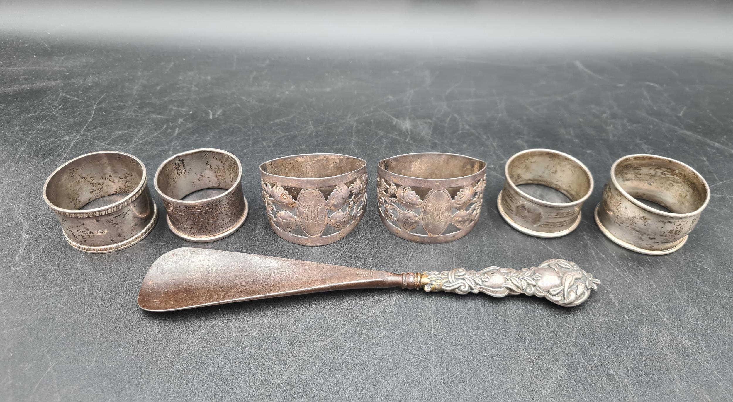 A pair of Edward VII silver Napkin Rings with pierced floral design and initials, Birmingham circa 1905, four other silver Napkin Rings and a silver handled Shoe Horn