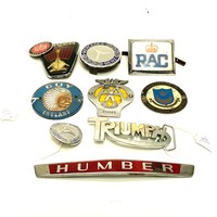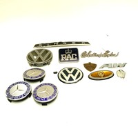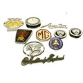 Collection of car badges including: Rover, Jaguar and Mercedes Benz.