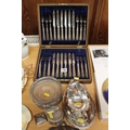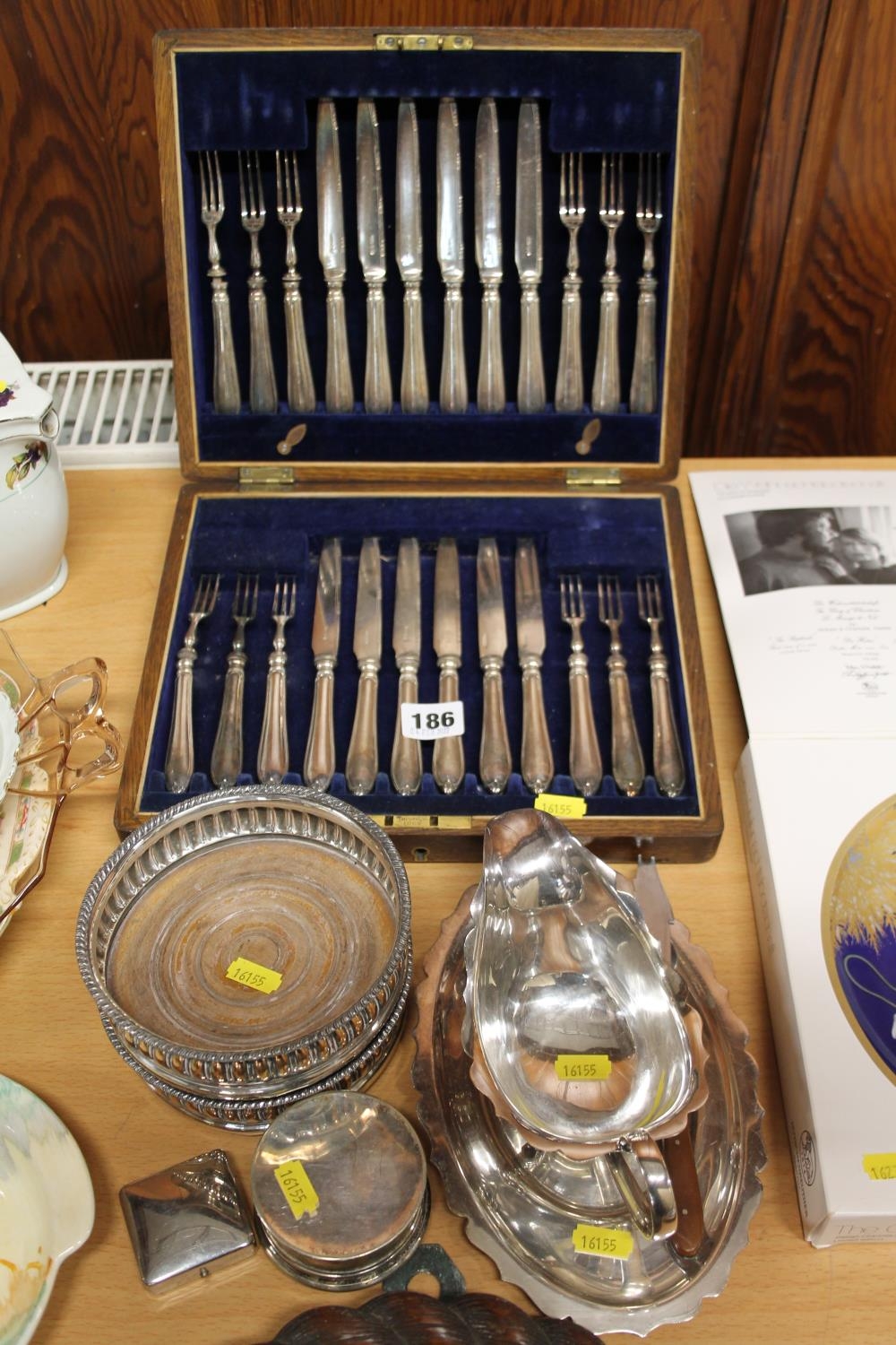 Silver-plated knives and forks, a wine slide, a gravy boat, etc.