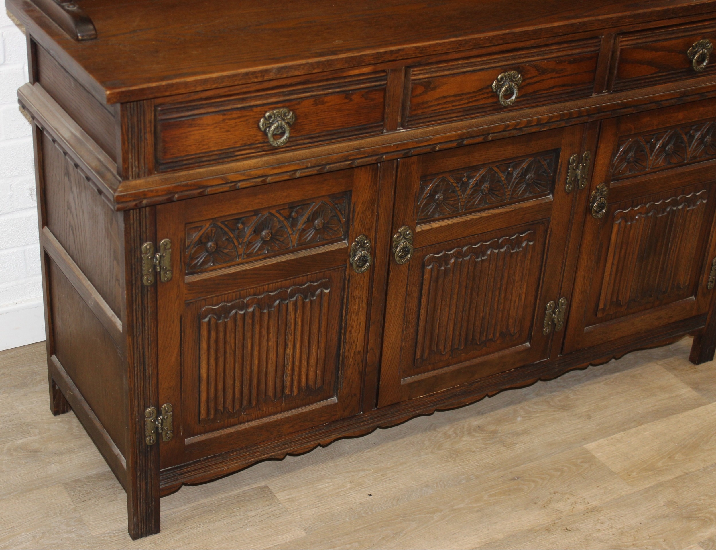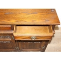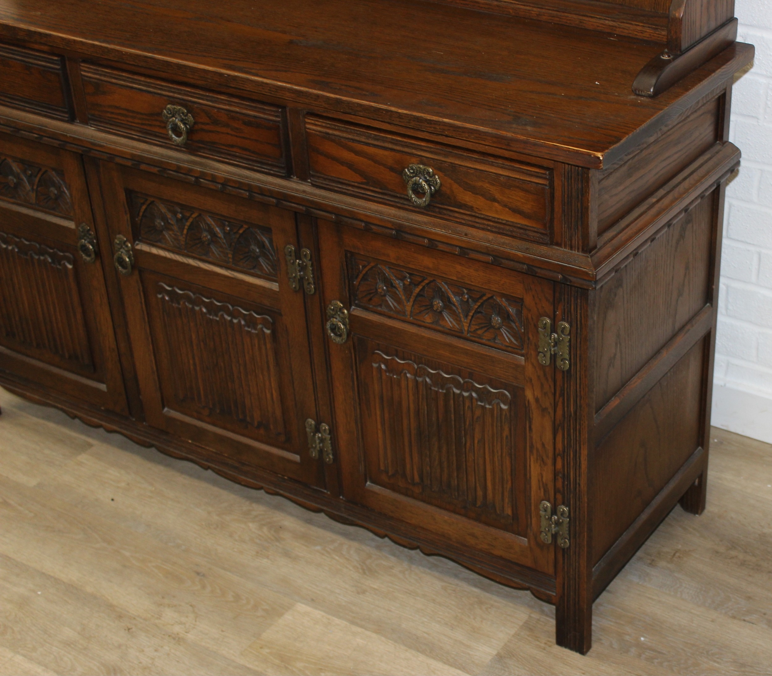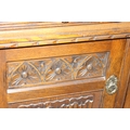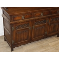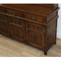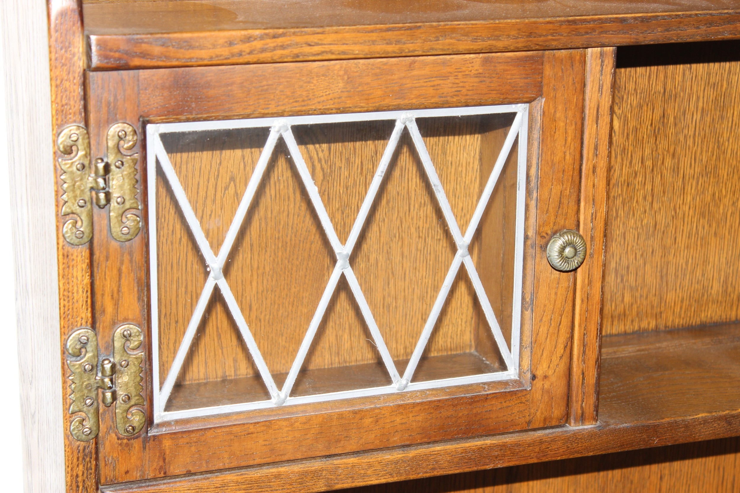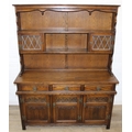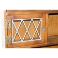 An antique style oak dresser with leaded glazed doors, likely either Ercol or Old Charm, 136cm x 44cm x 176cm
