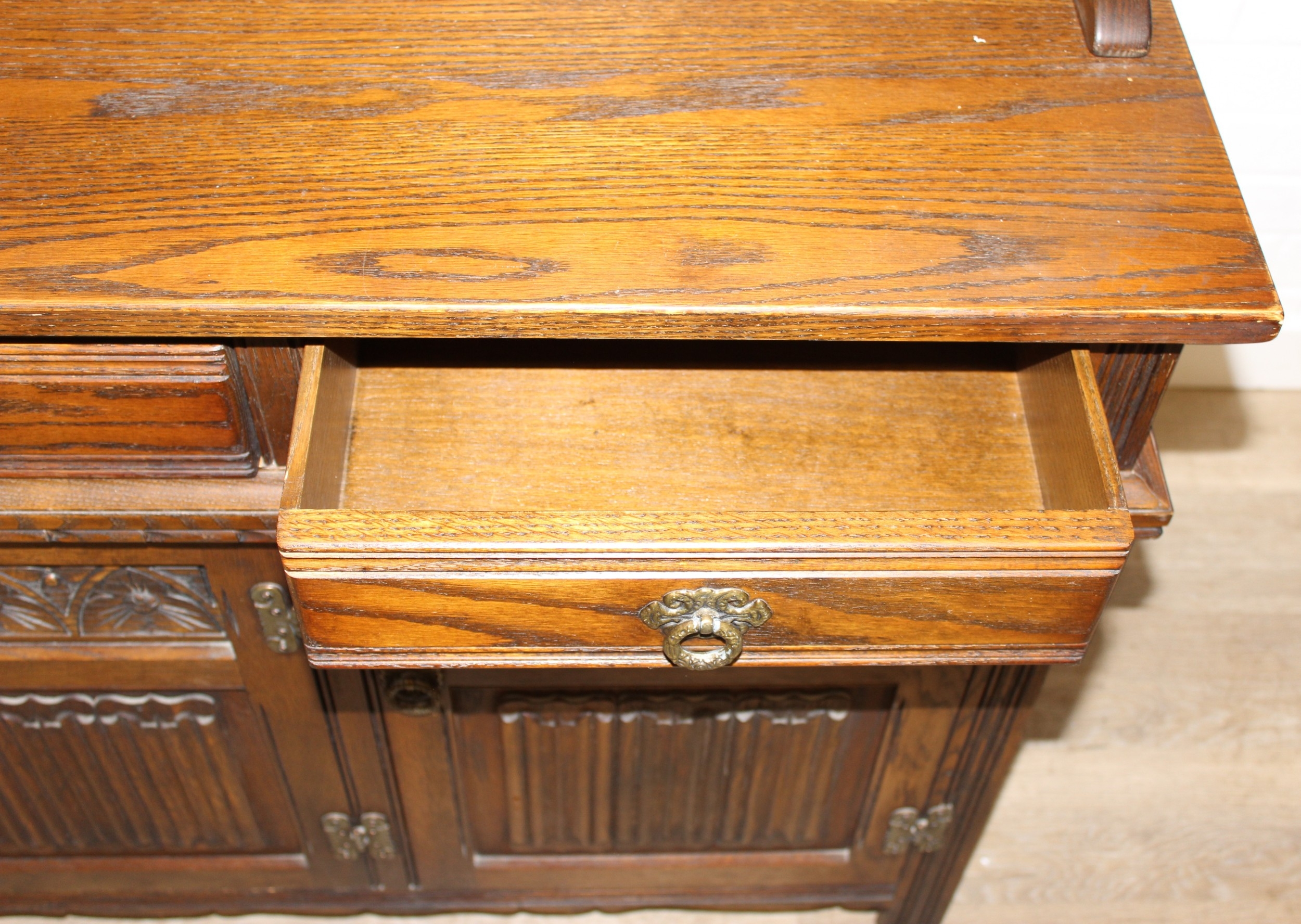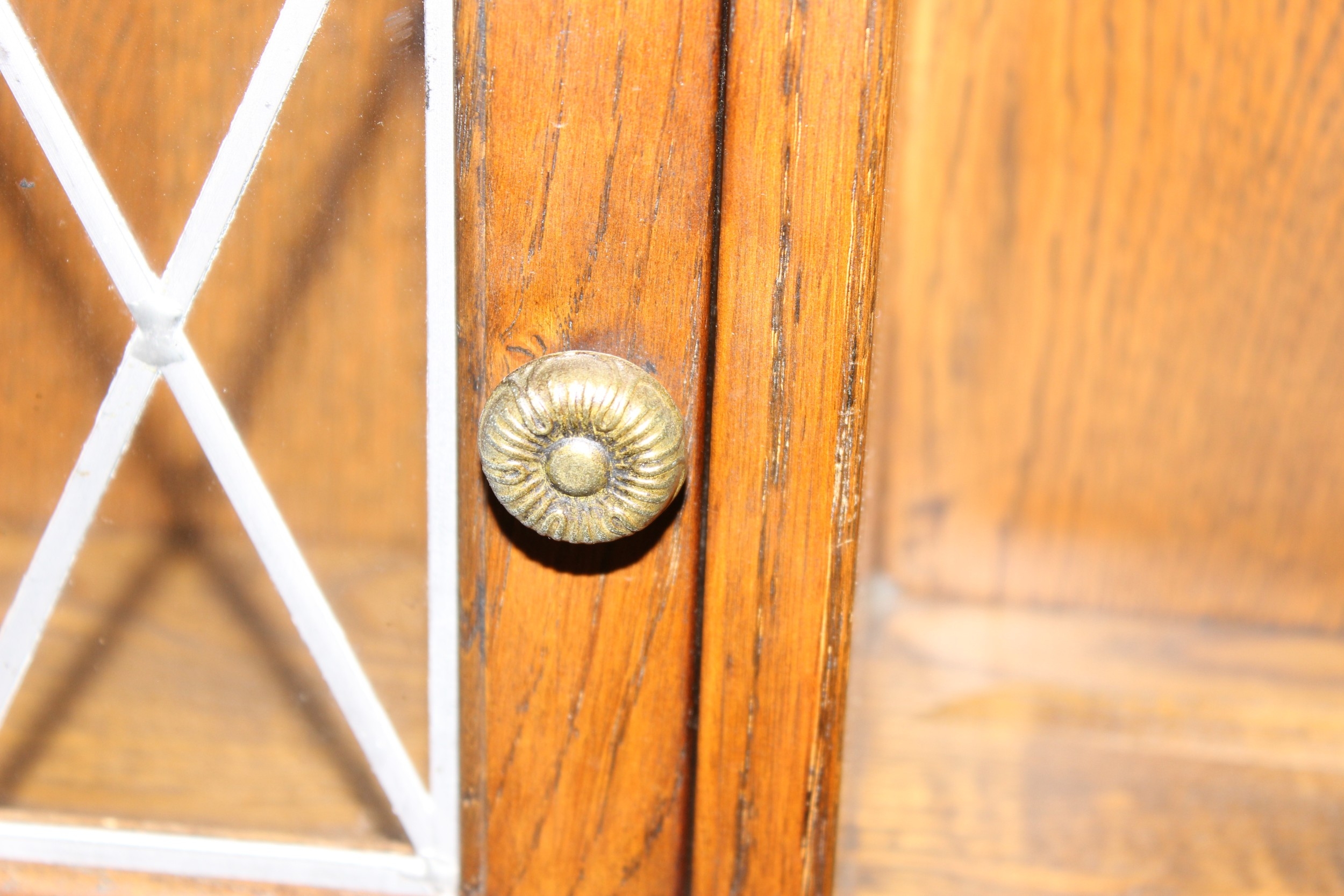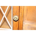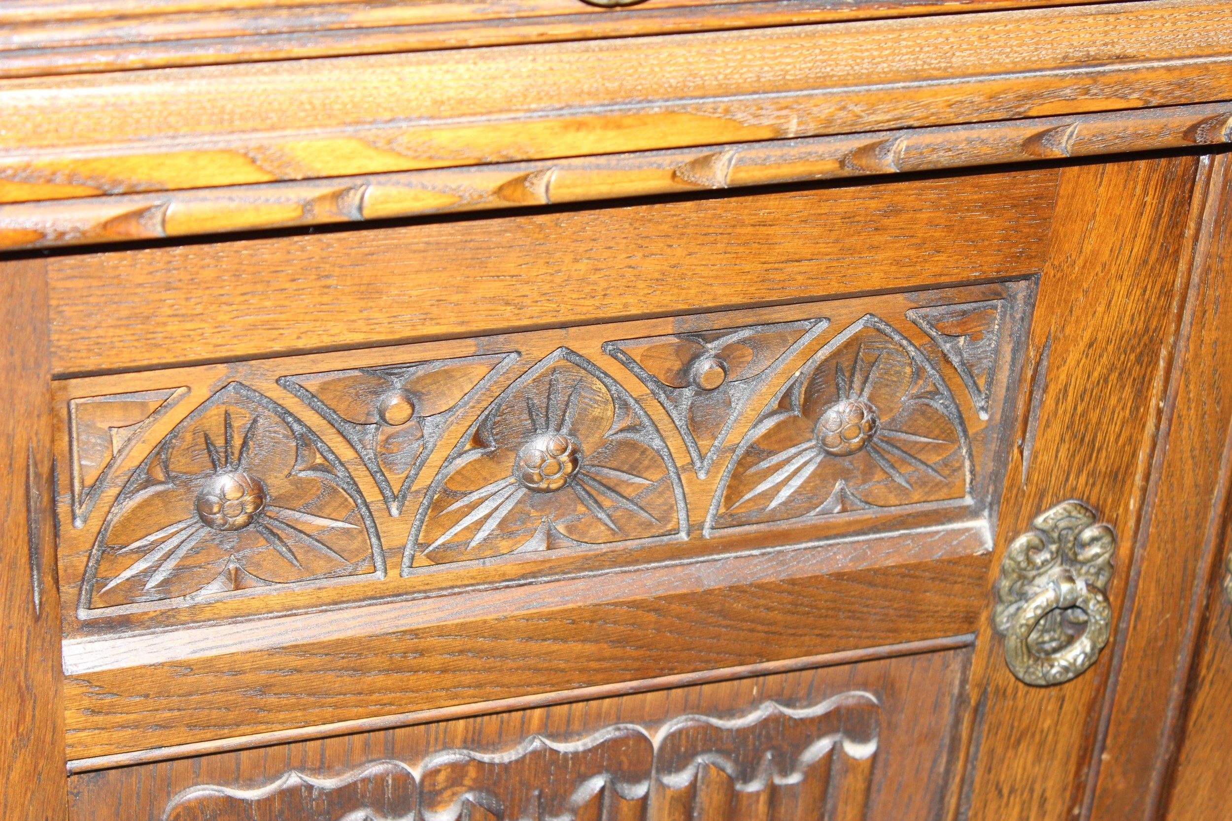 An antique style oak dresser with leaded glazed doors, likely either Ercol or Old Charm, 136cm x 44cm x 176cm