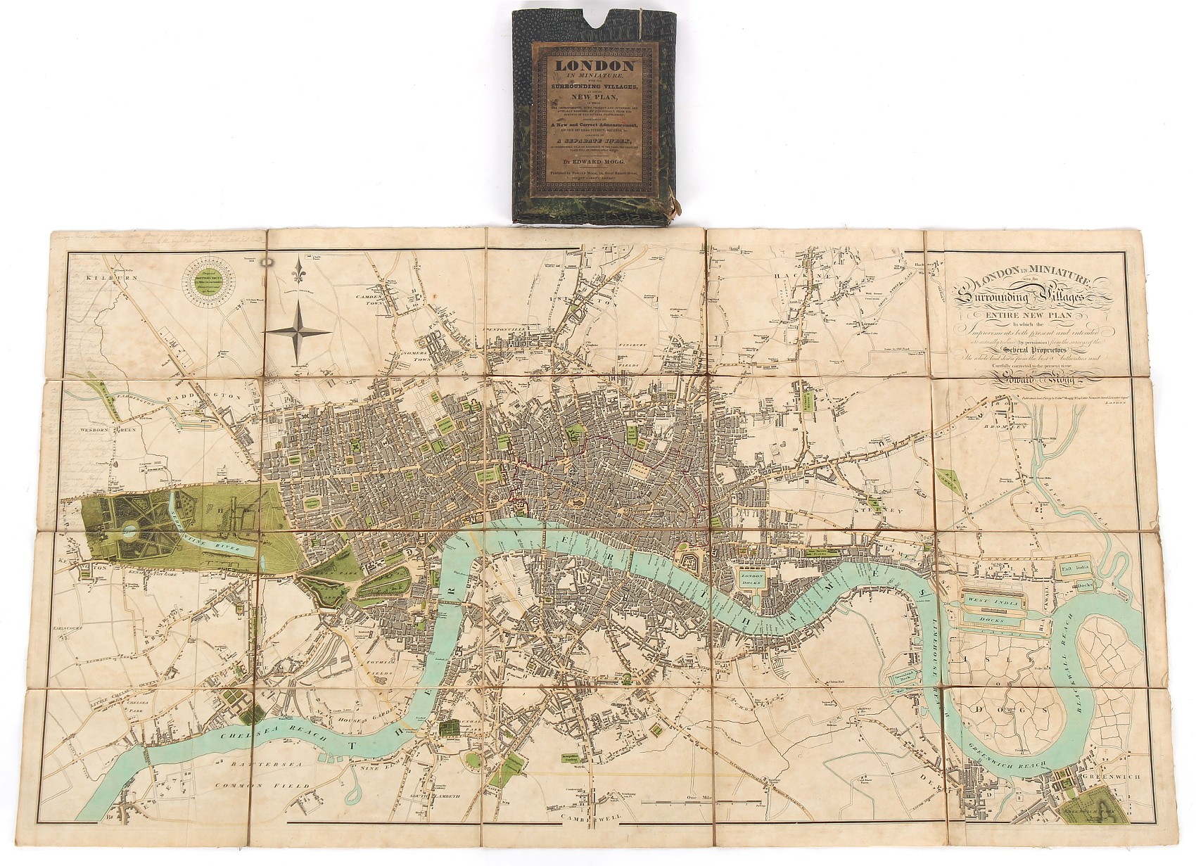 Property of a deceased estate - MOGG, Edward - 'London in Miniature, with the Surrounding Villages, An Entire New Plan' - a folding map with hand colouring, published 1st January 1809, 21.25 by 37.8ins. (54 by 96cms.) (overall), in original marbled slip-case with printed label. Provenance - Francis Woodland Reader (1864-1951), and thence by family descent.