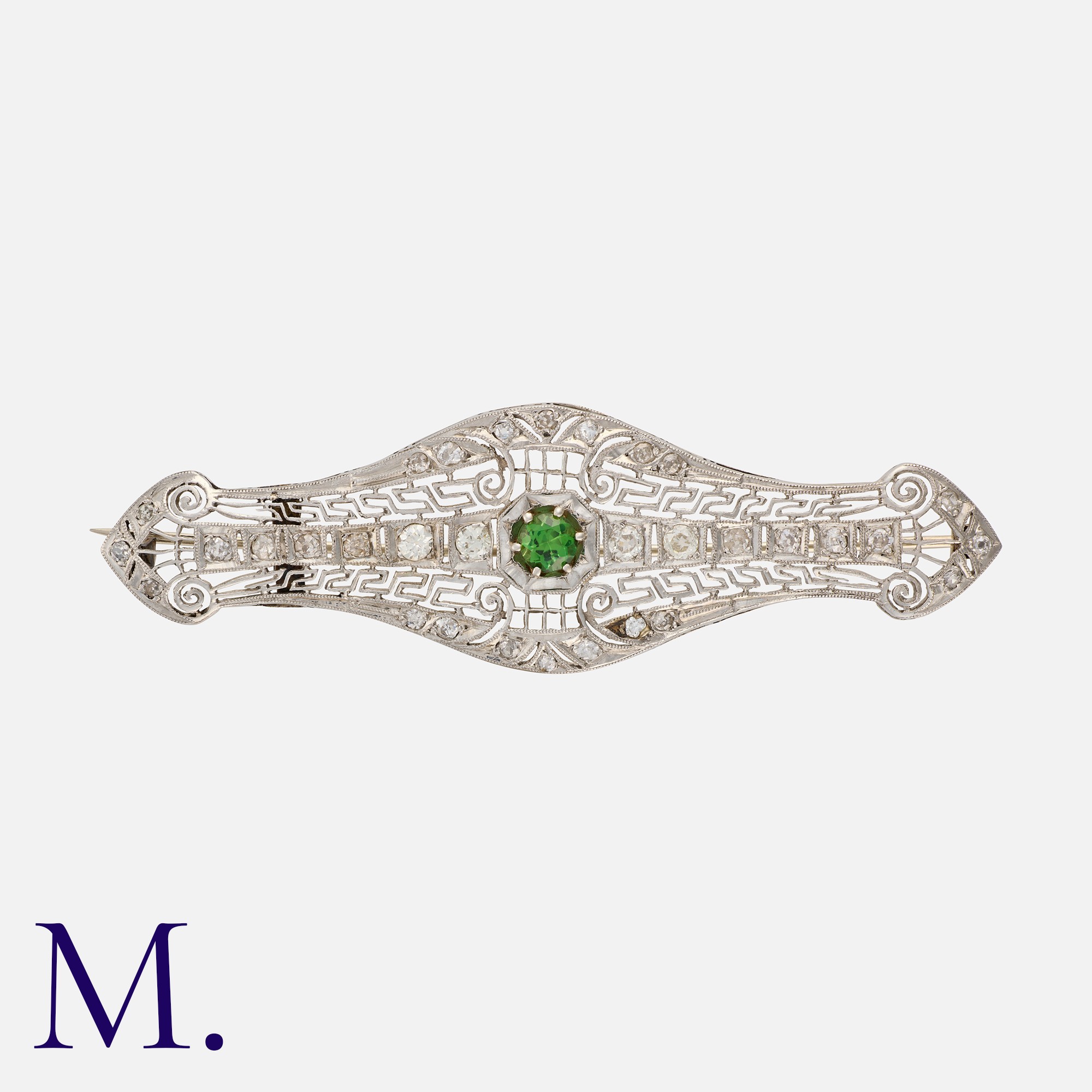 A Green Garnet and Diamond Brooch, in 14 carat white gold, the openwork, geometric brooch set with old cut diamonds and a central round cut green garnet. Marked 14K.