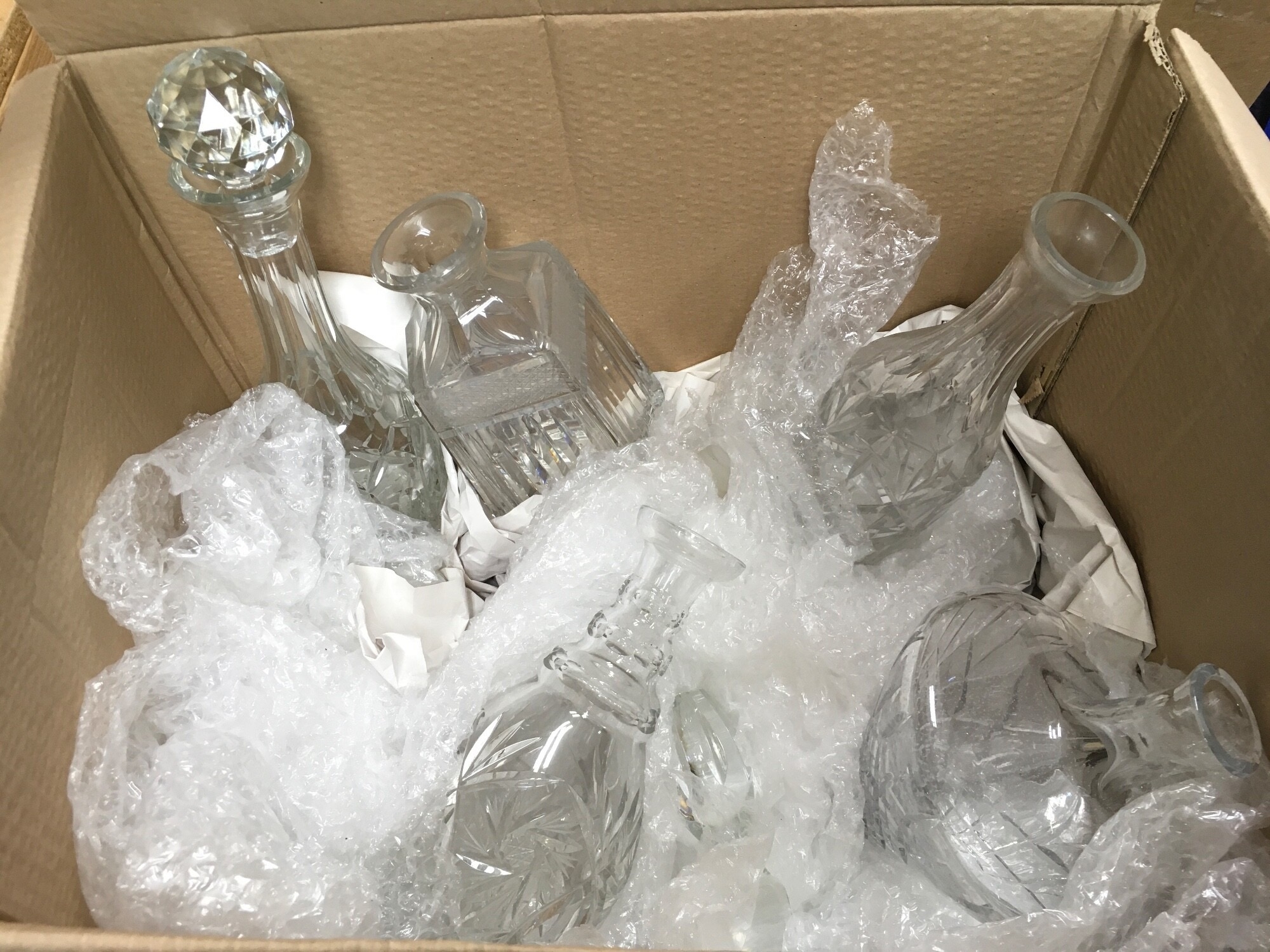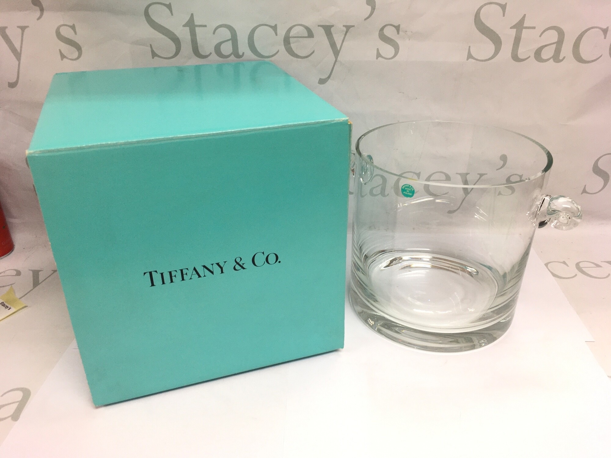 A boxed Tiffany & Co crystal ice bucket and various glass decanters and stoppers.