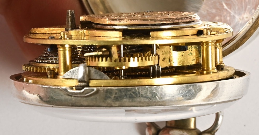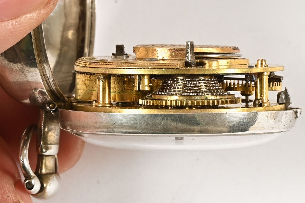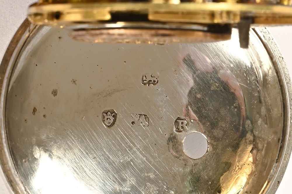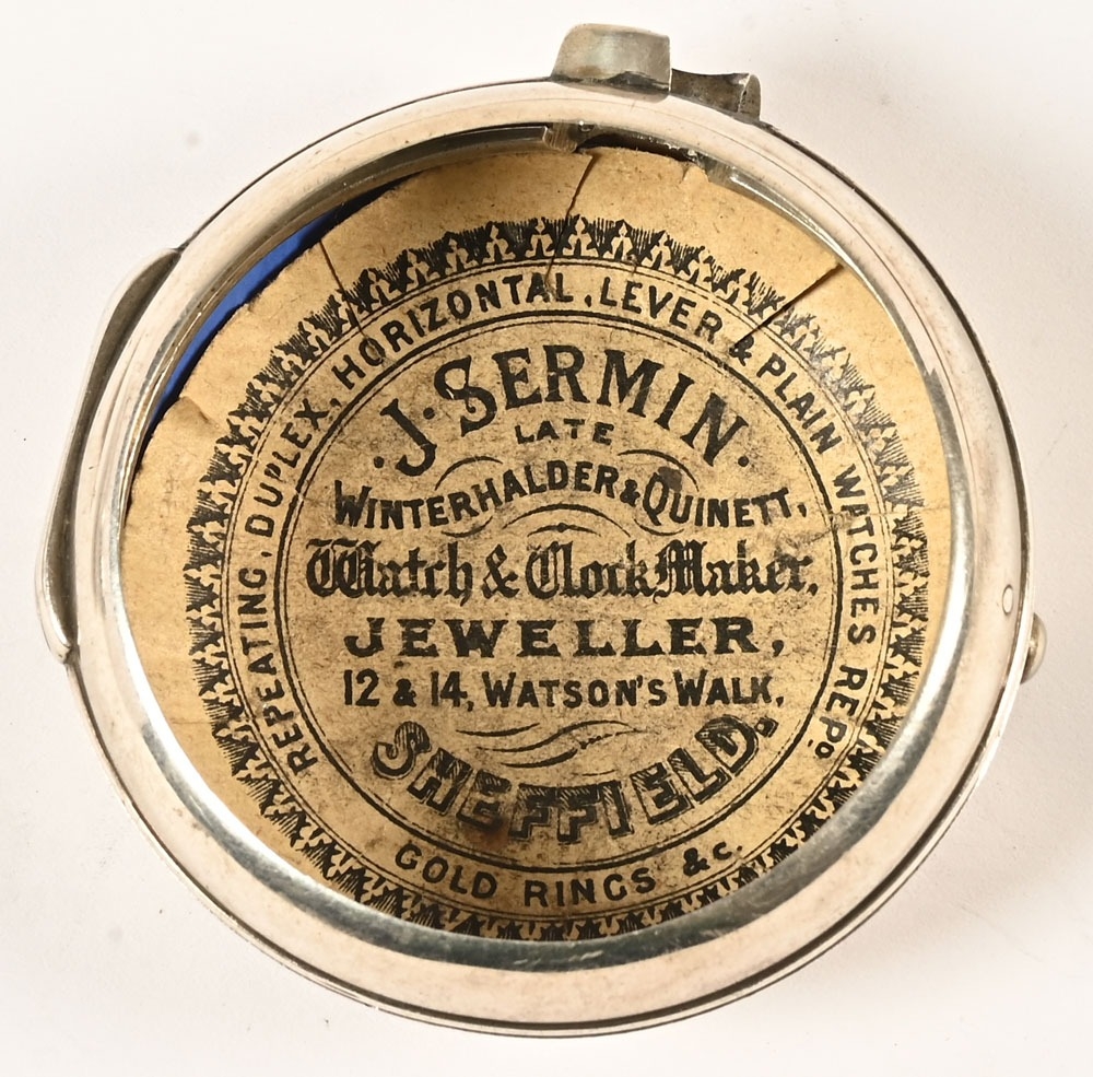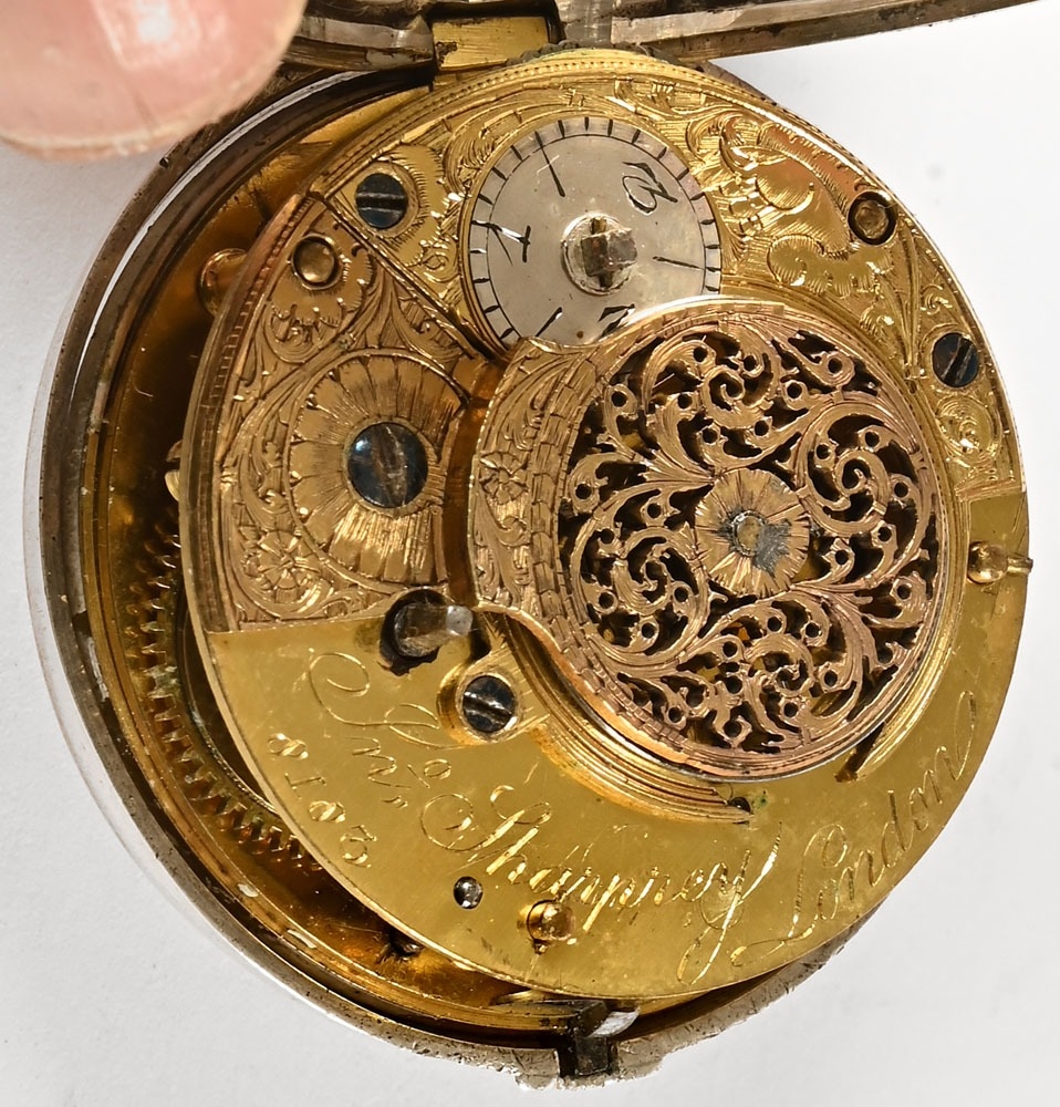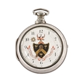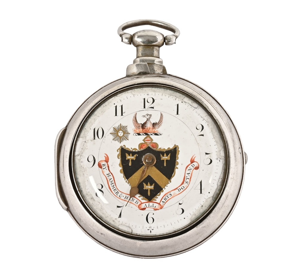 A Masonic pair cased pocket watch, the enamelled dial decorated with "The Worshipful Company of Blacksmiths", one of the London Livery Companies with the motto "By Hammer and Hand All Arts Do Stand", the movement marked Sharprey London, the inner and outer silver cases possibly 1812 for Samuel Atkins, the case containing three watch papers for J Sermin Sheffield and others.