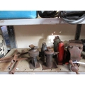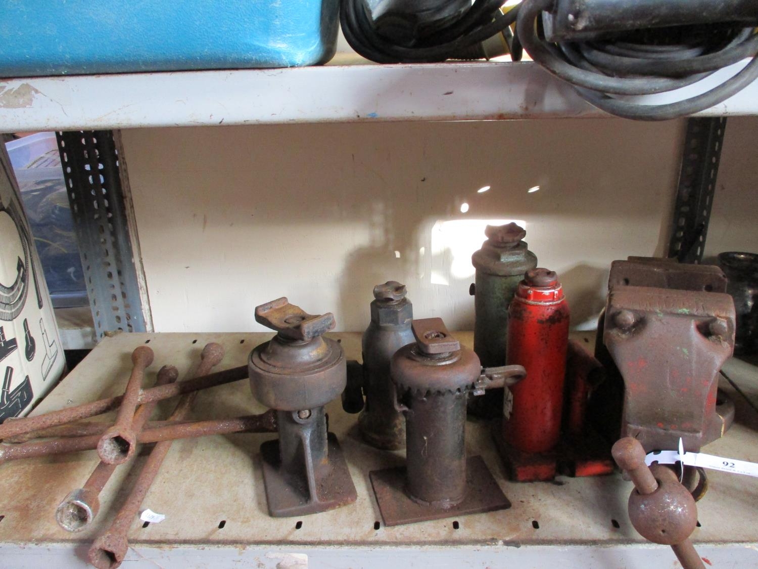Five vintage bottle jacks, wheel braces and a large vice