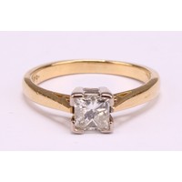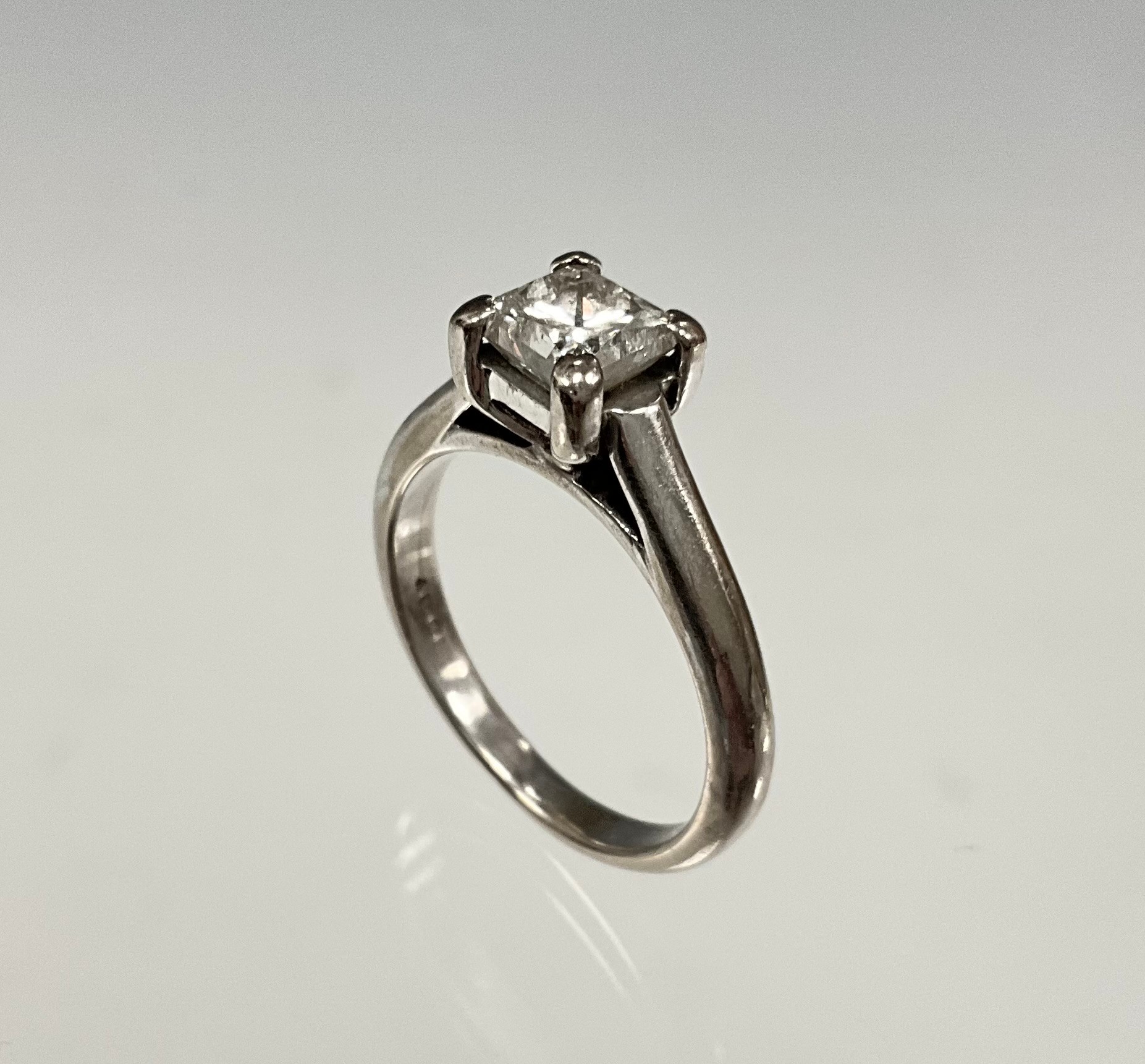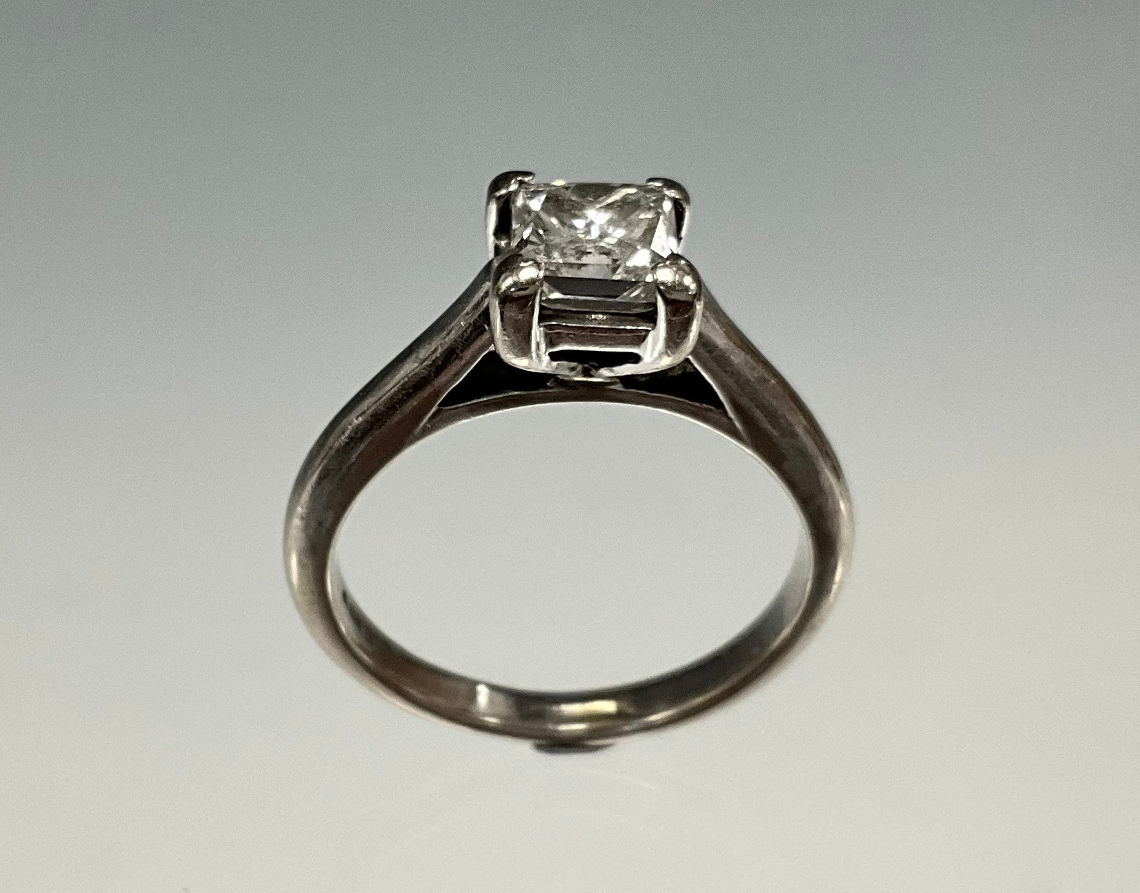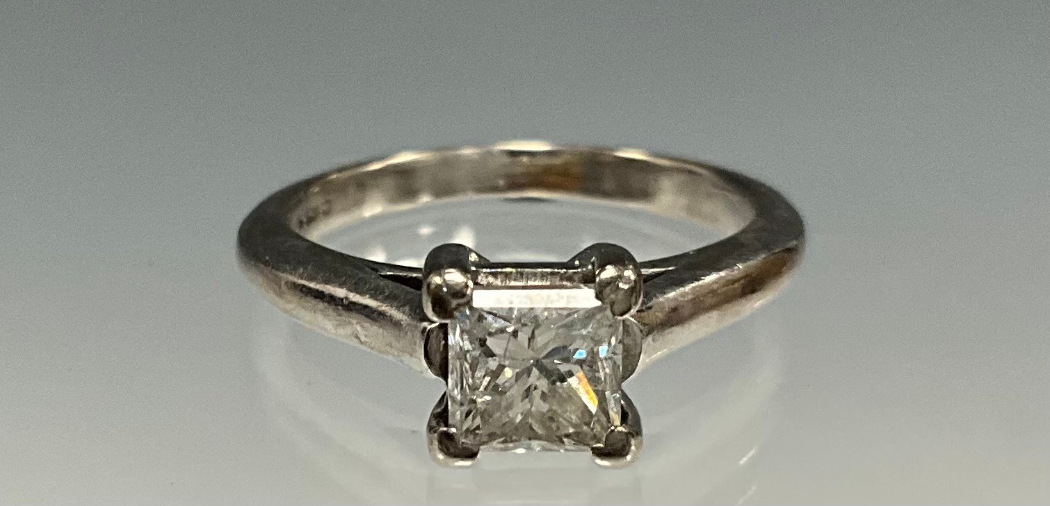 An 18ct white gold princess cut solitaire diamond ring, set with an approx. 0.50ct 1/2 carat princess cut diamond, diamond colour approx. G/H, diamond clarity approx. SI2, stamped "750", size K, approx. 4g gross