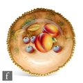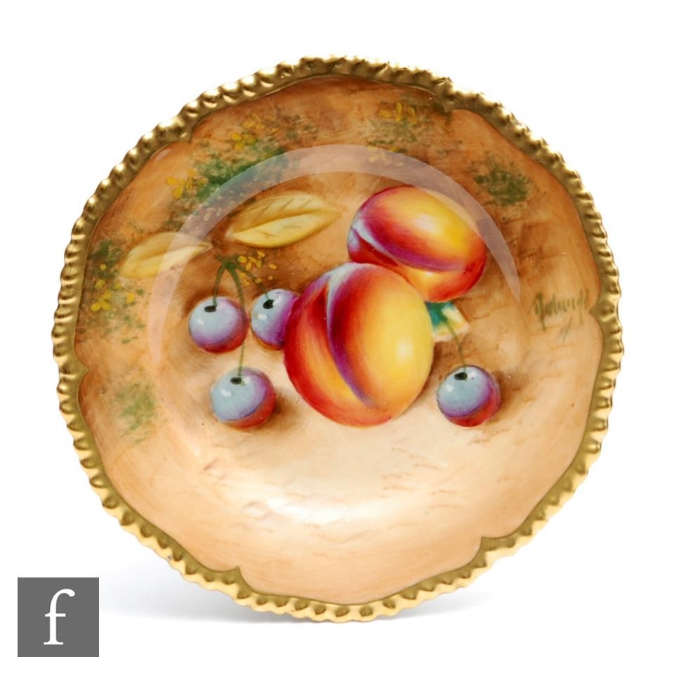 A small Royal Worcester Fallen Fruits side plate decorated by Rolands (or Roberts) with hand painted peaches and black cherries, signed, black printed mark, diameter 15cm.