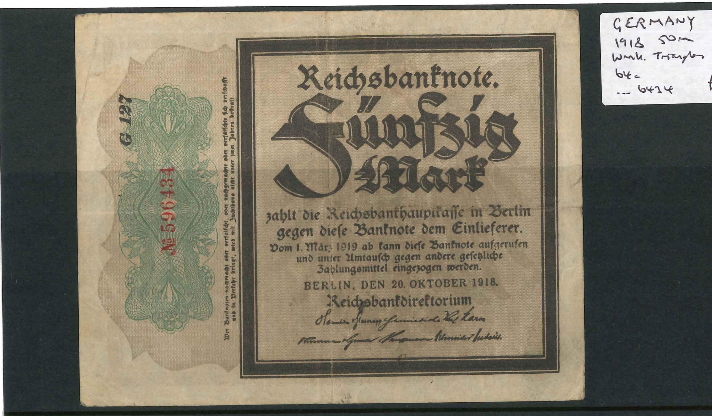 Banknotes; Germany; 1918 50m with wmk. Triangles, F+, Krause 64c.