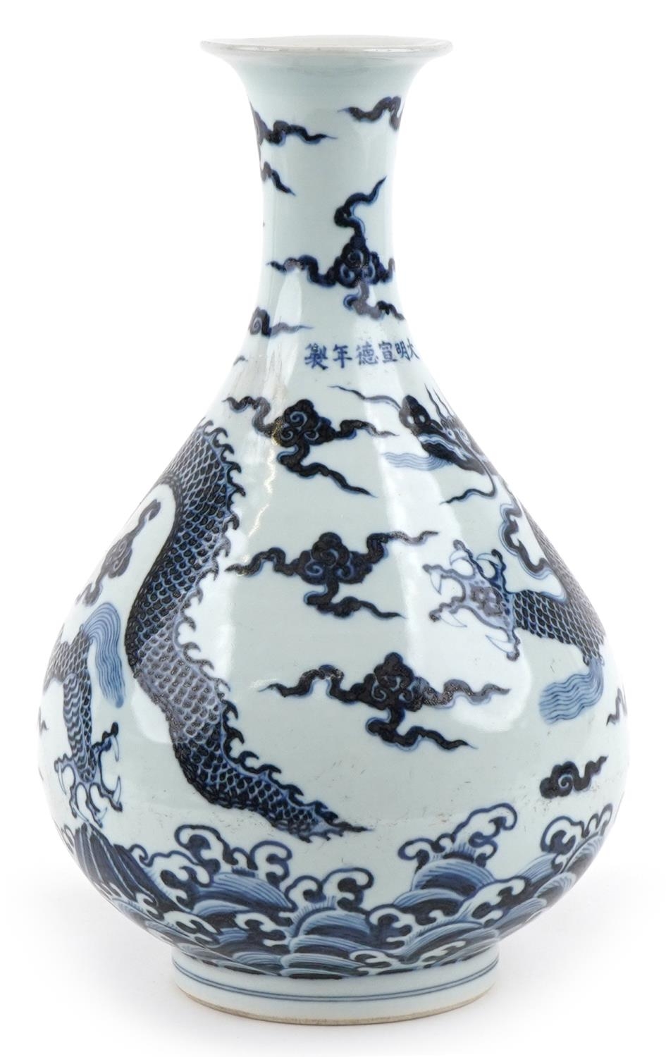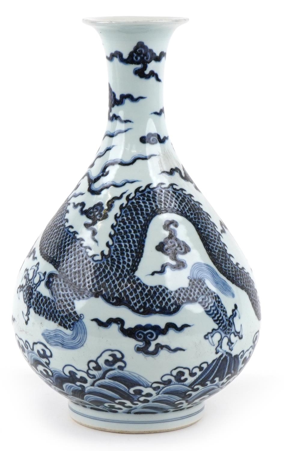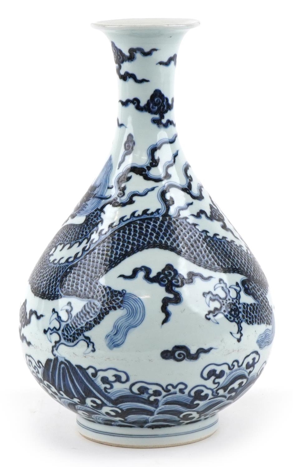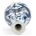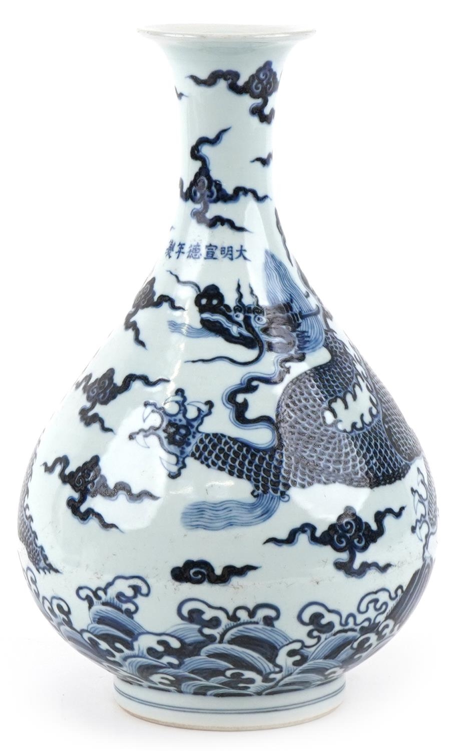 A Chinese blue and white porcelain baluster vase, hand painted with a dragon, clouds and sea, six figure character marks to the side, 34cm high.